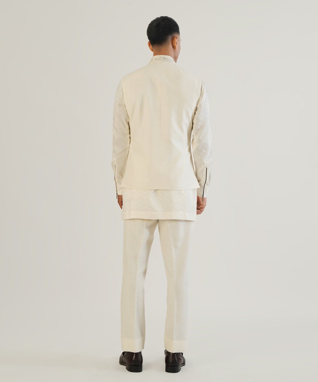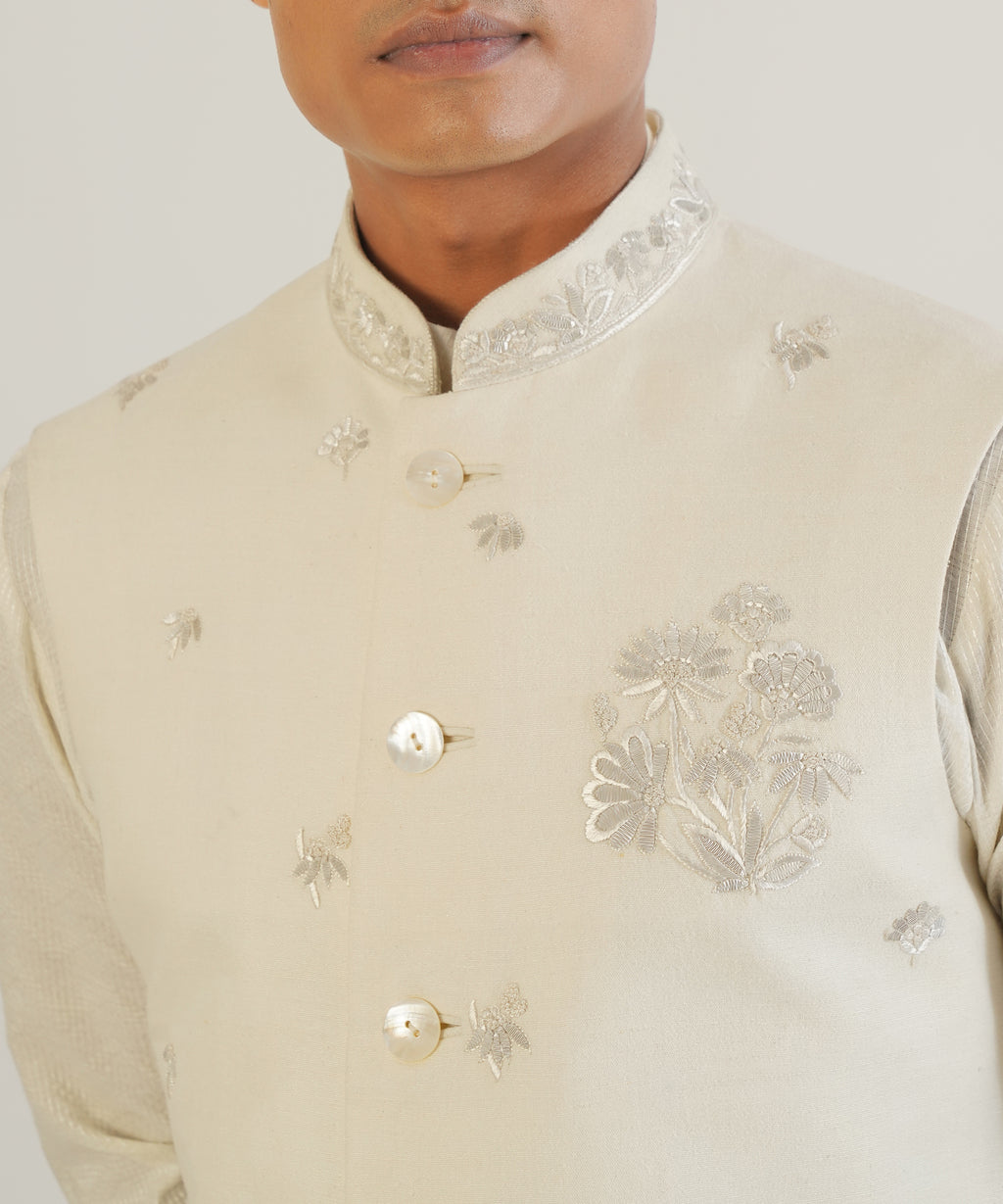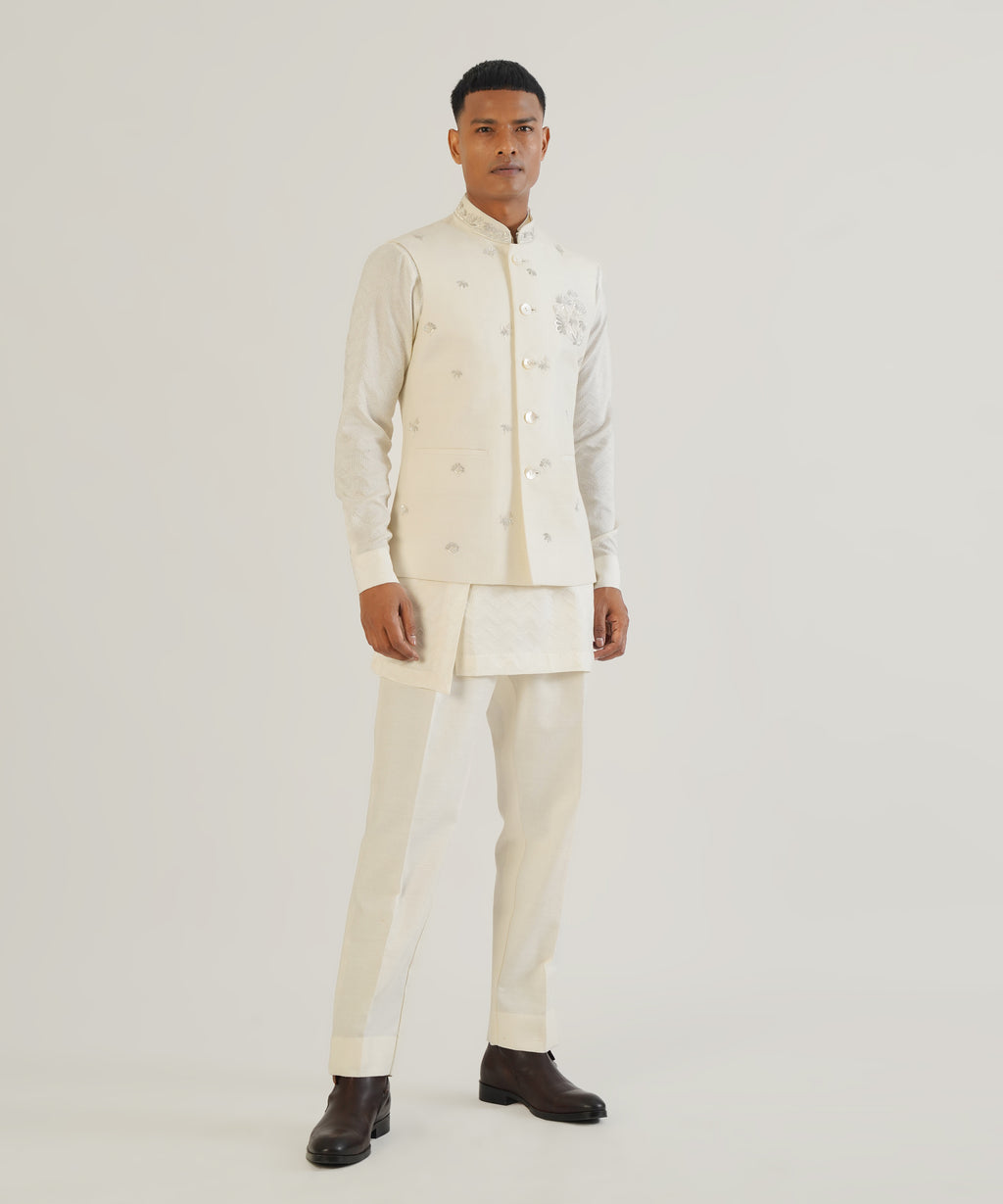 Silk Jawahar Jacket with embroidered metallic floral motifs and collar.