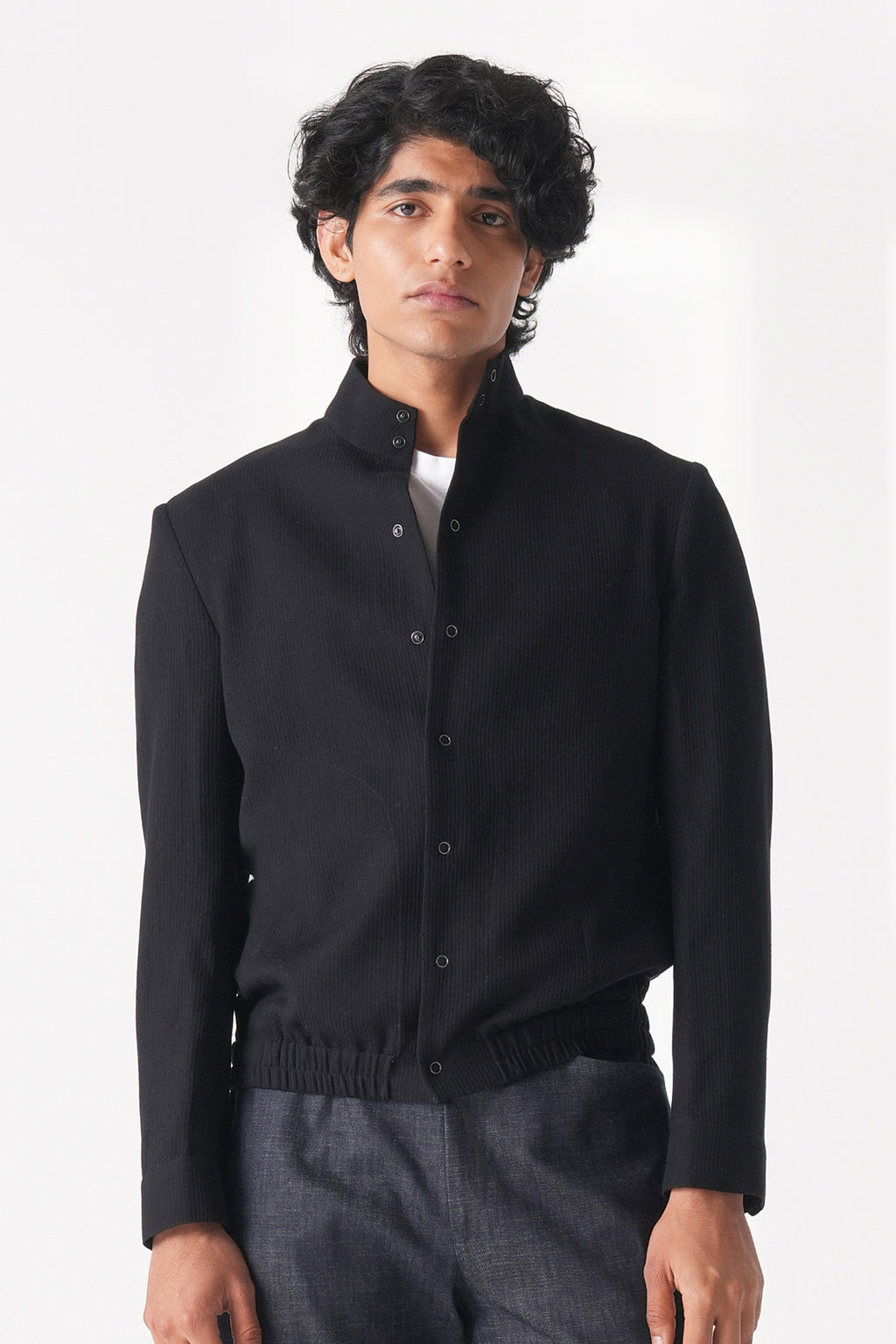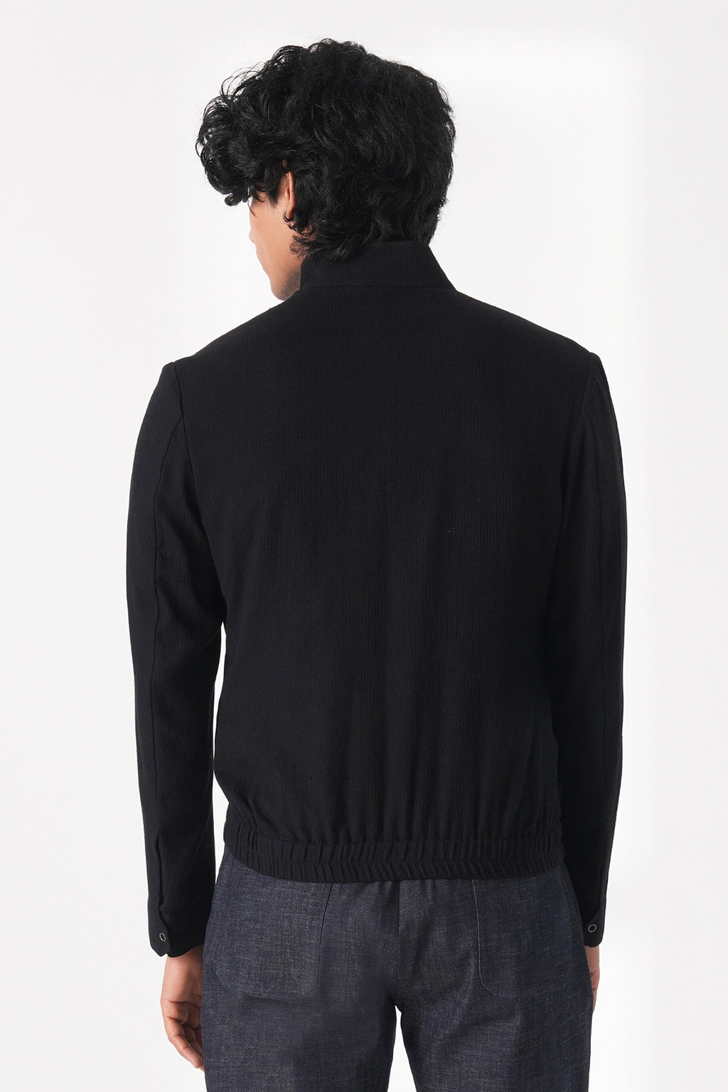 A sleek stand-collar jacket in handloom cotton with a clean buttoned front and minimal detailing at the hem and pocket for a refined yet effortless everyday ensemble.