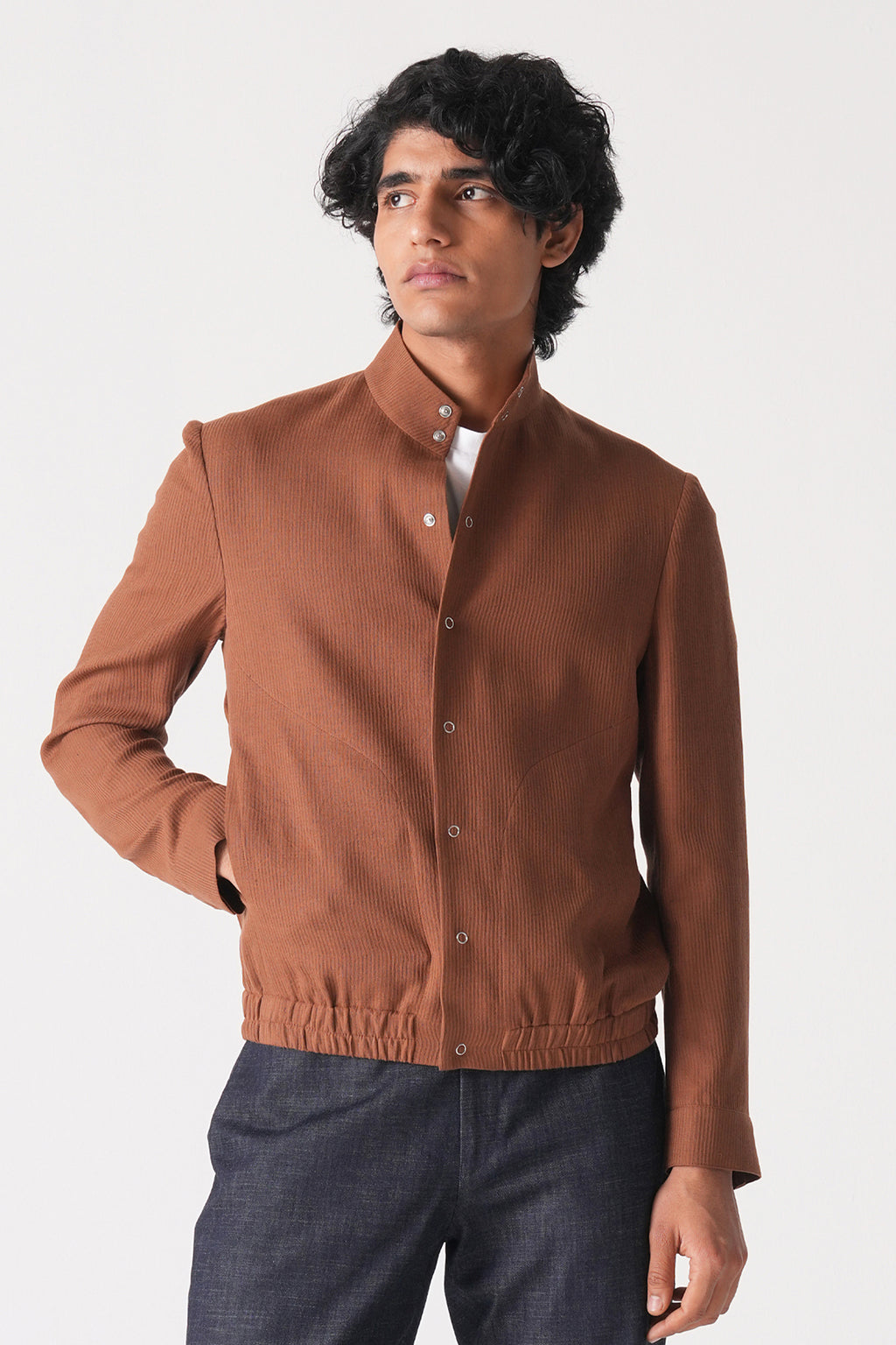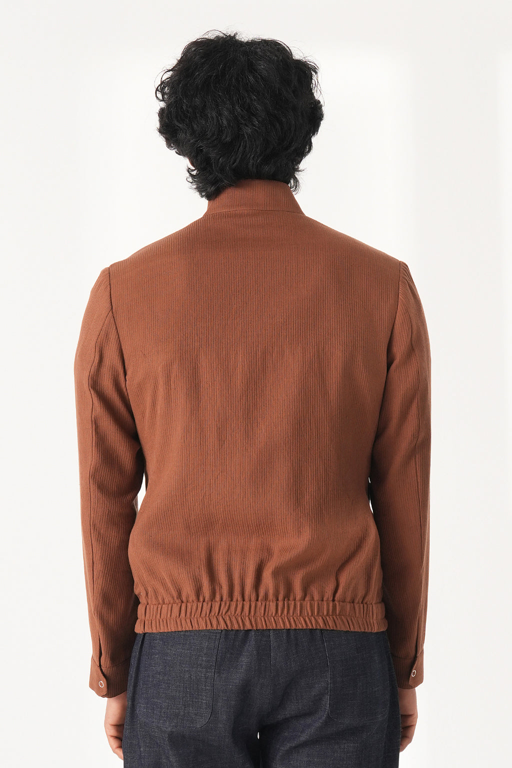 A sleek stand-collar jacket in handloom cotton with a clean buttoned front and minimal detailing at the hem and pocket for a refined yet effortless everyday ensemble.