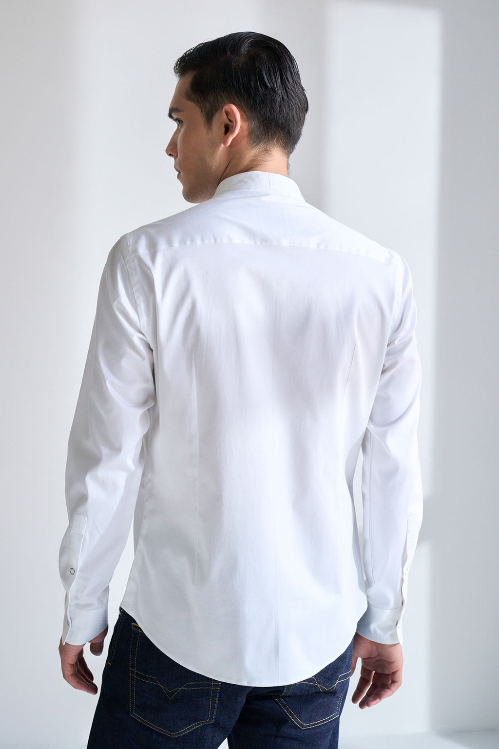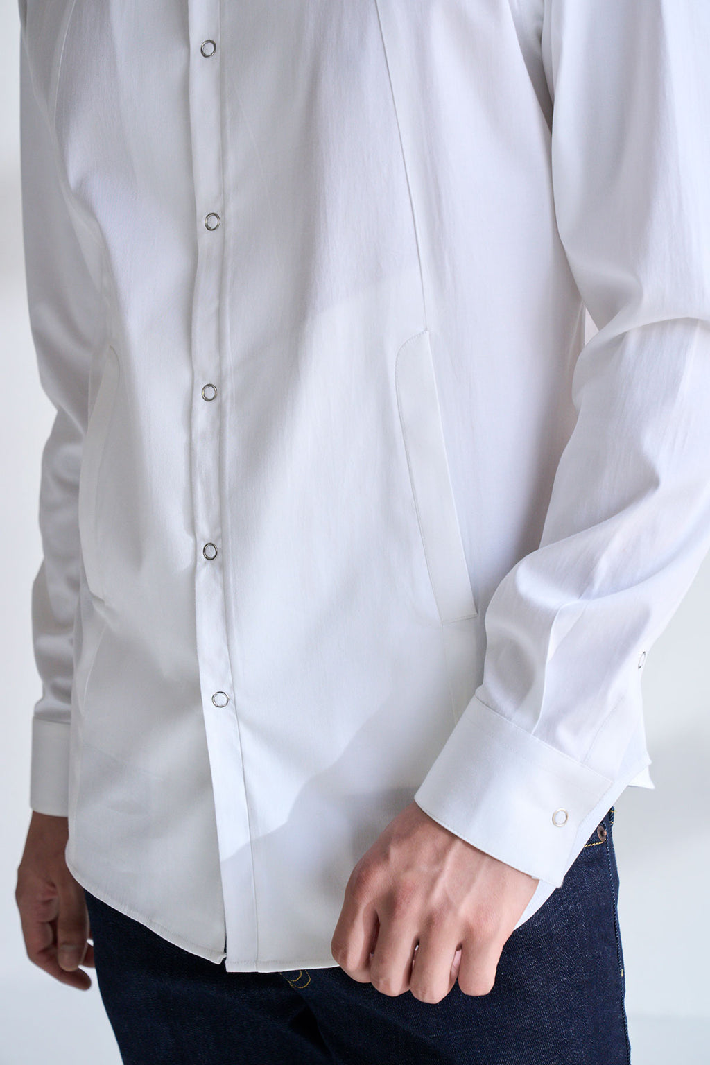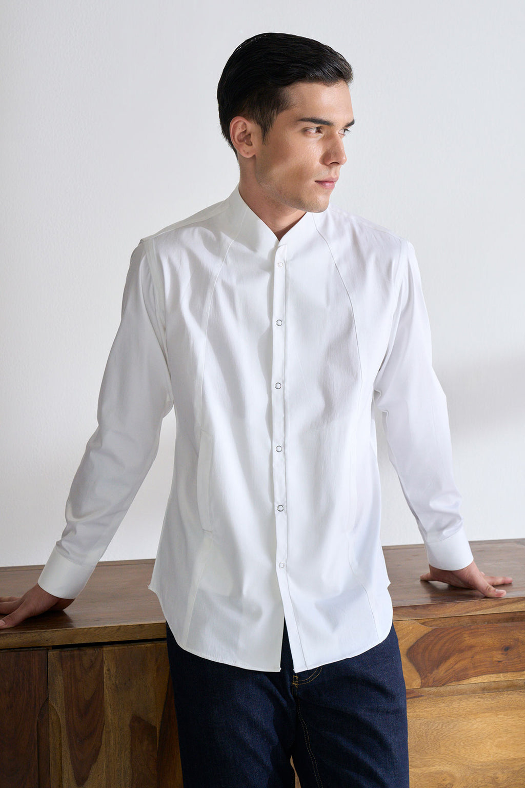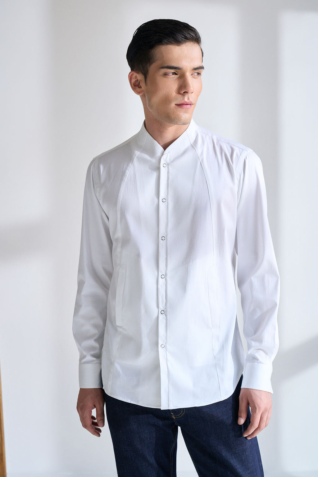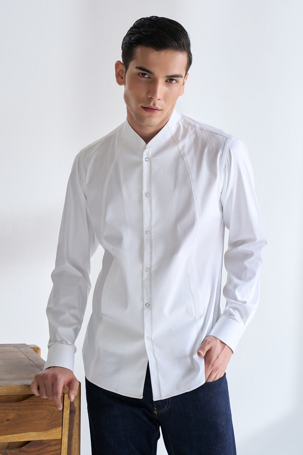 Classic And Clean Cut Shirt Tailored In Cotton Satin With High Neck Curved Collar And Snap Button Placket With Chique Panel Details.