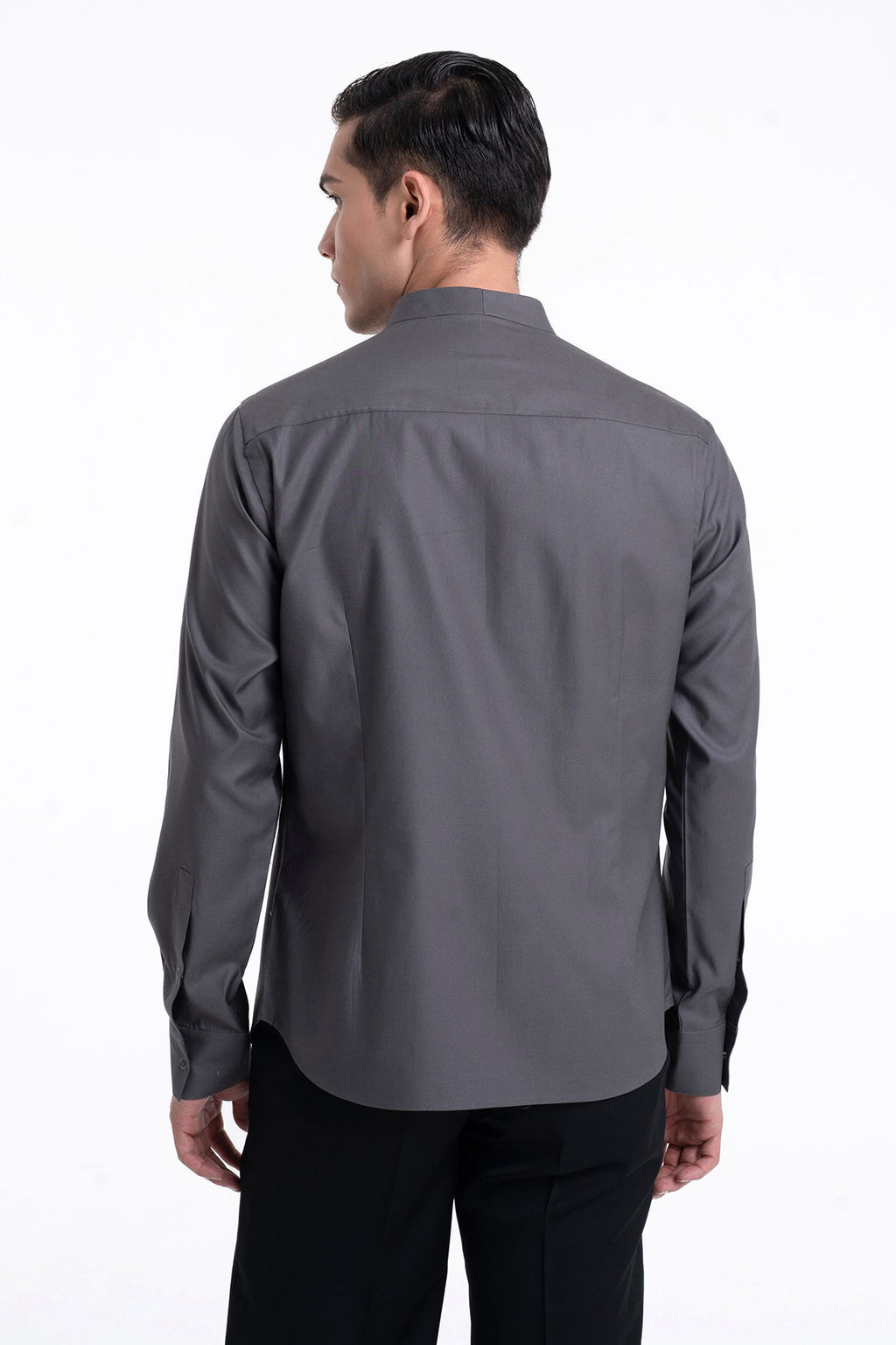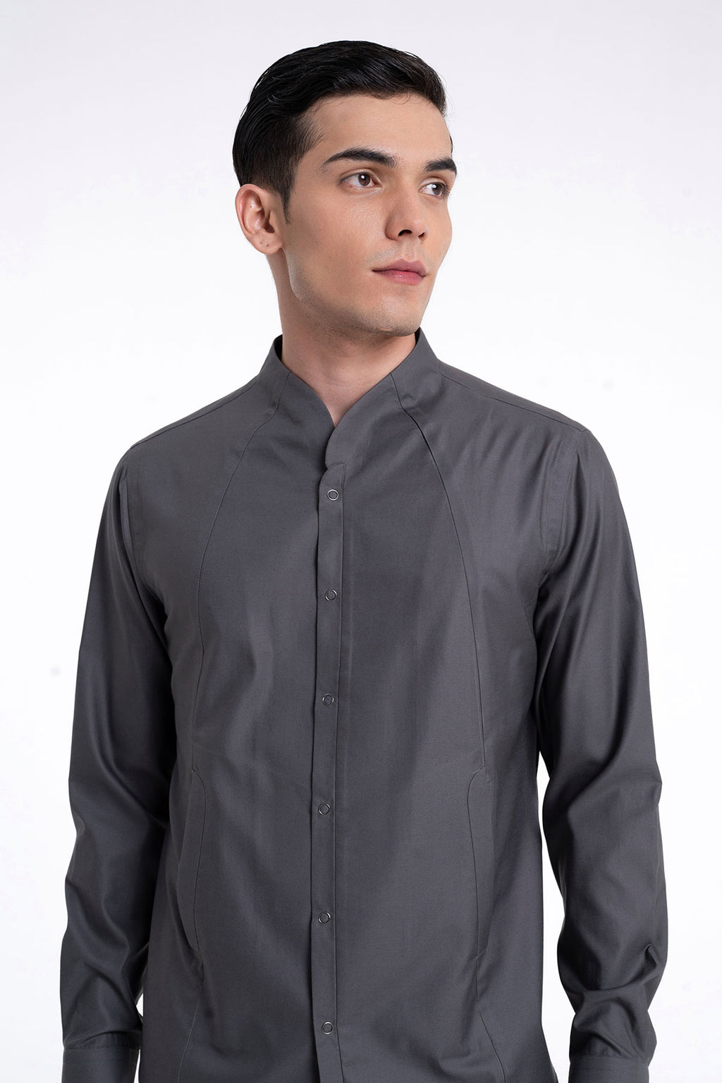Classic And Clean Cut Shirt Tailored In Cotton Satin With High Neck Curved Collar And Snap Button Placket With Chique Panel Details.