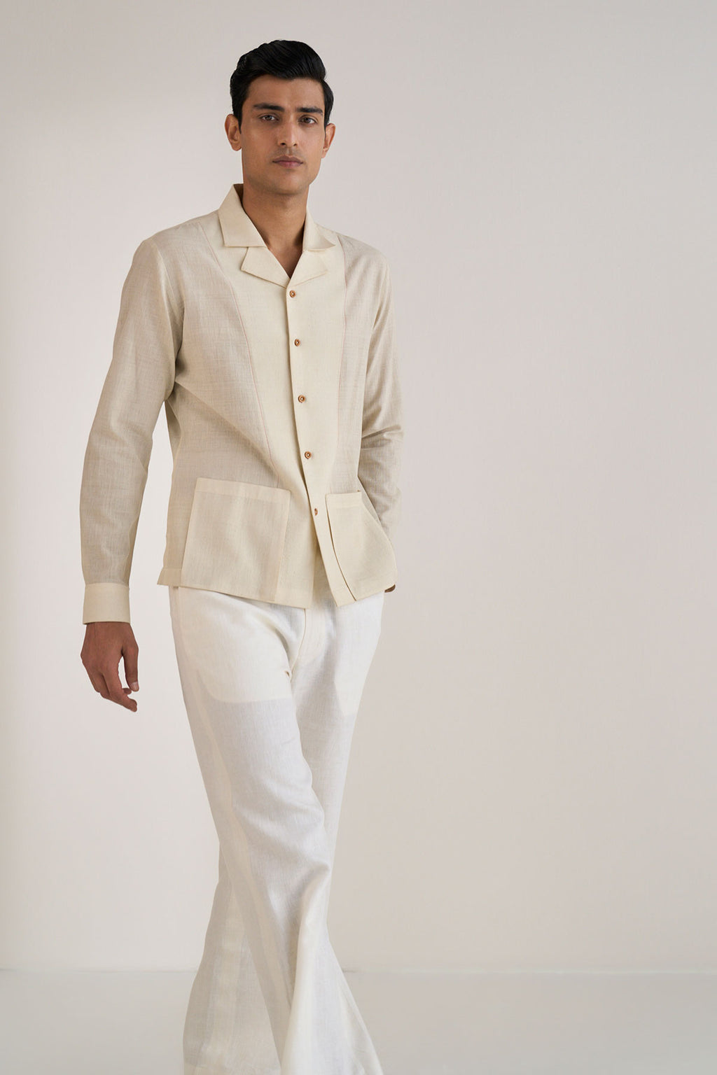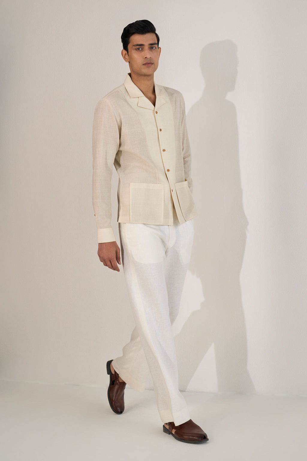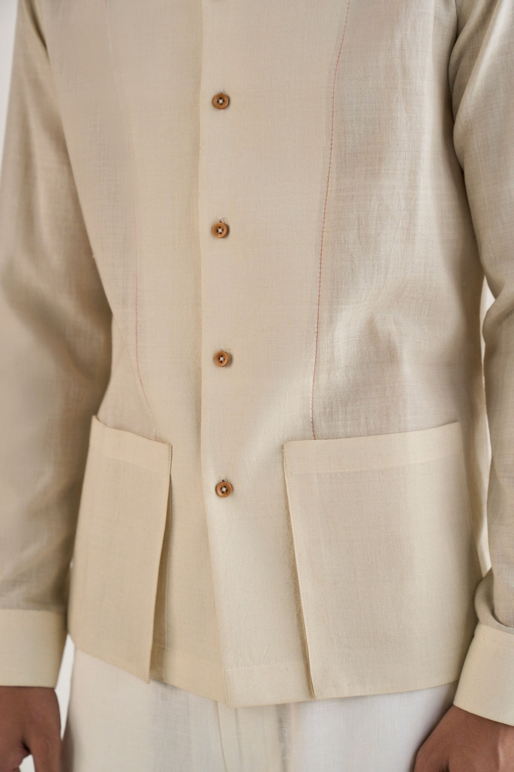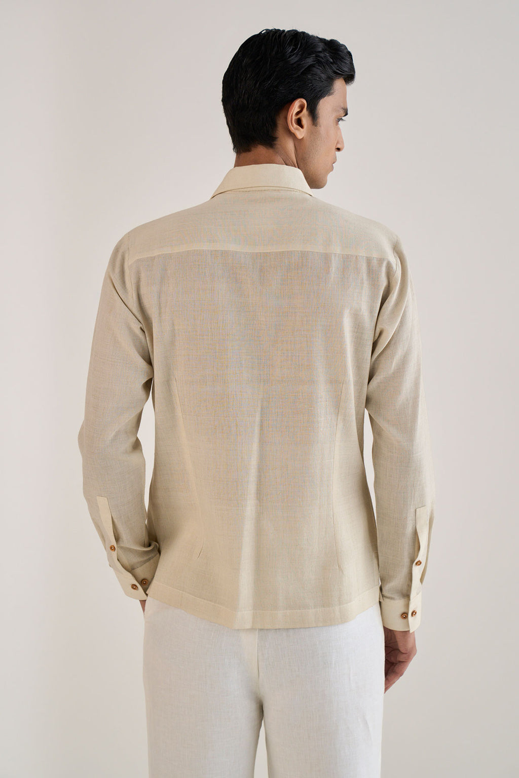 Effortlessly Chic Handloom Cotton Linen Shirt With Wooden Buttons And Patch Pockets, Blending Comfort With Understated Elegance.
