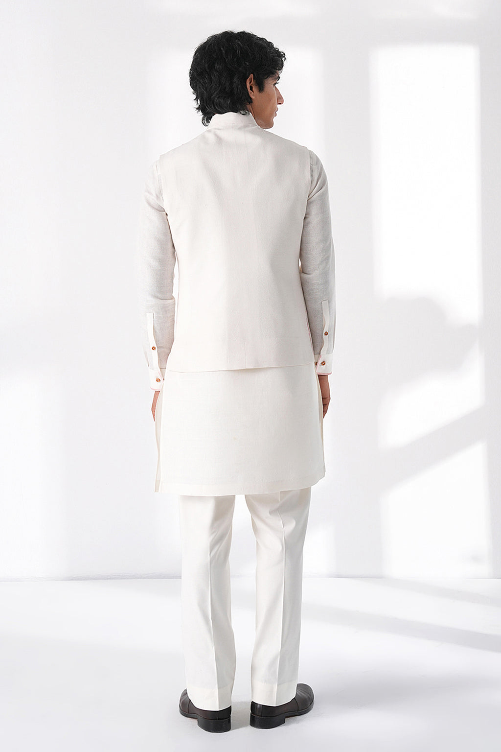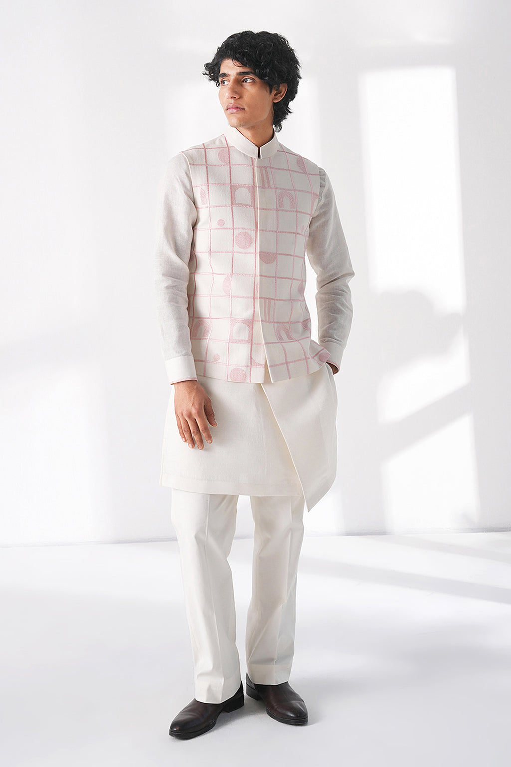 Contemporary Nehru jacket with concealed placket in premium silk fabric featuring thread embroidery with structured grid pattern with refined motif detailing giving a polished, modern statement look. It can be paired with matka silk kurta with thread detailing and drawstring straight fit trouser.
