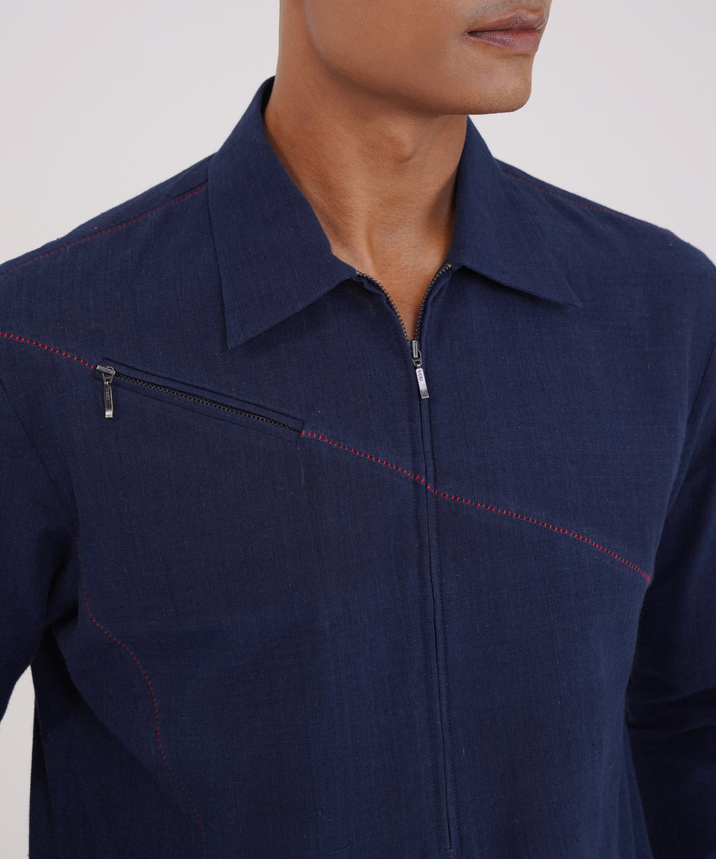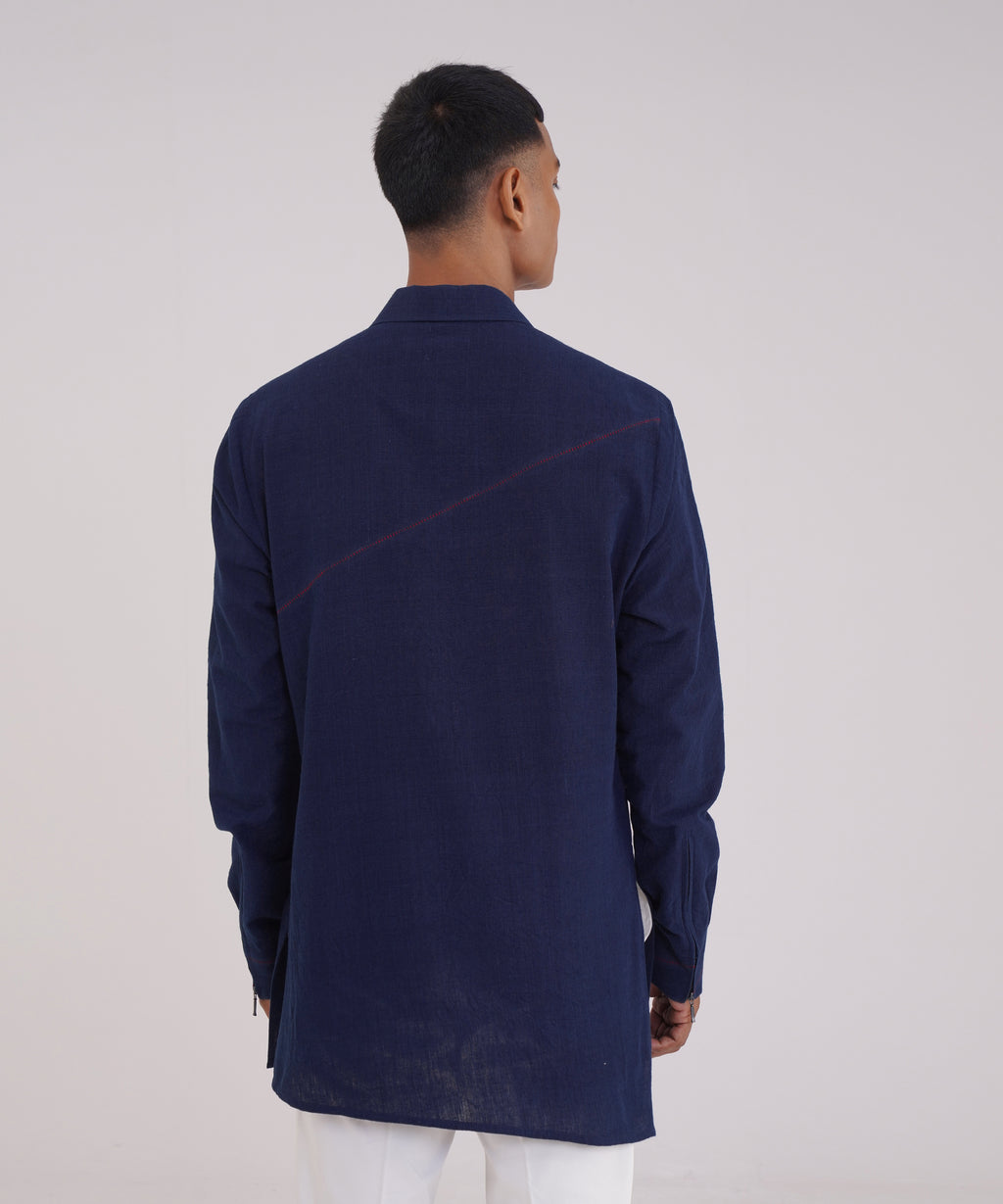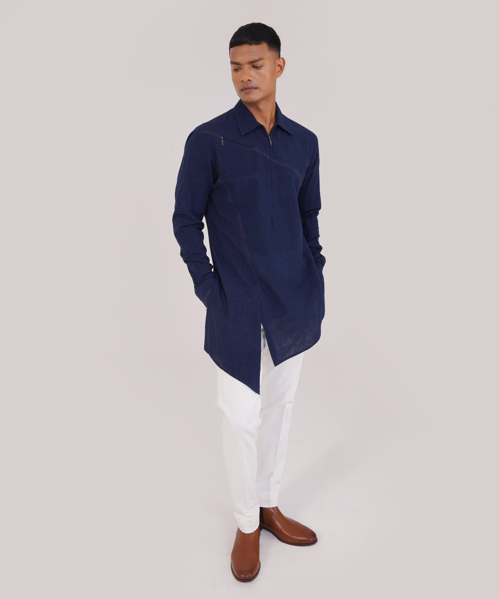 Handloom cotton short kurta with asymmetric hem, zipper placket and thread detailed design lines.
