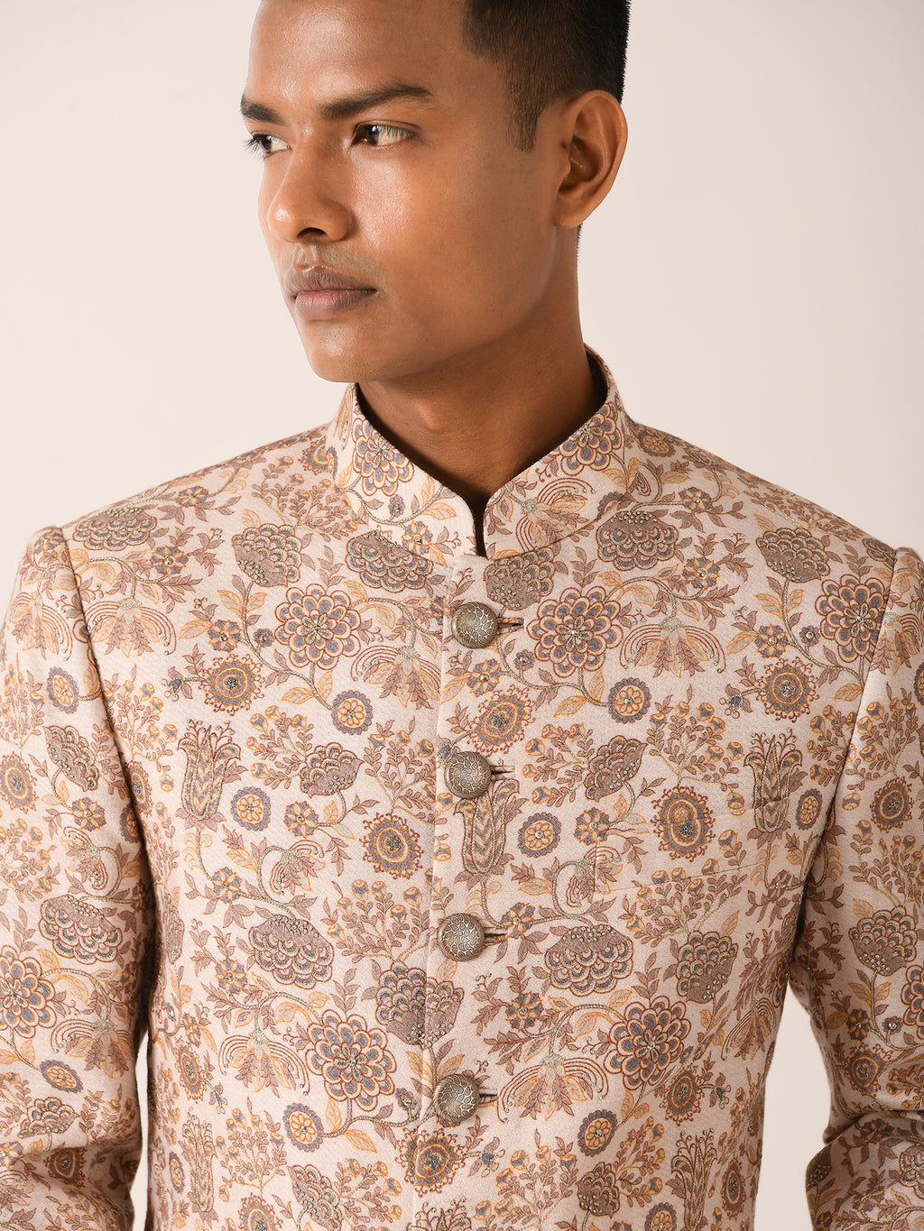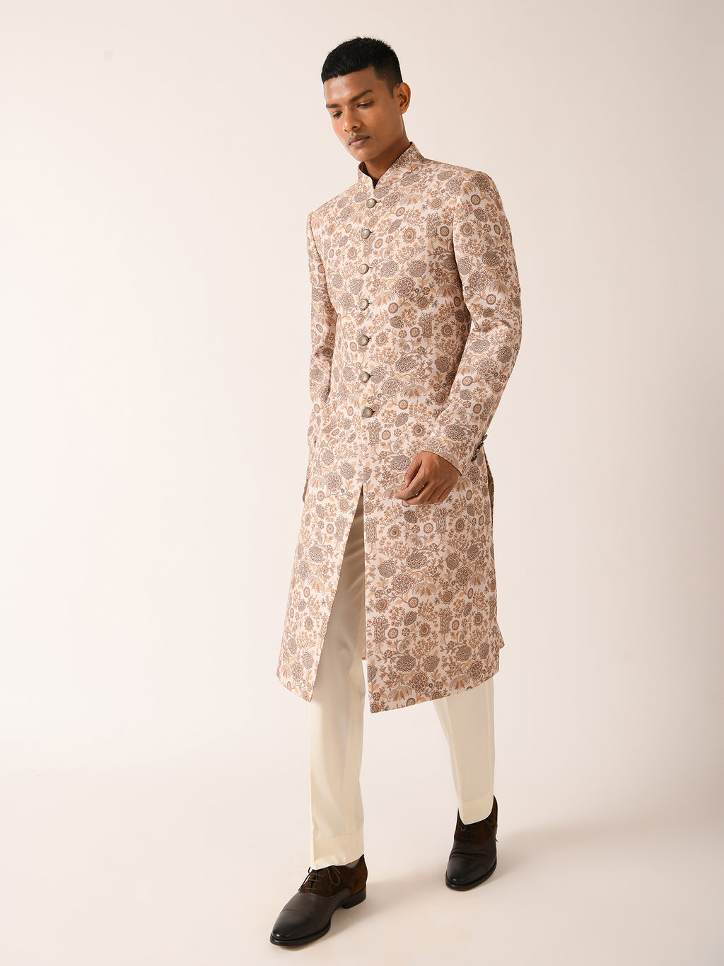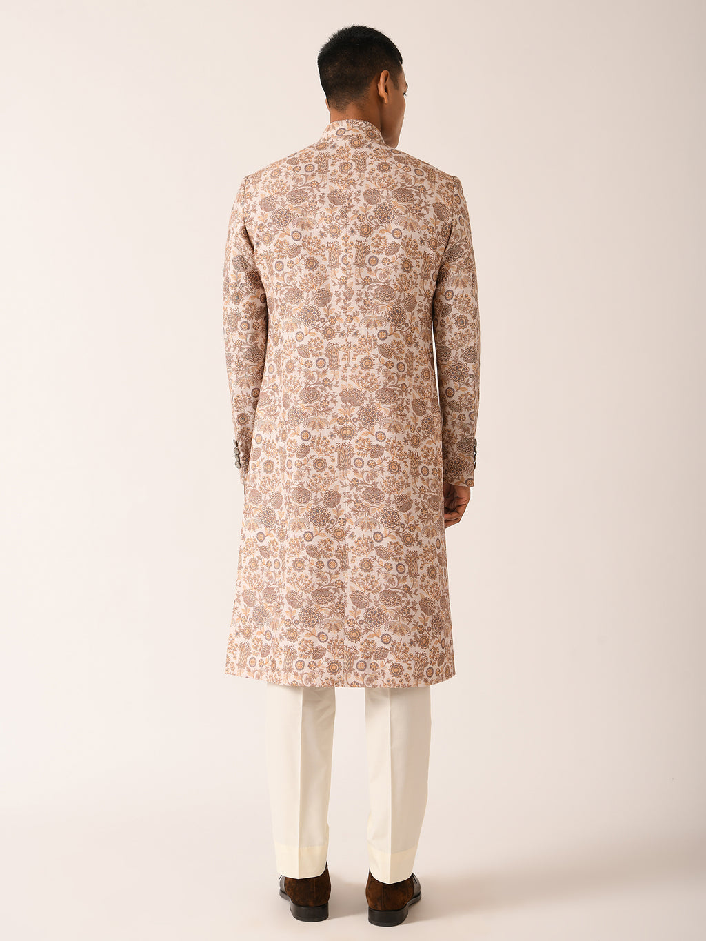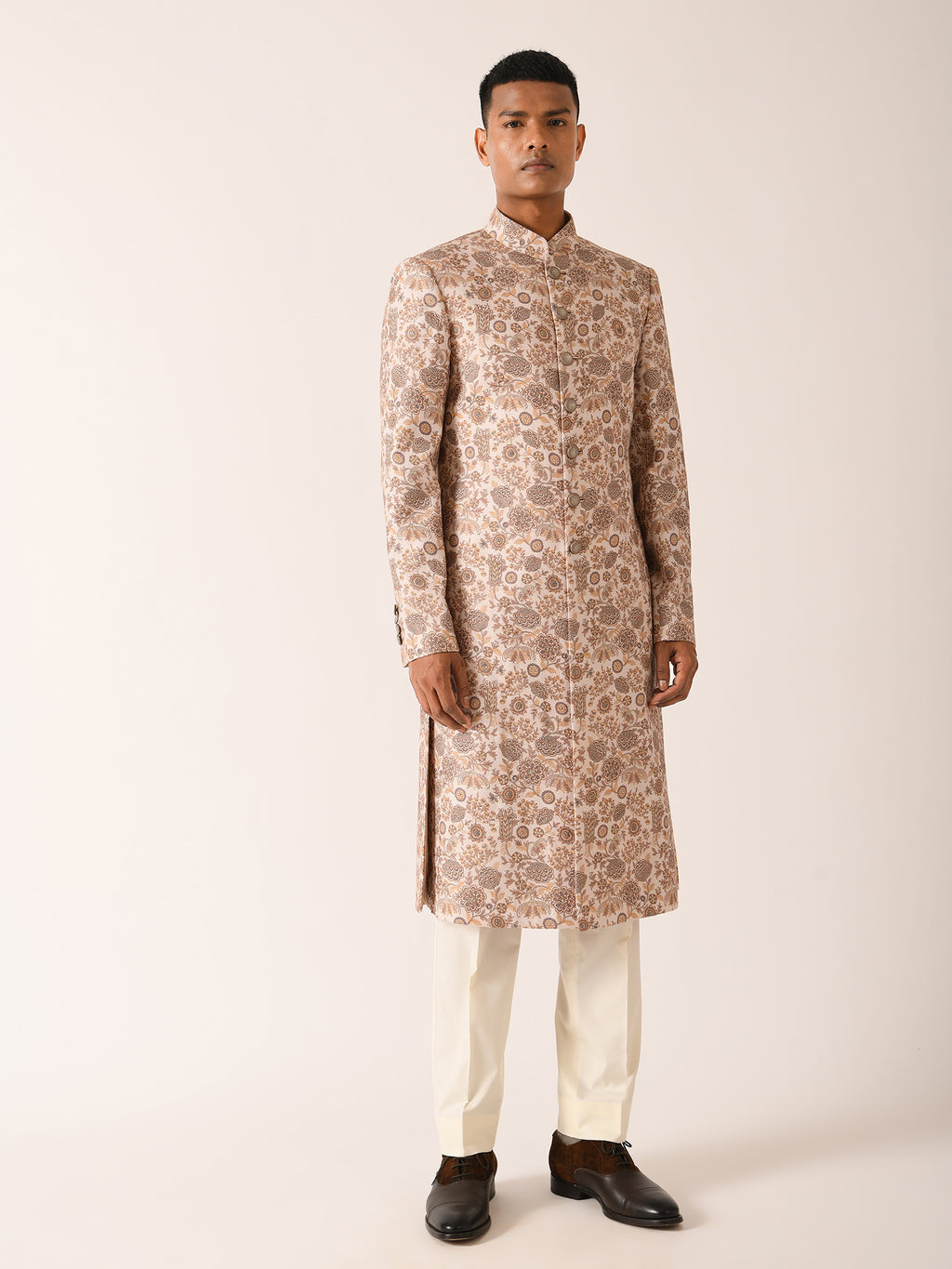 Classic Cut Printed Sherwani with Hand Embroidery in Textured Cotton Silk. It Can Be Paired with Pant Cut Pyjama