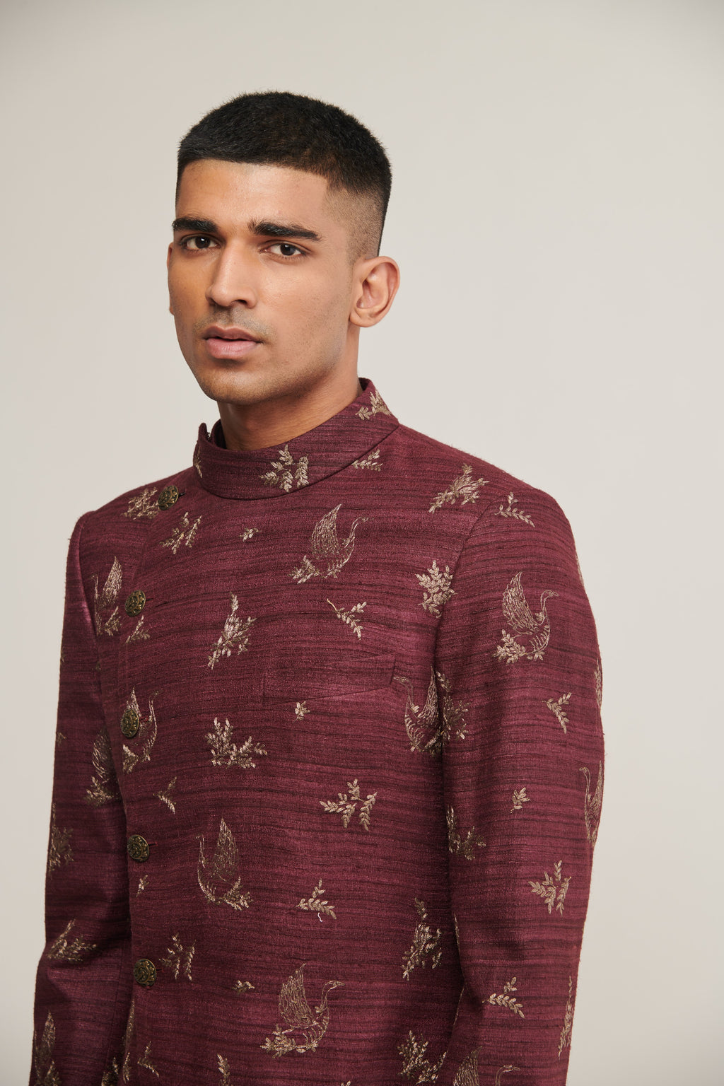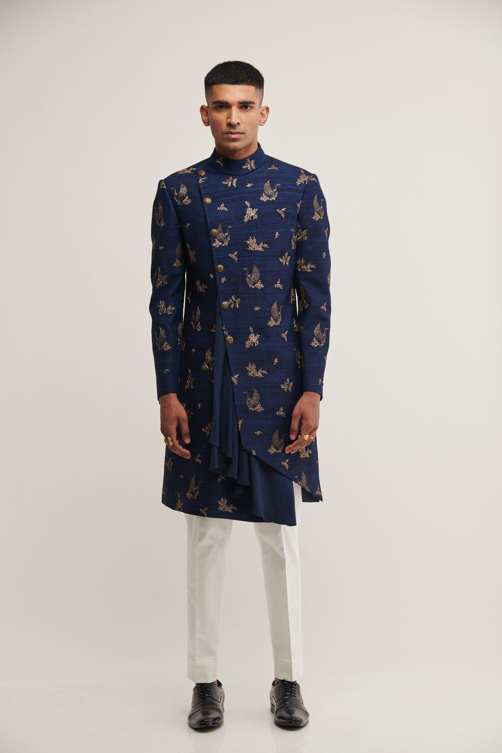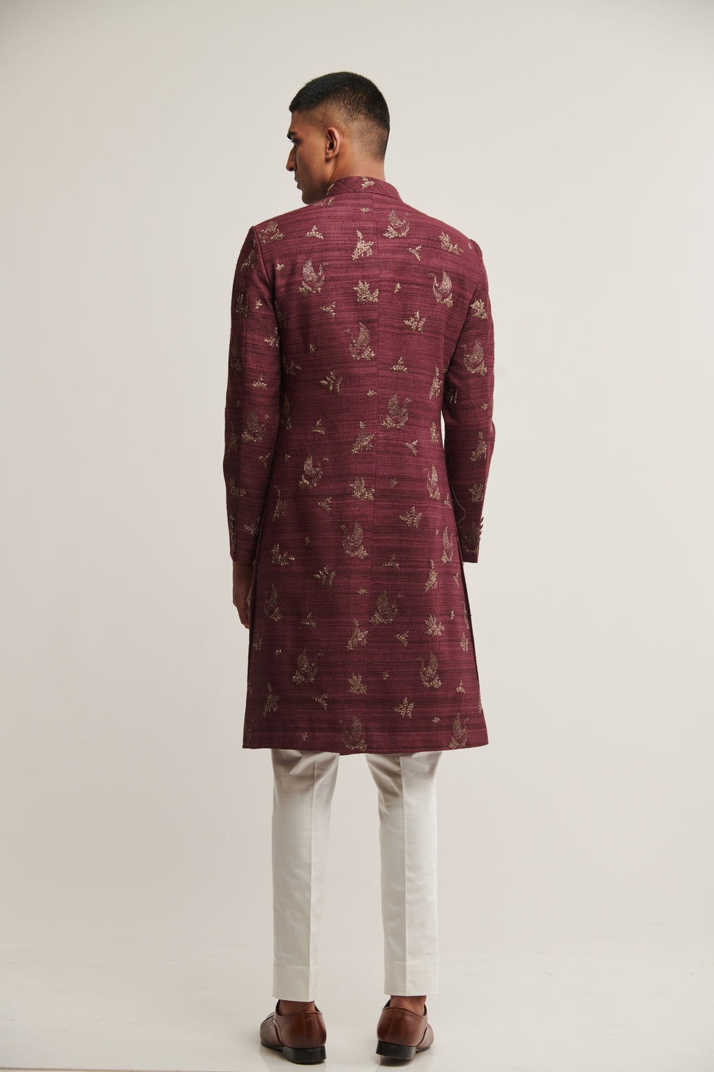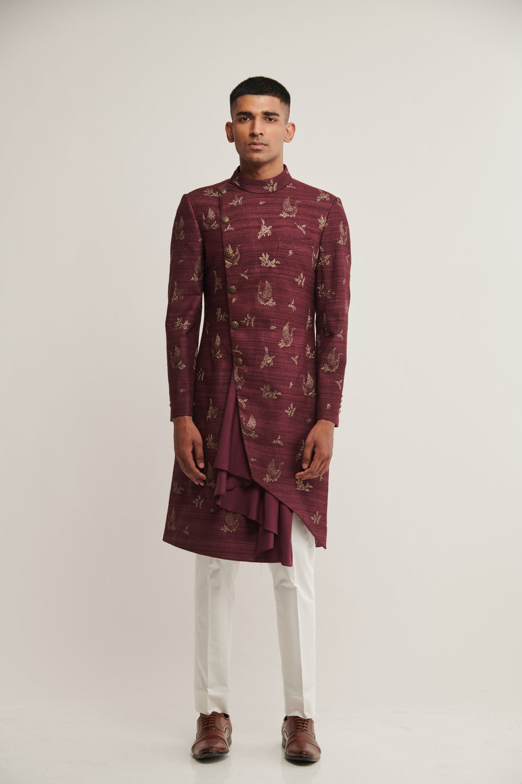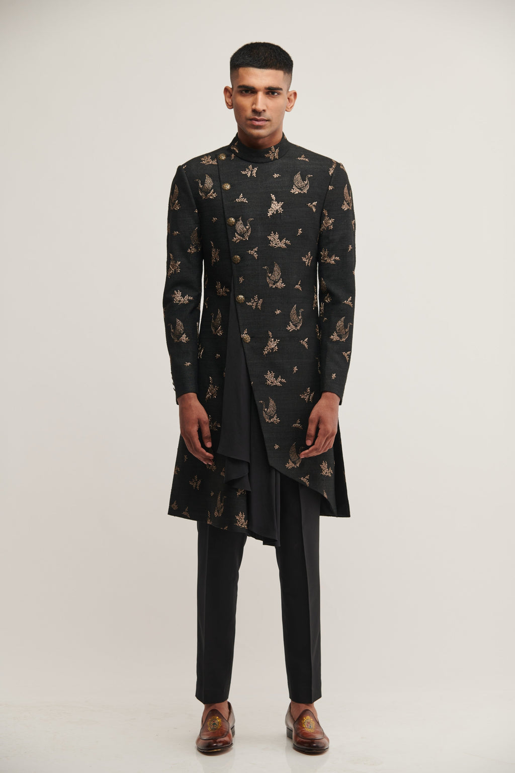 Hybrid Fully Embroidered Silk Sherwani Paired With Black Pant Style Pyjama.