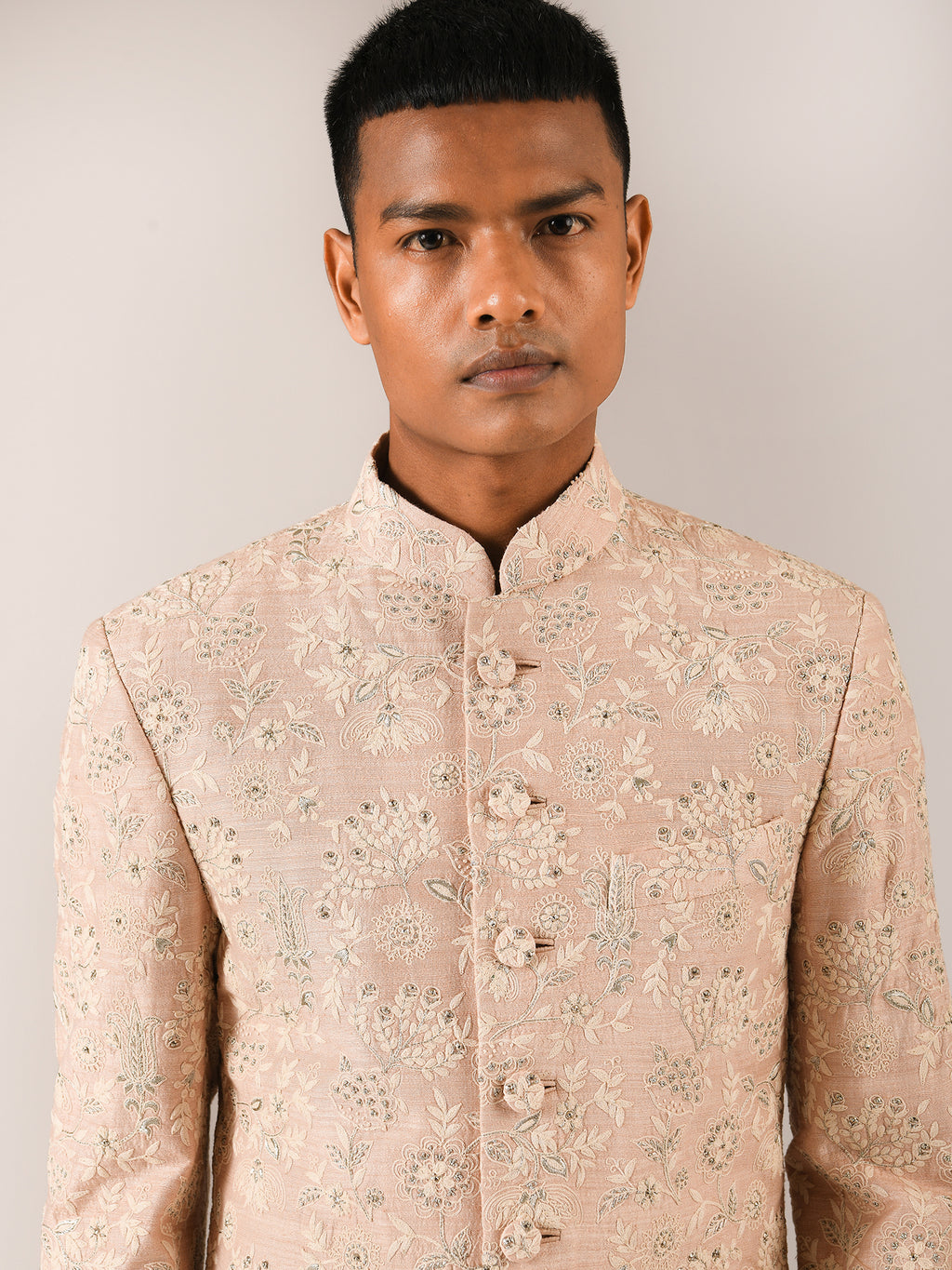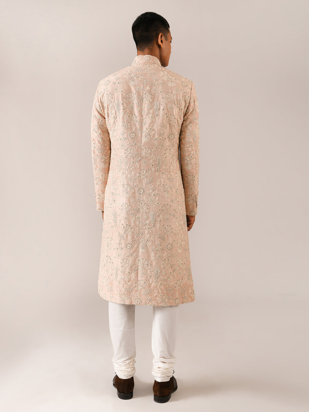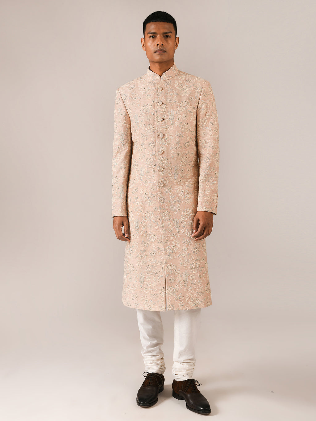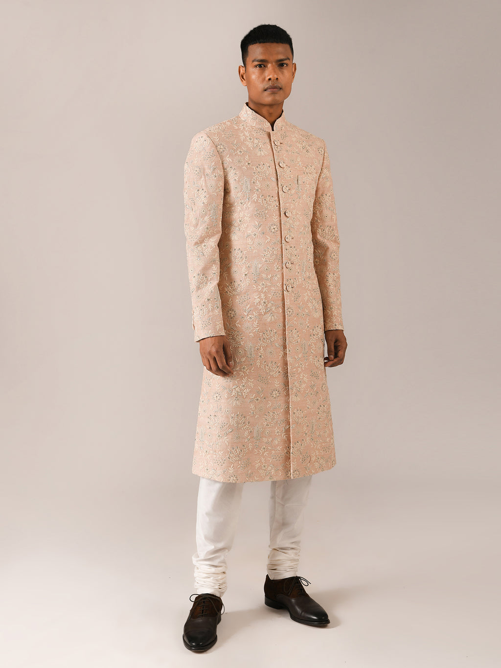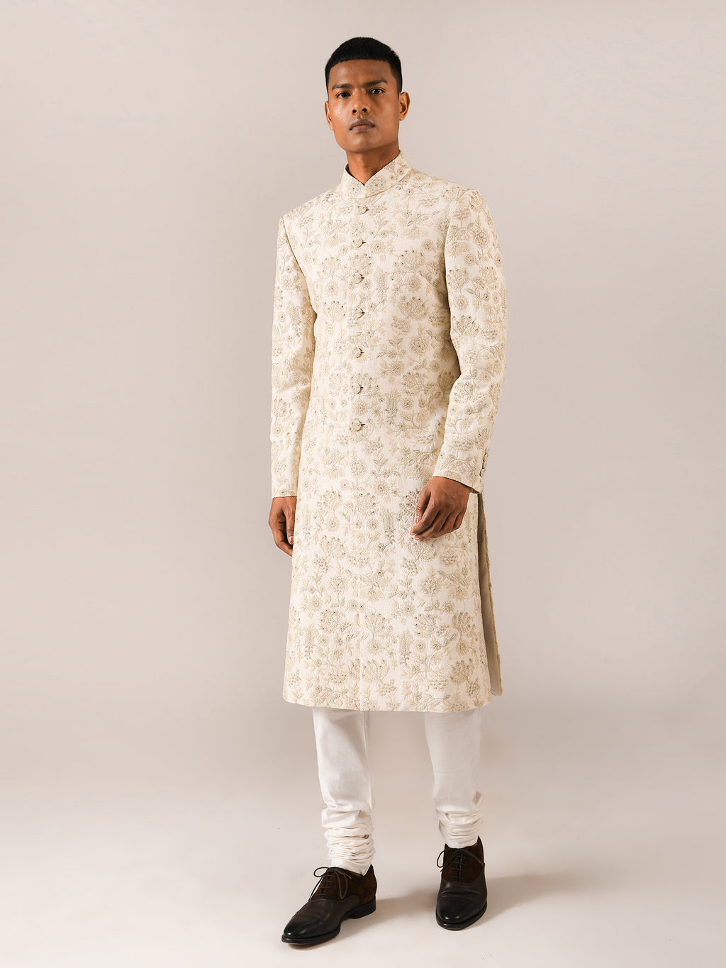 Classic Cut Embroidered Sherwani in Silk with Cream Churidar