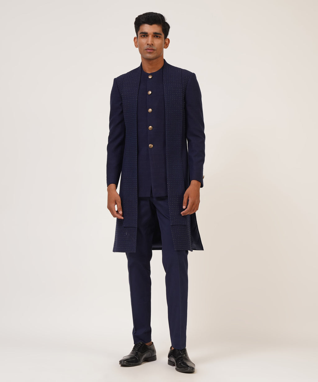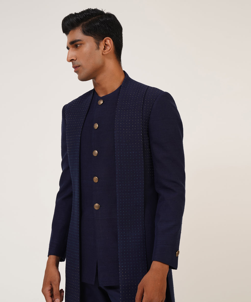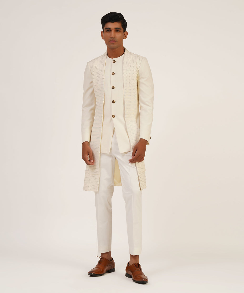 Silk Sherwani With French Knot And Metal Bead Embroidery With Different Hem Lengths.