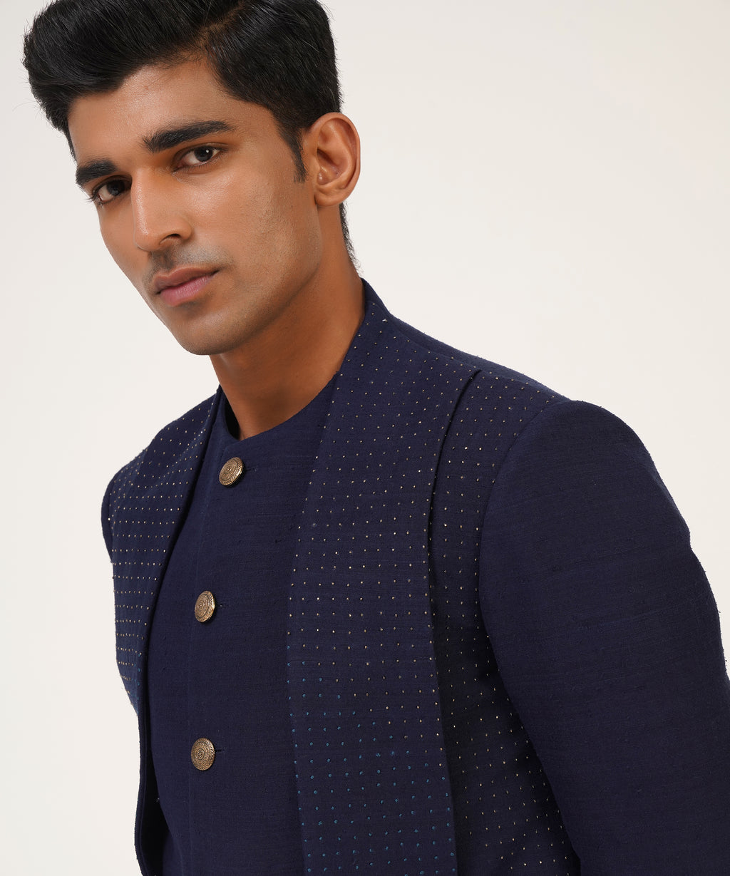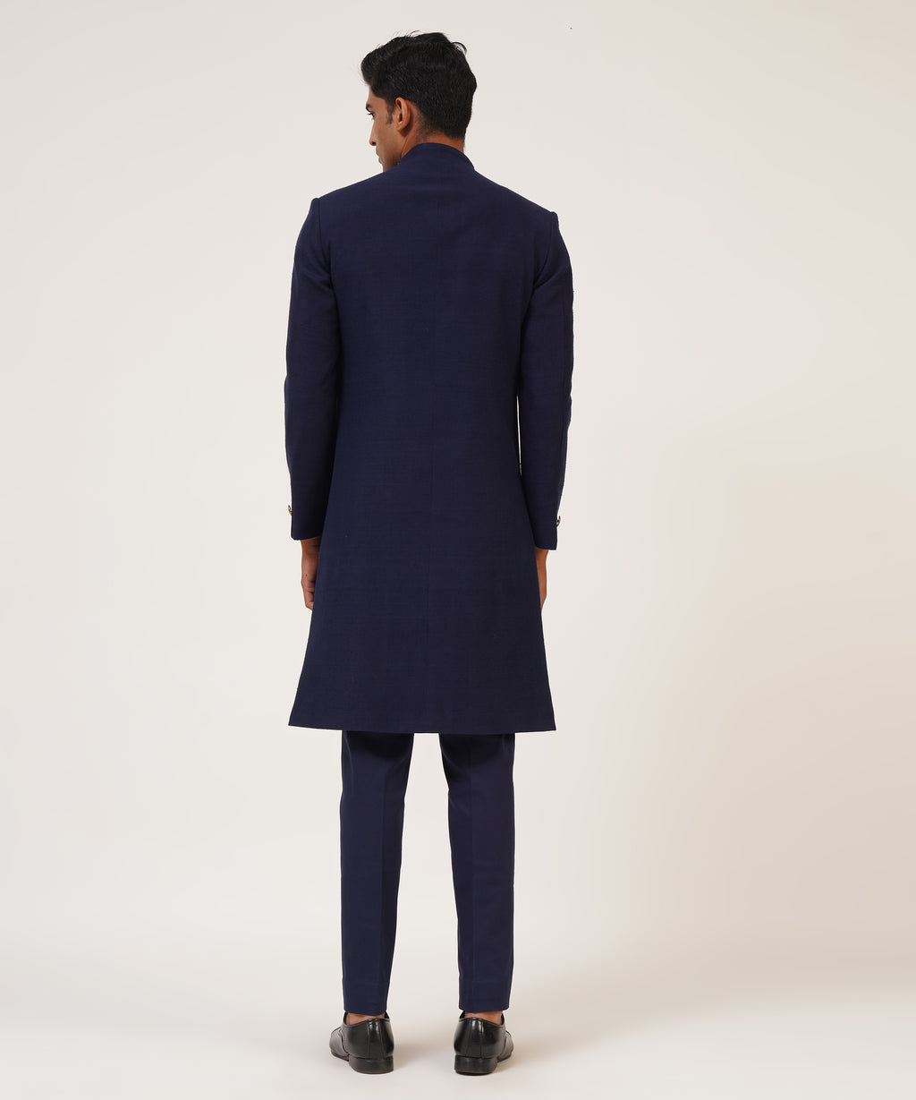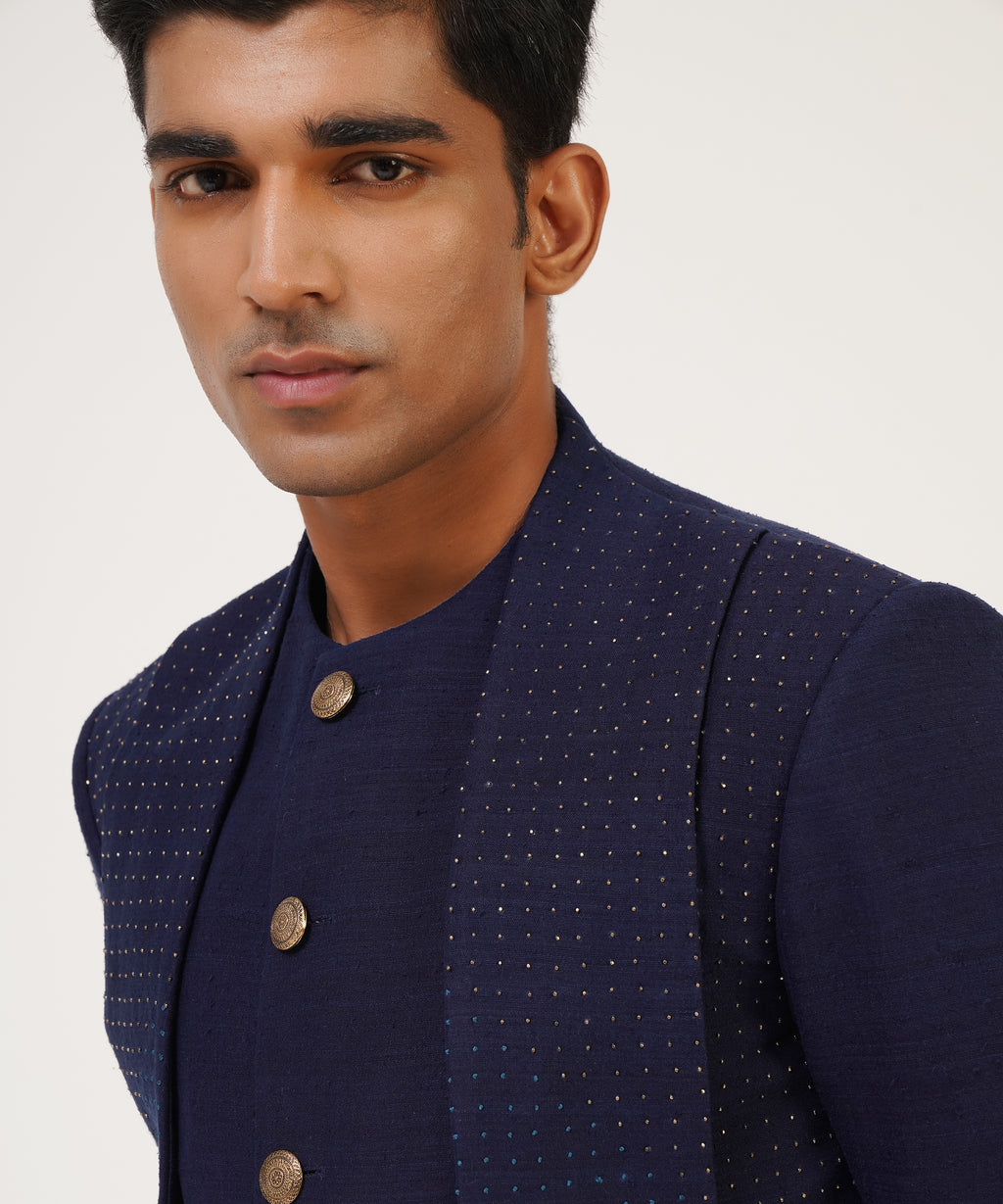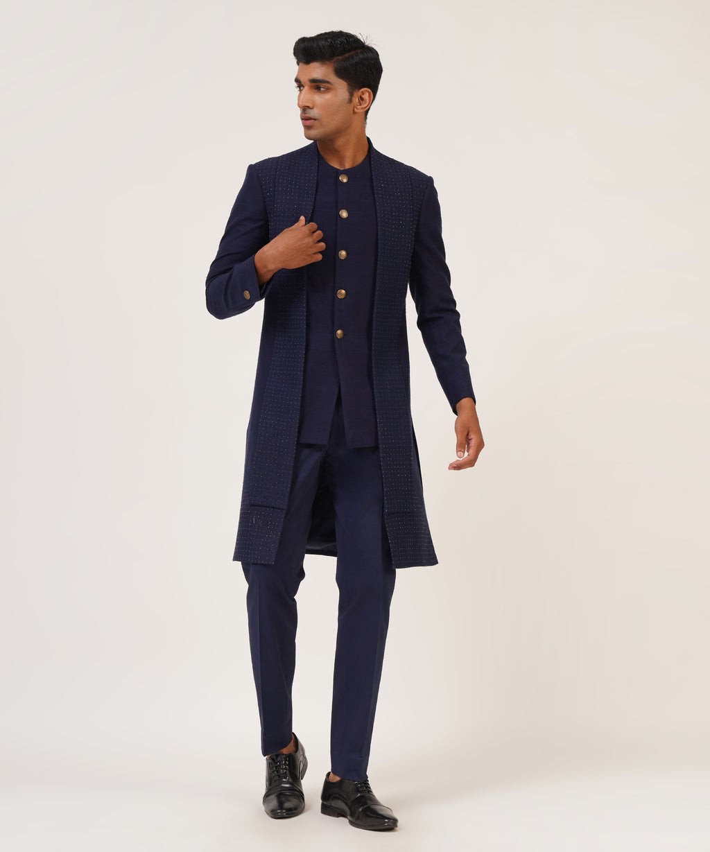 Silk Sherwani With French Knot And Metal Bead Embroidery With Different Hem Lengths.