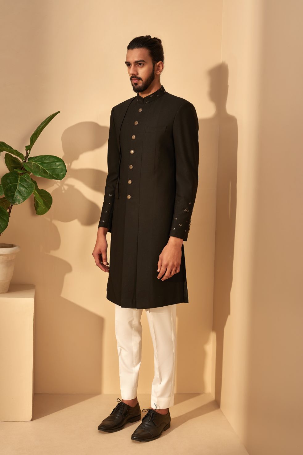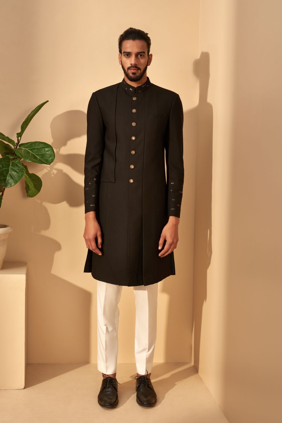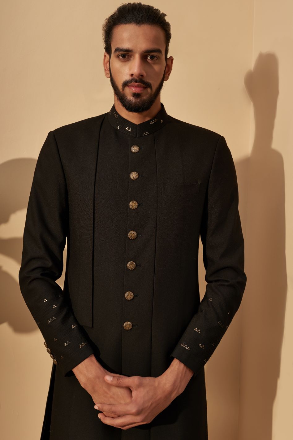 Black Color Multi-Panel Sherwani With Metal Embroidery On Collar And Cuff. It Can Be Paired With Pant Cut Pyjama