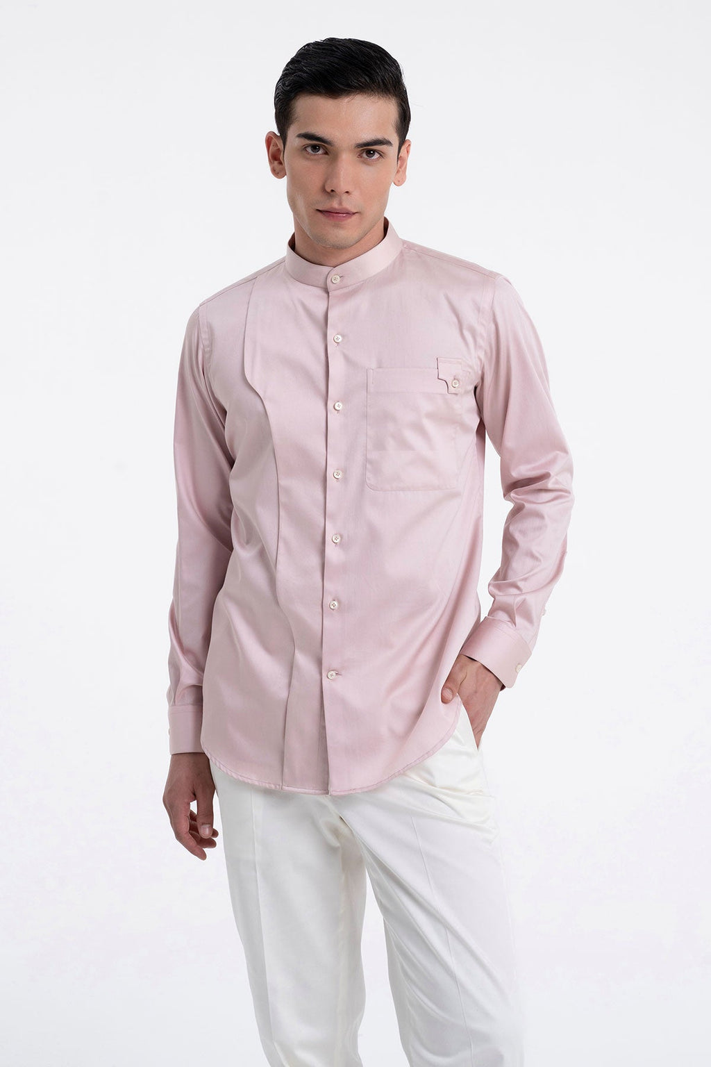 Elegant Cotton Satin Shirt With A Curved Panel On One Side And Patch Pocket With Minimal Detail On The Other Prefect For A Statement Look.