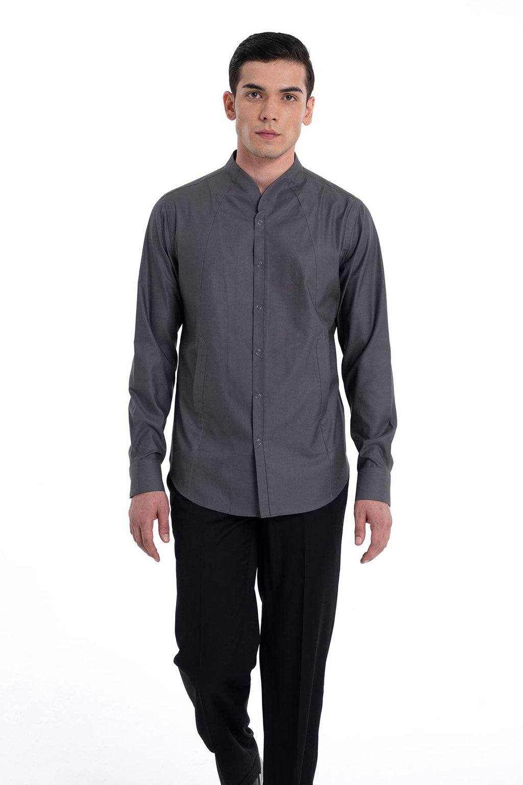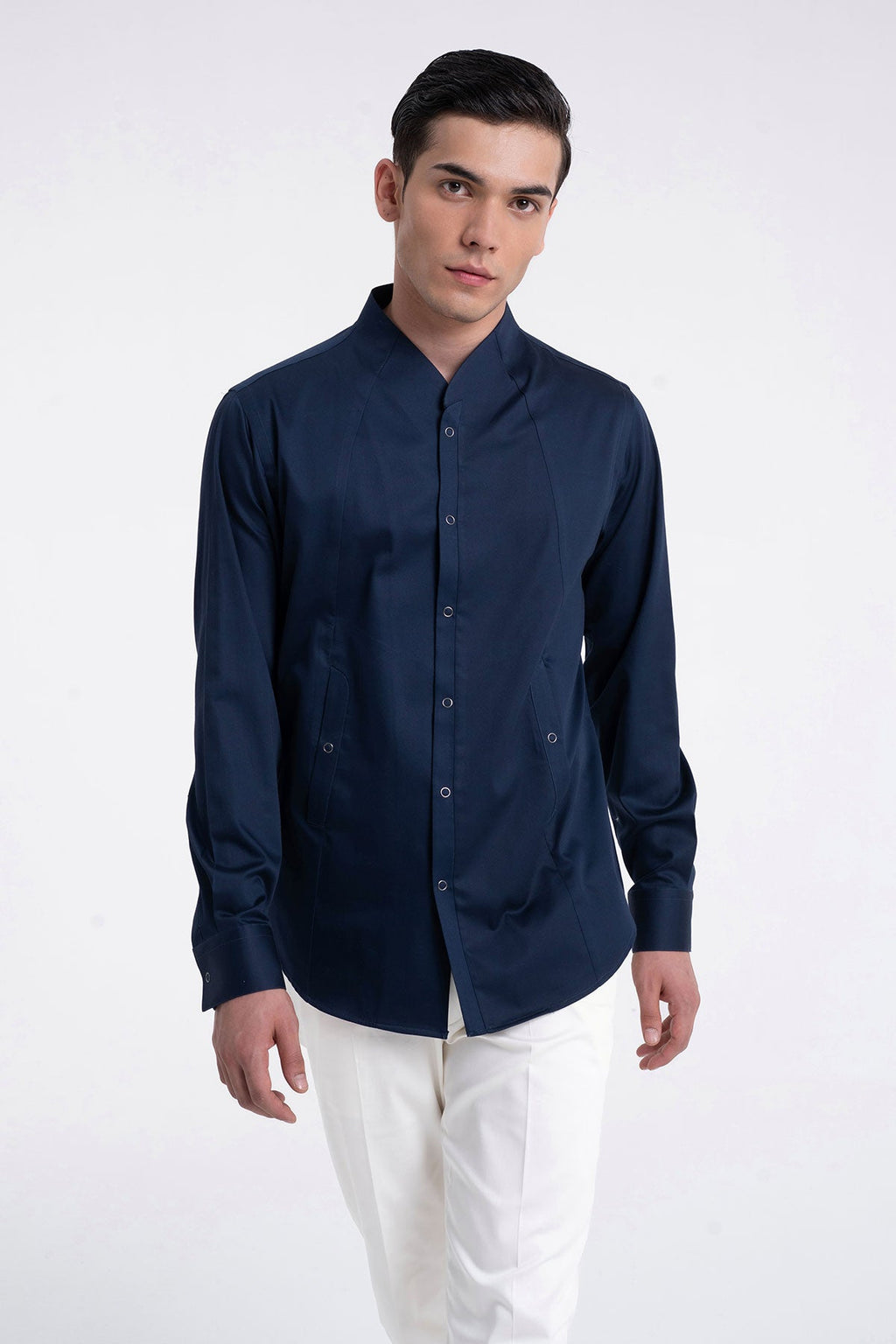 Classic And Clean Cut Shirt Tailored In Cotton Satin With High Neck Curved Collar And Snap Button Placket With Chique Panel Details.