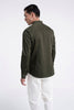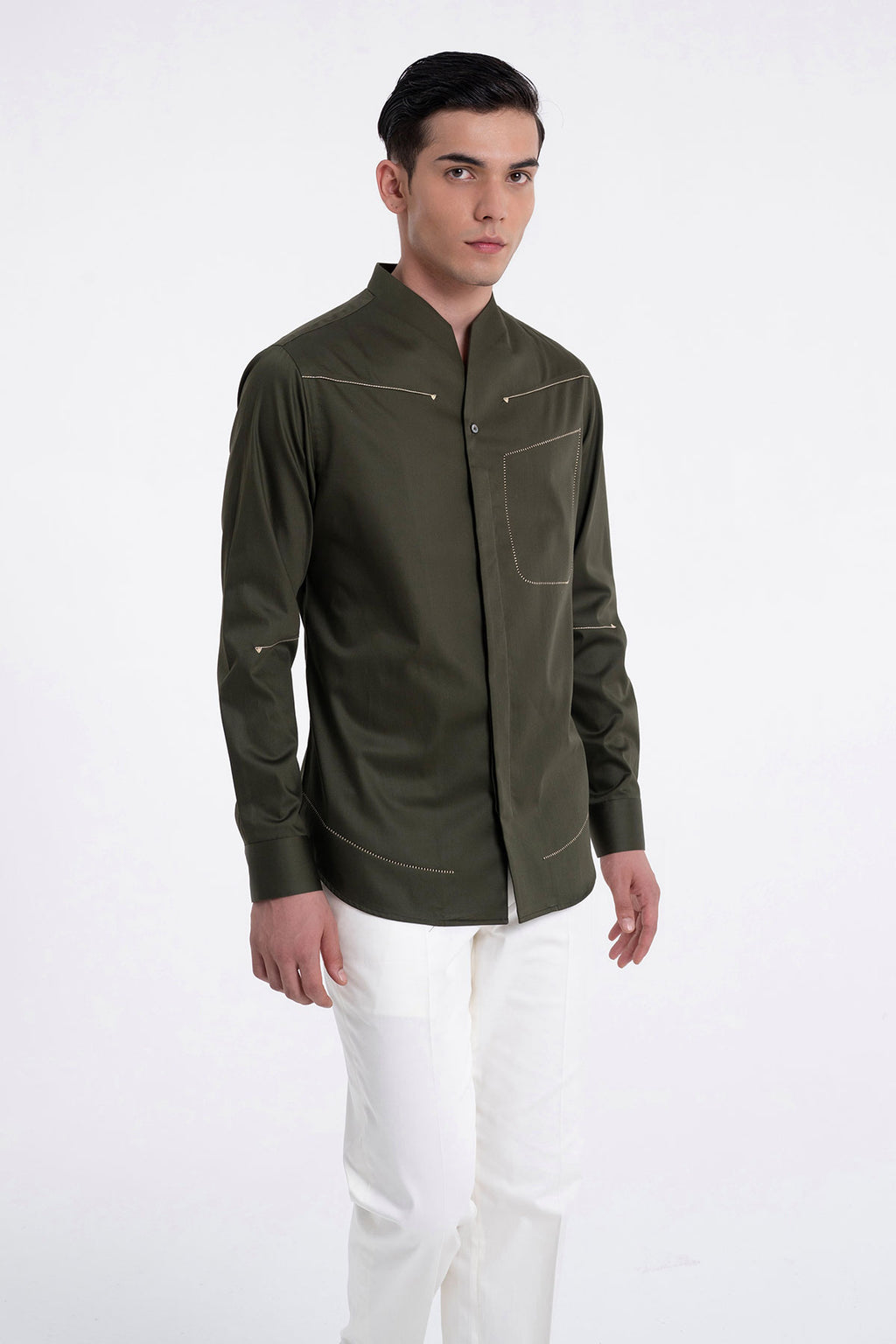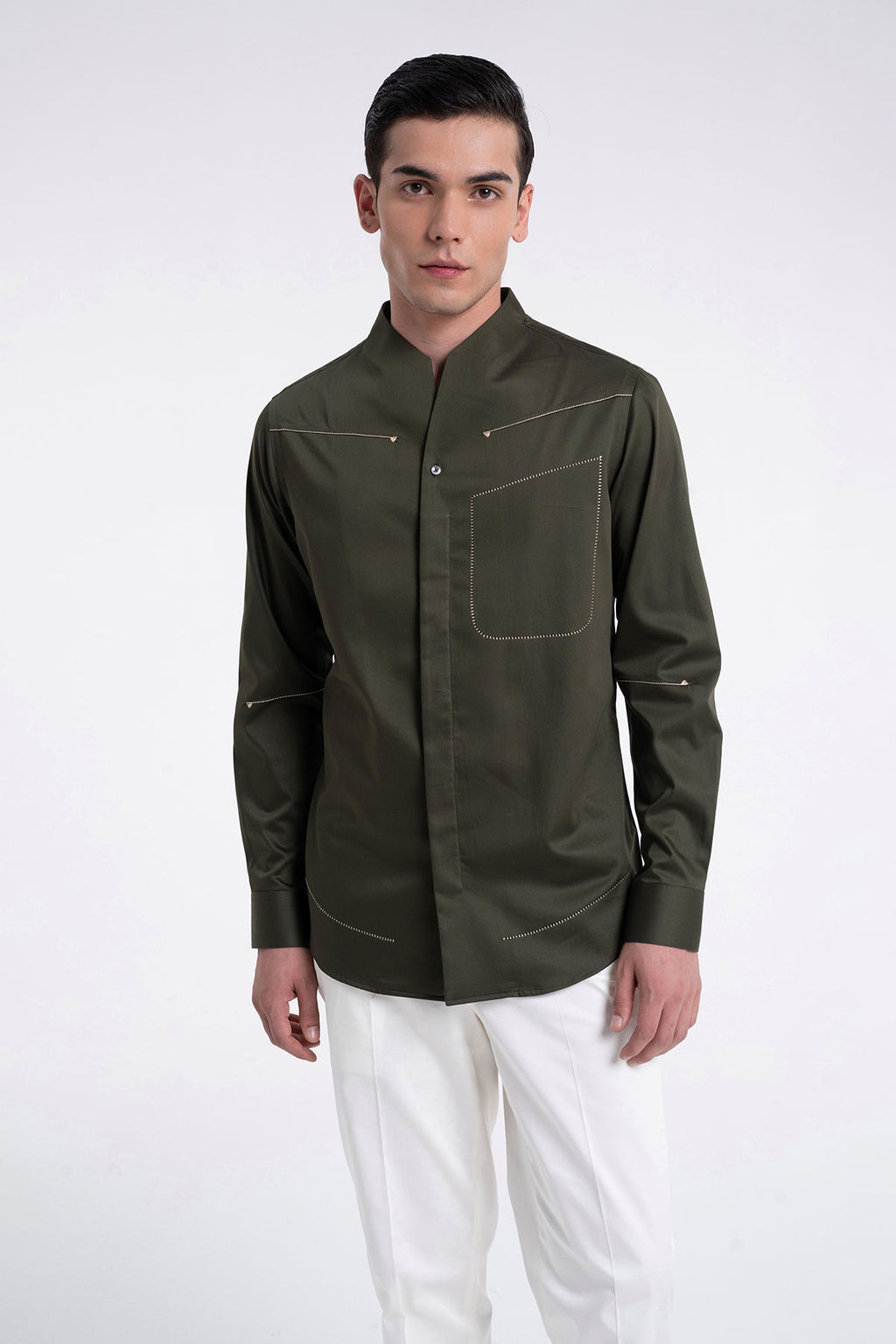Crafted In Smooth Cotton Satin, This Olive Green Shirt Features A Sleek High Neck Collar And Minimal Thread Detailing. Perfect For Effortless Day-To-Evening Style.