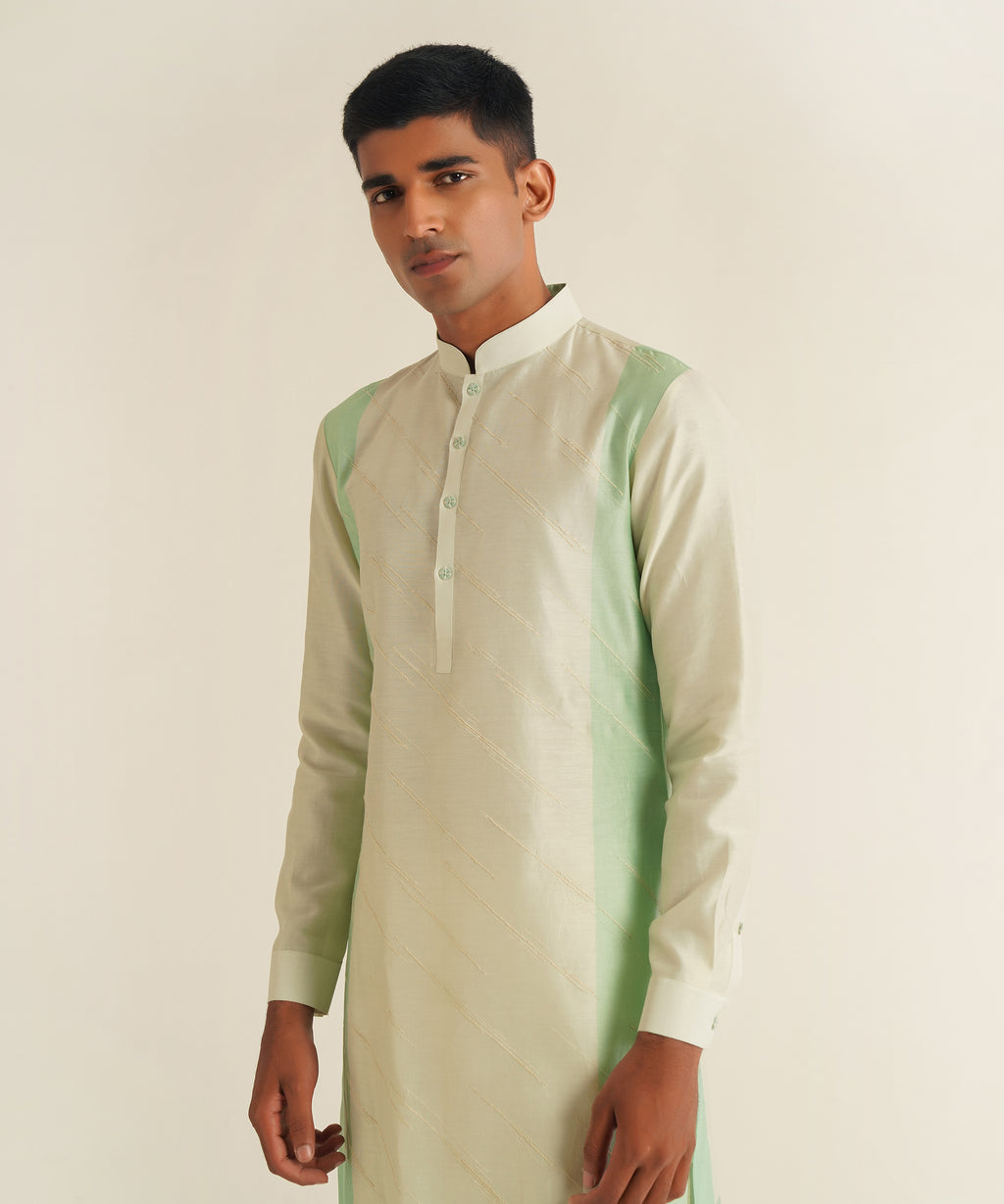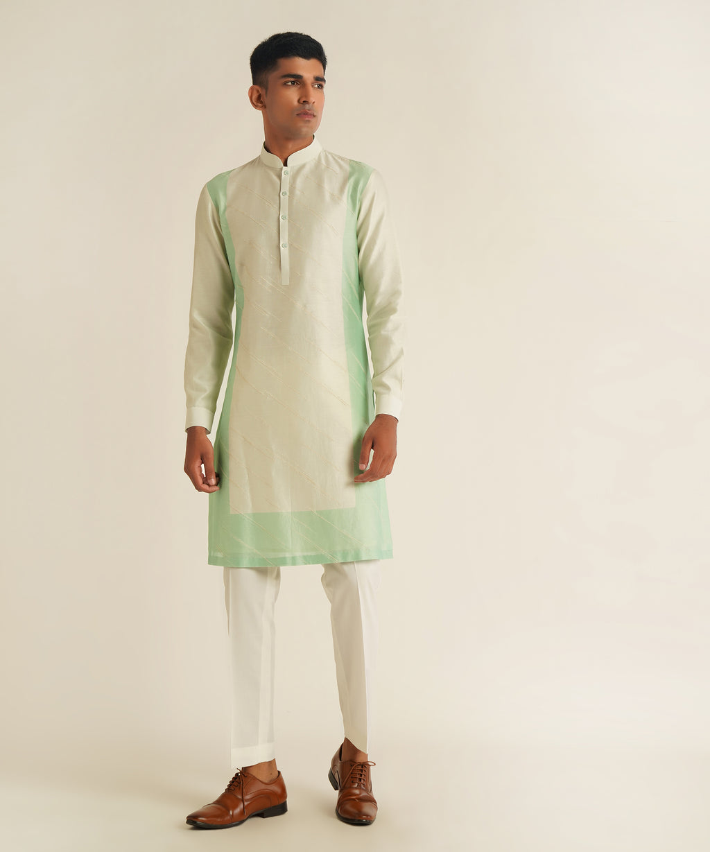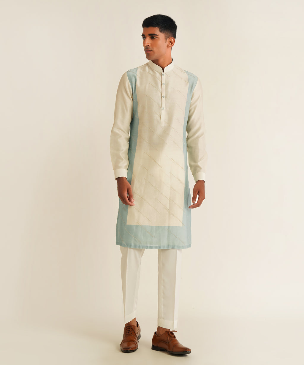 Classic cut cotton silk chanderi kurta with discharge print and embroidery paired with churidar.
