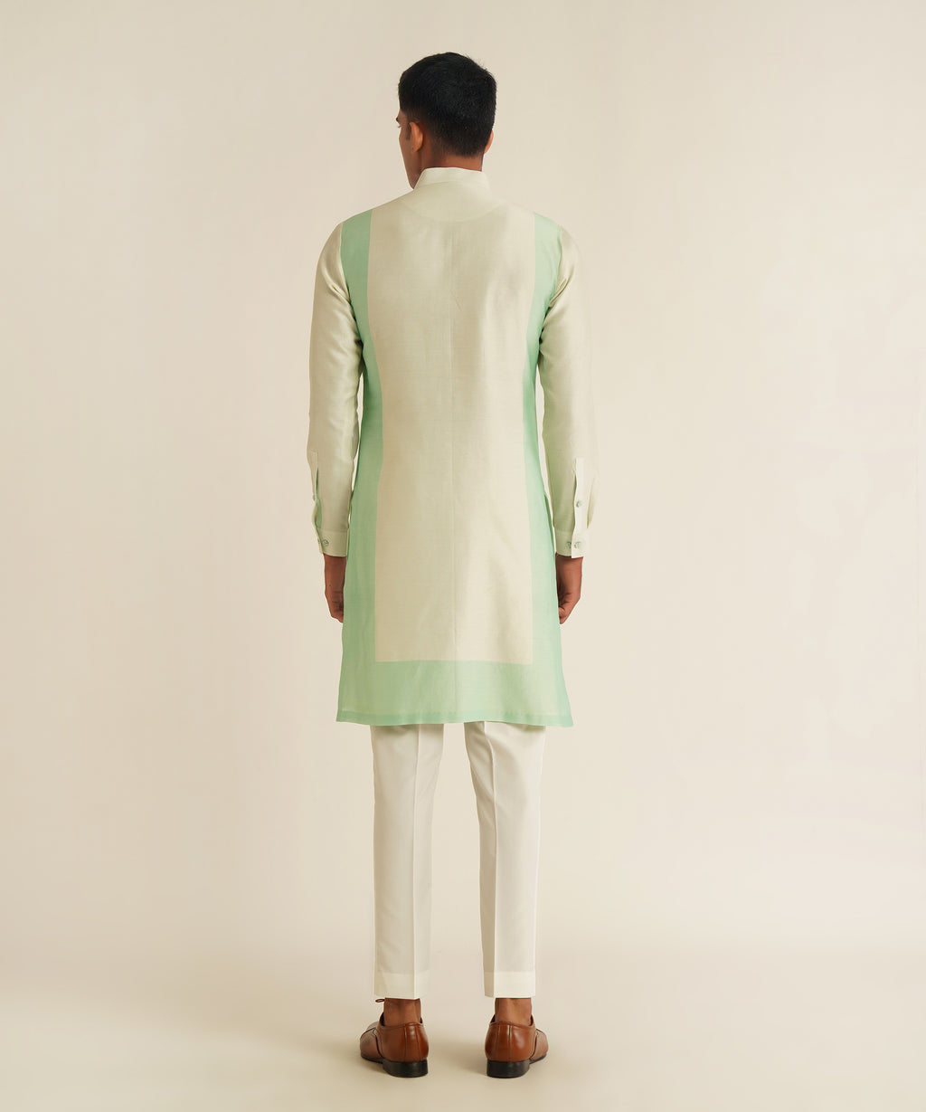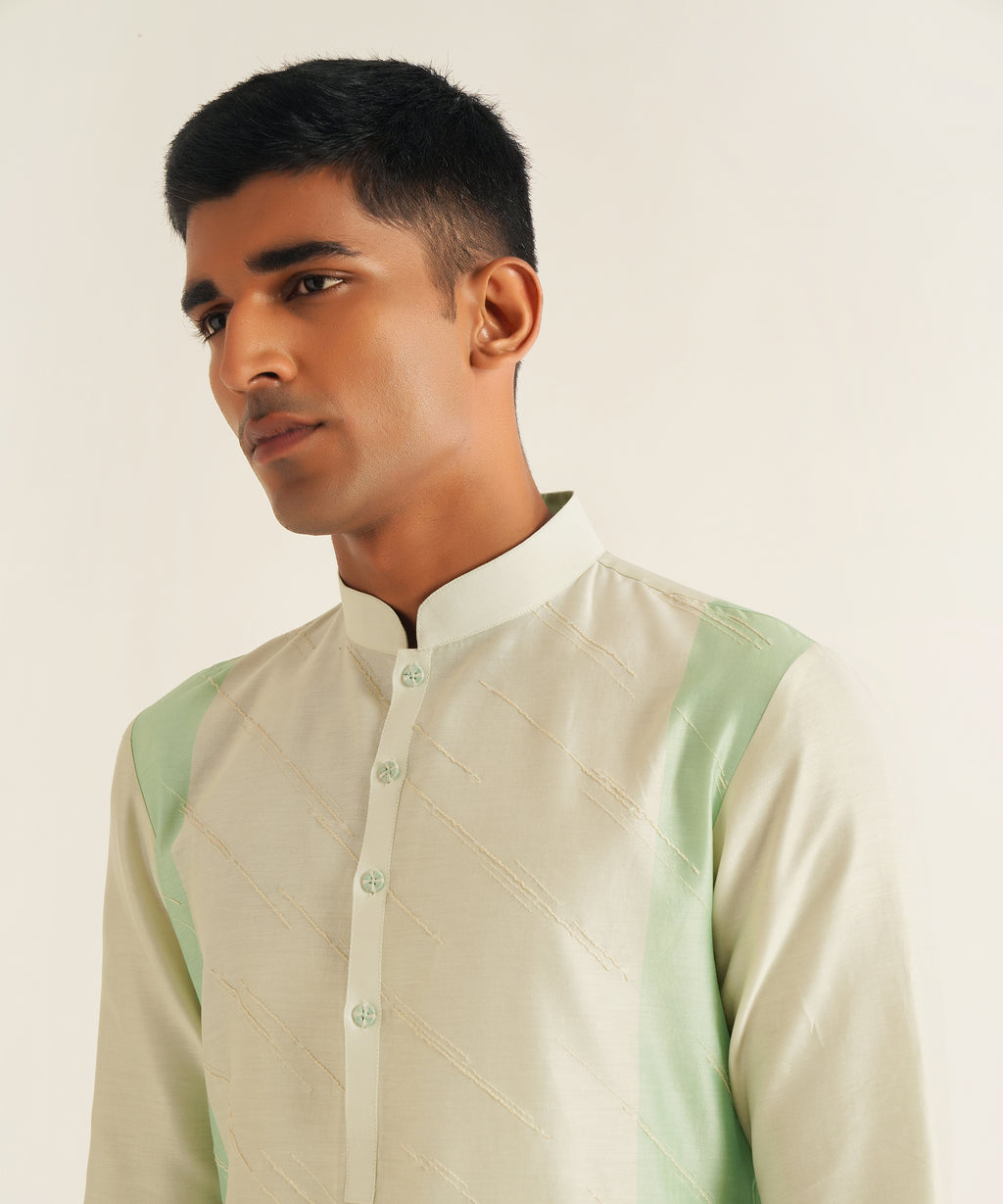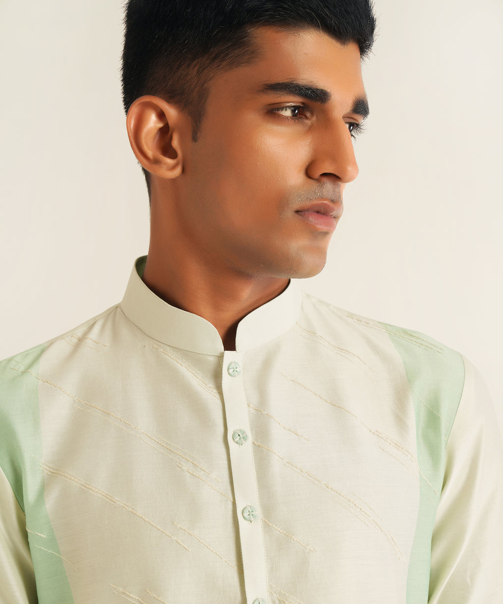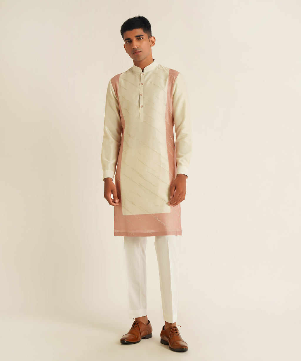 Classic cut cotton silk chanderi kurta with discharge print and embroidery paired with churidar.