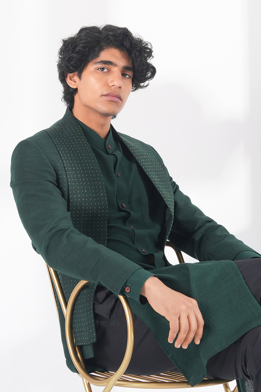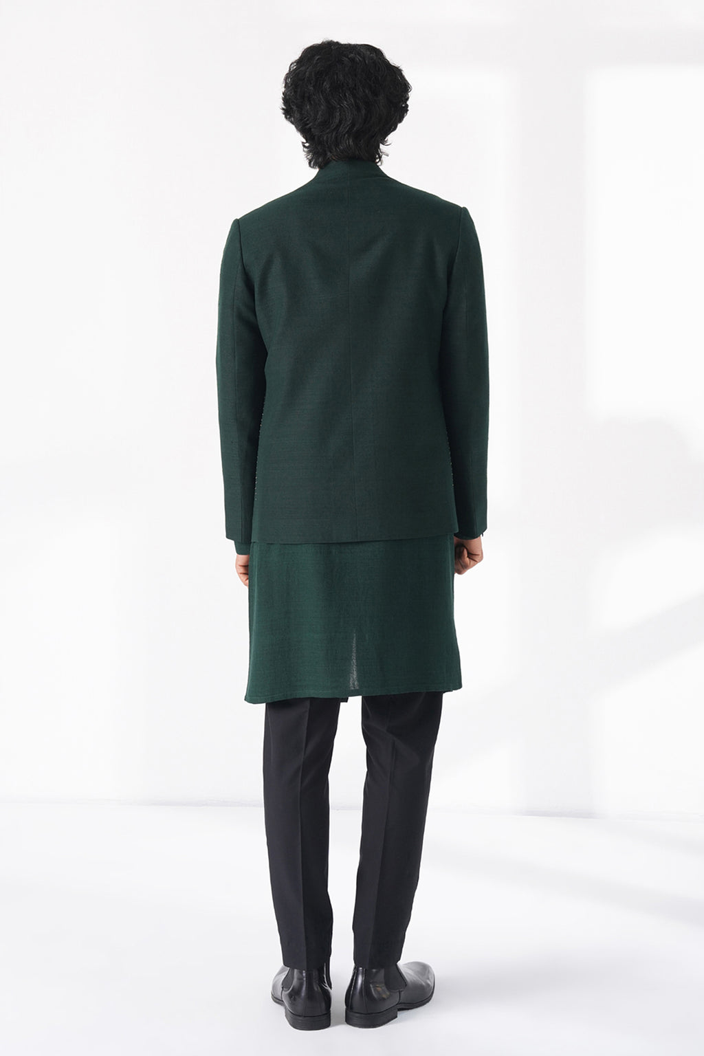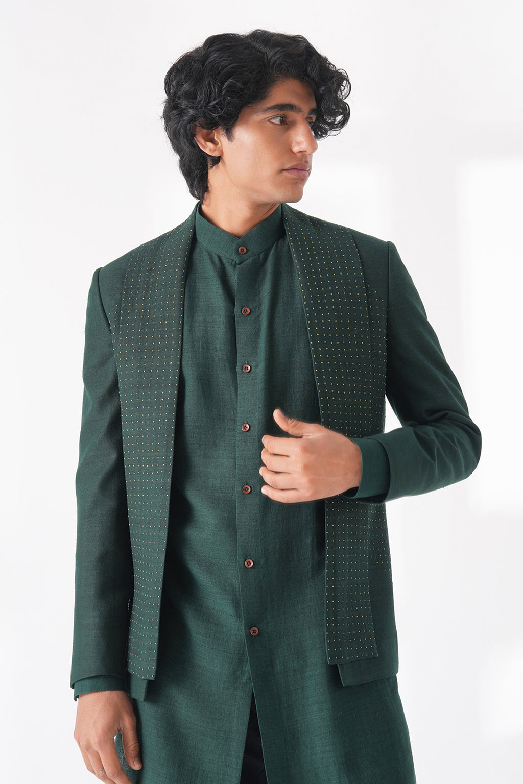 Front open bandhgala made in premium silk with metal beads and french knot embroidery paired with silk kuta and Terri cotton pajama making it perfect statement piece for the evening.