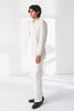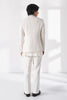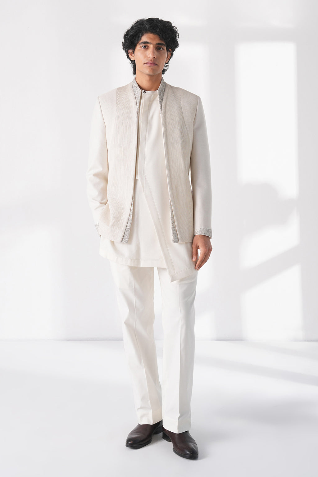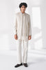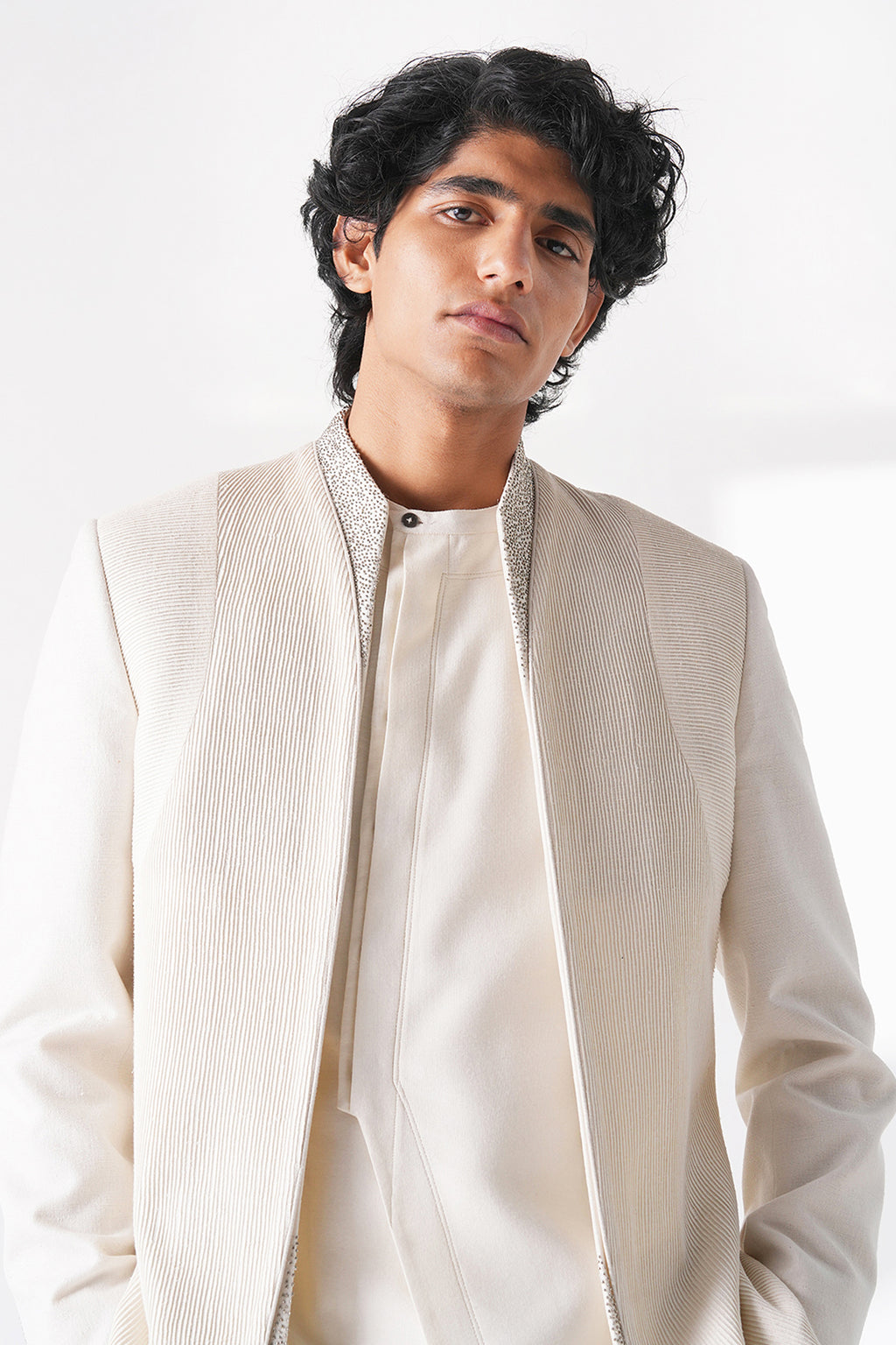 Front open silk bandgala with contrasting horizontal and vertical pintucks and metal bead work making it a perfect statement piece for the evening. It can be paired with cotton silk kurta and straight fit drawstring cotton trouser.