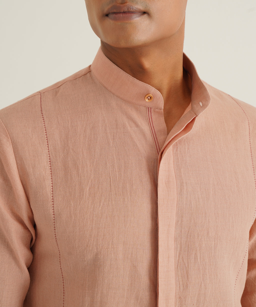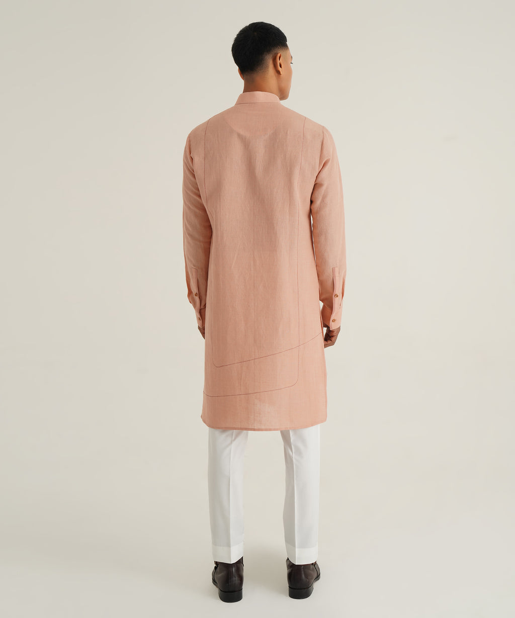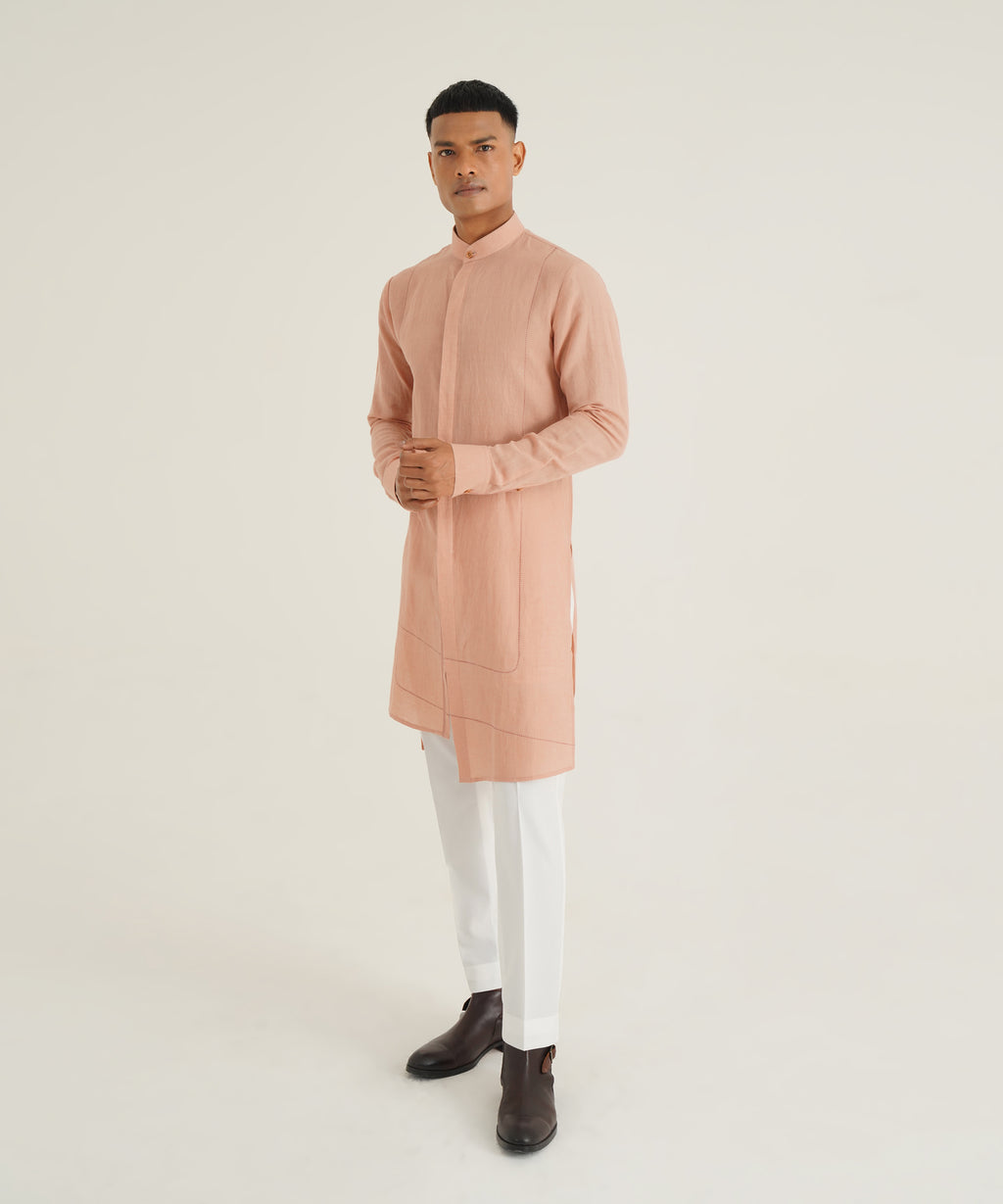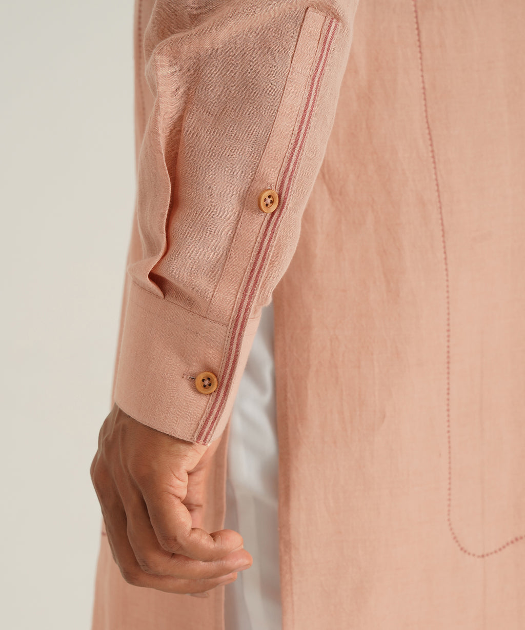 Front Open Handloom Kurta With Contrast Stitch Detailing Paired With Pant Style Pajama.