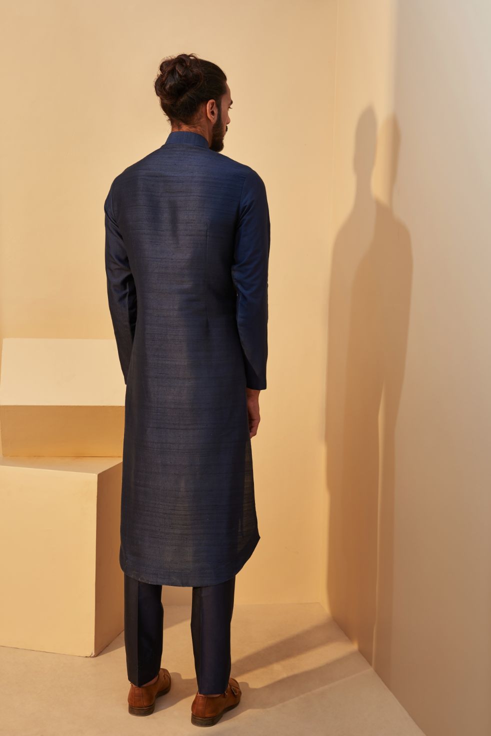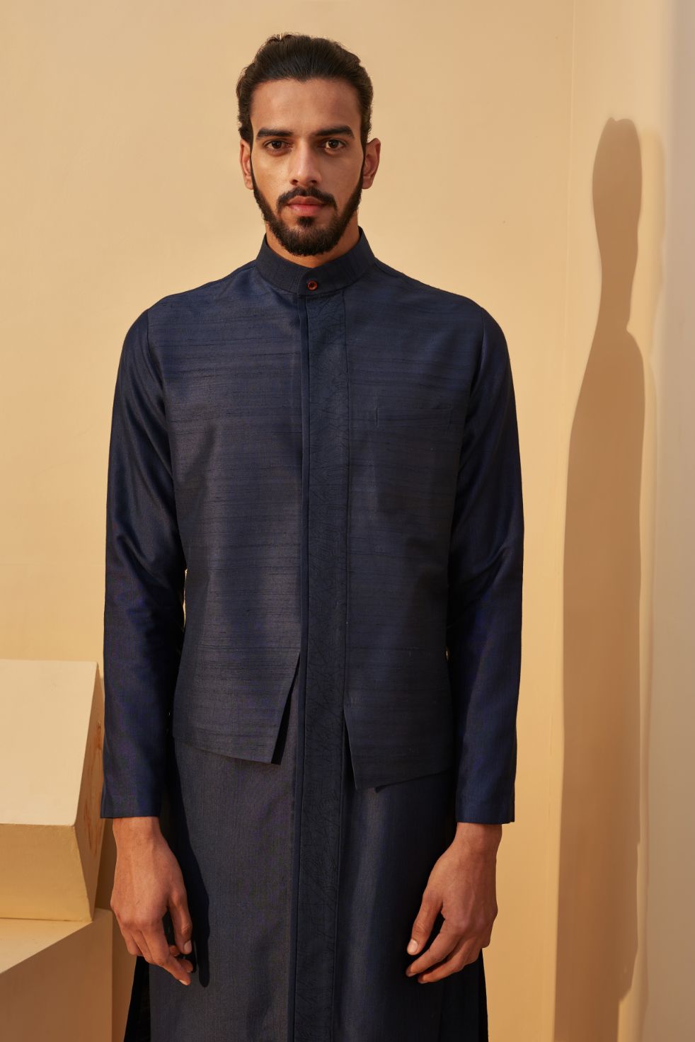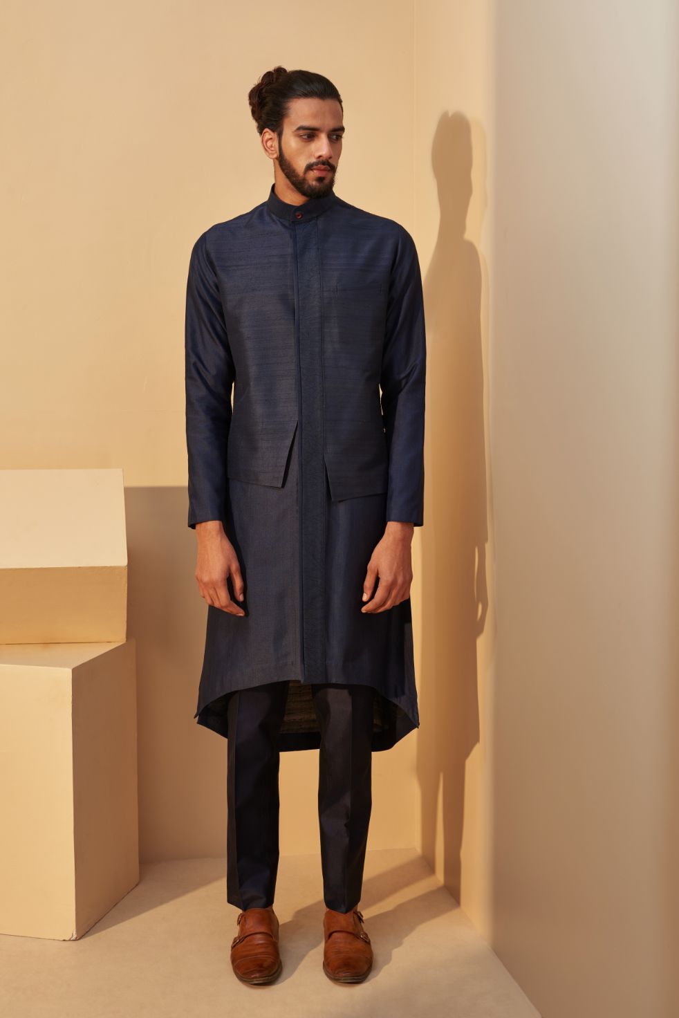 Ash Indigo Color Hybrid Kurta With Center Embroidered Panel Paired With Black Pant Cut Pyjama.