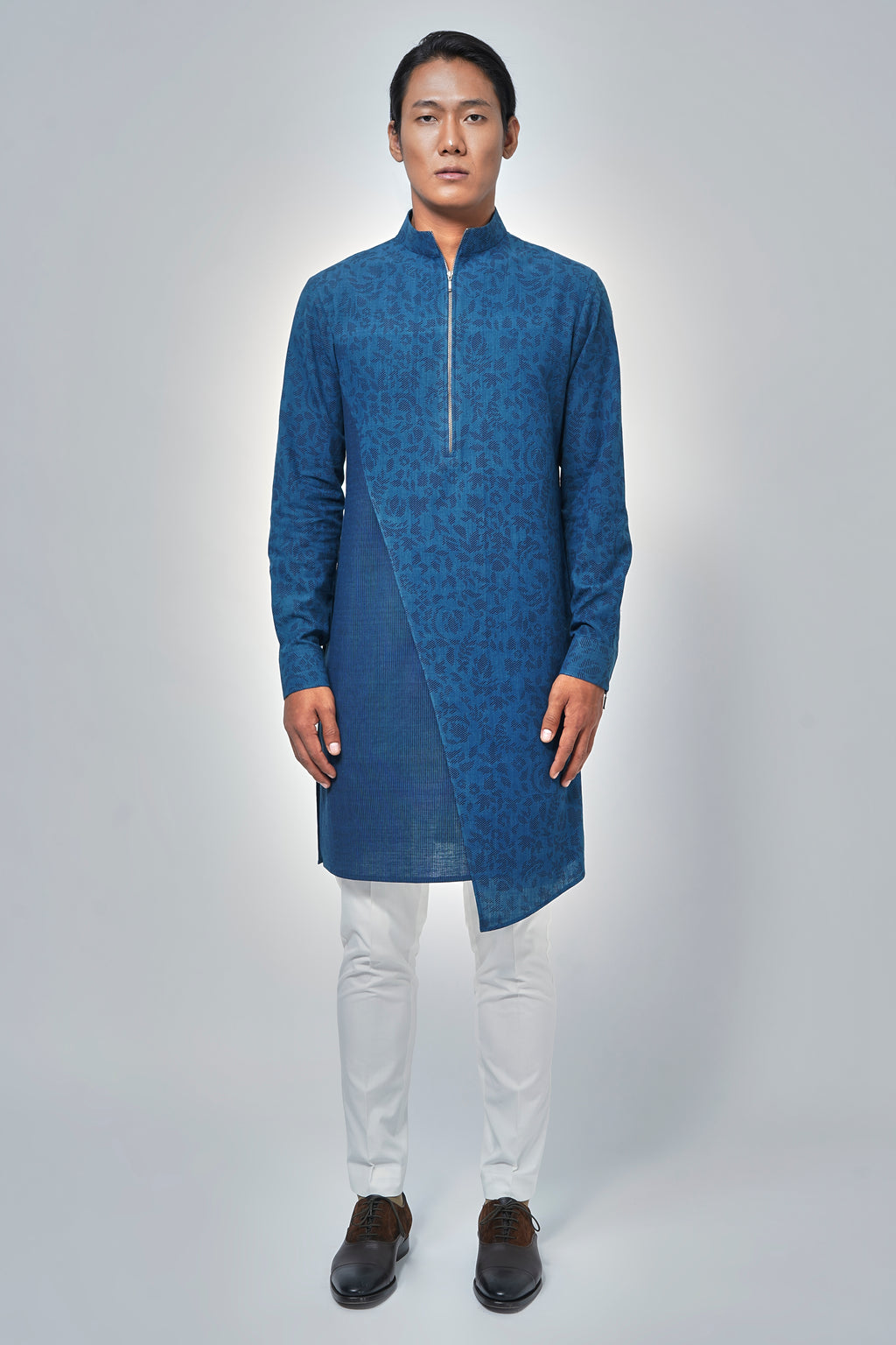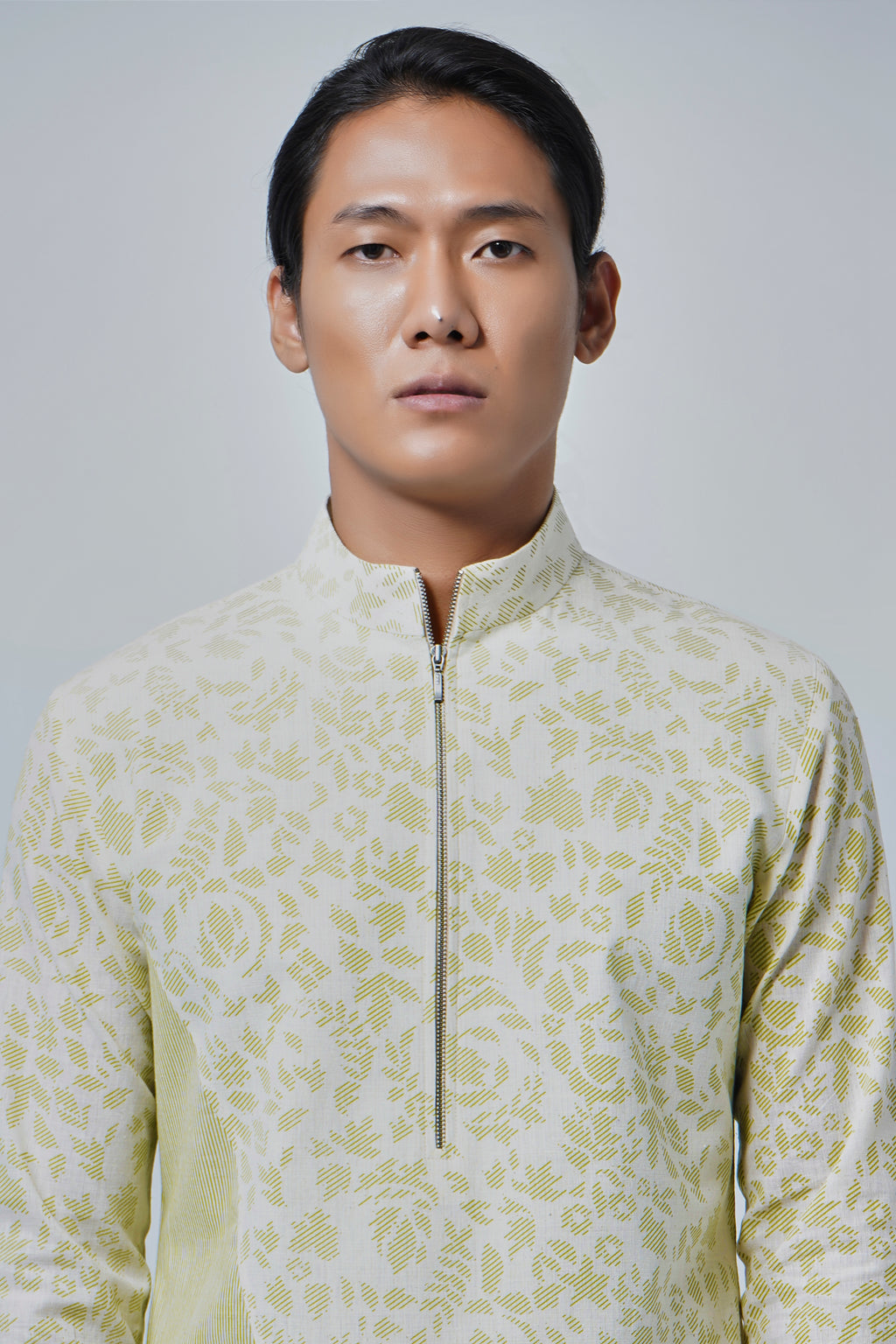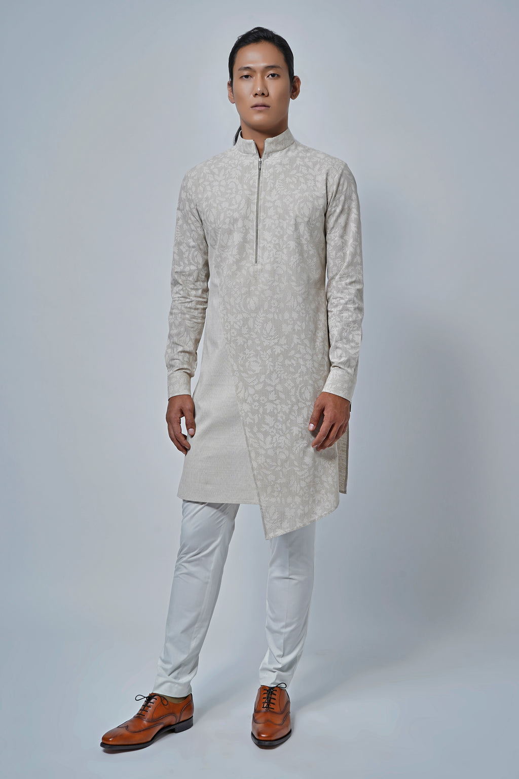 Printed Handloom Zipper Kurta with Asymmetric Hem Paired with Pant Cut Pyjama
