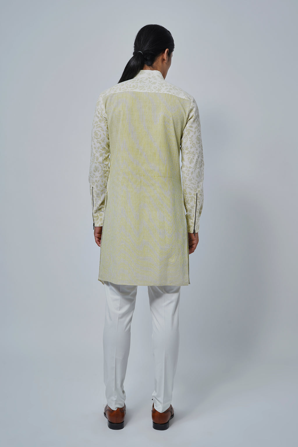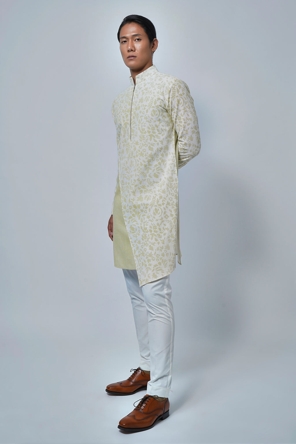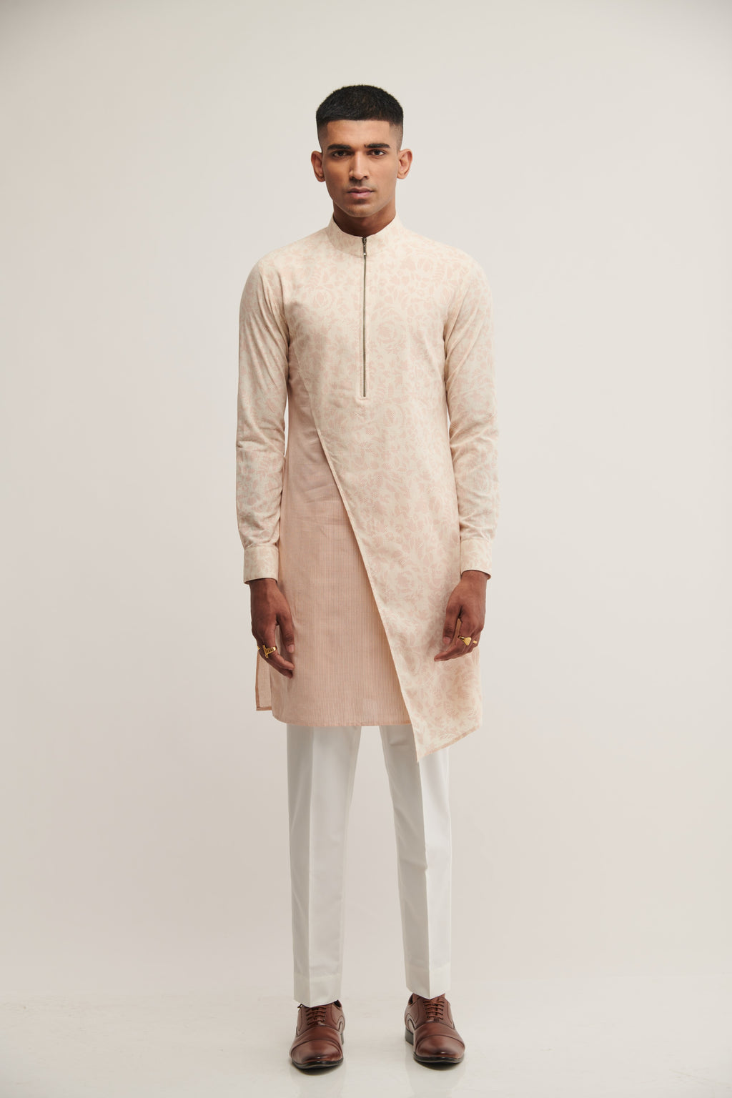 Printed Handloom Zipper Kurta with Asymmetric Hem Paired with Pant Cut Pyjama