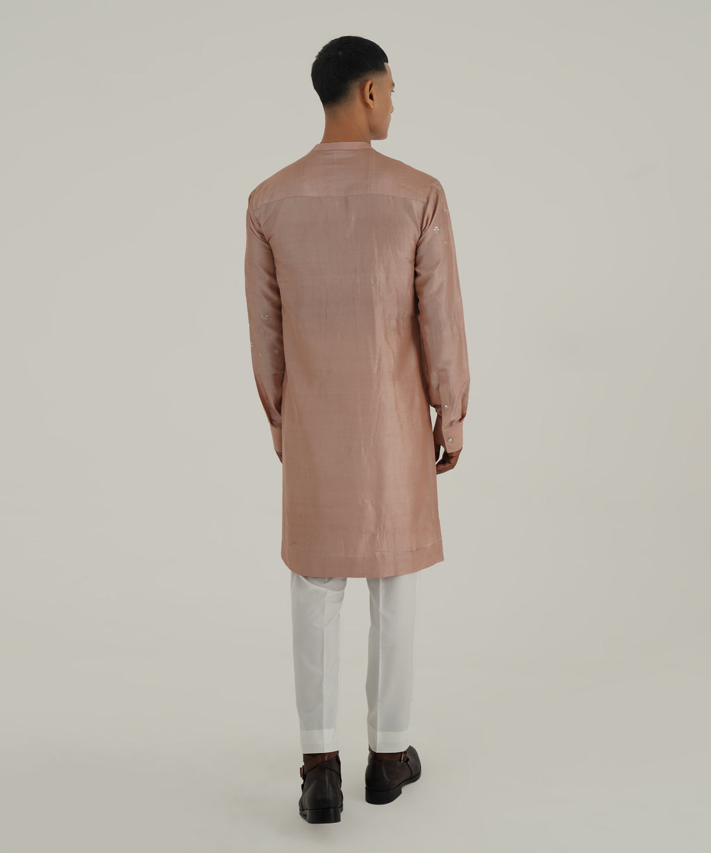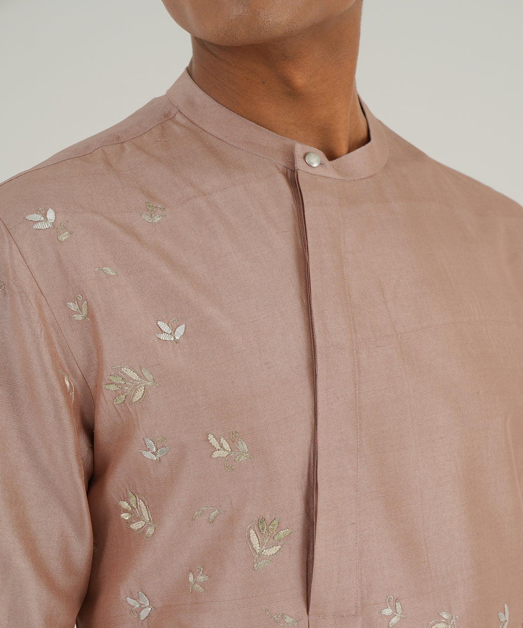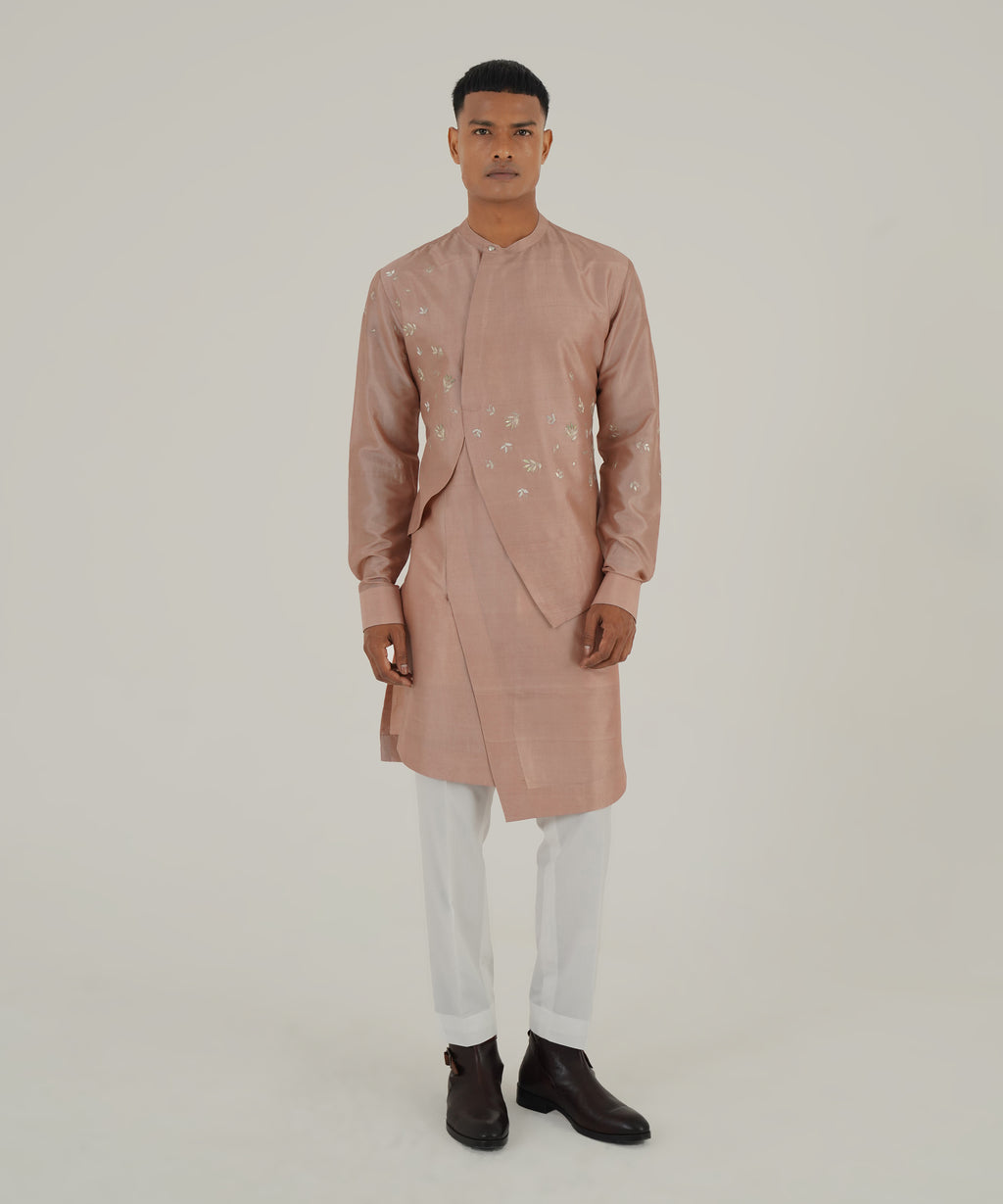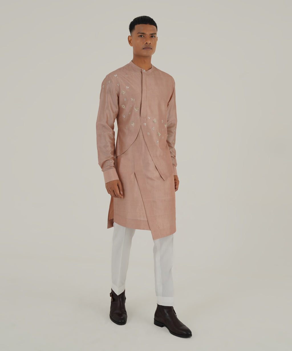 Layered silk kurta with floral metallic embroidery paired with pant style pajama.