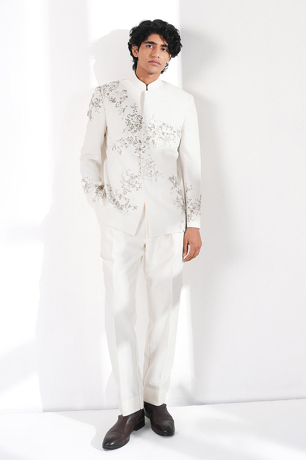 Exquisite bandhgala made in premium silk hand embroidered with metal beads pattern scattered all over the bandhgala for a crisp and standout look. It can be paired with classic Cotton Trouser.