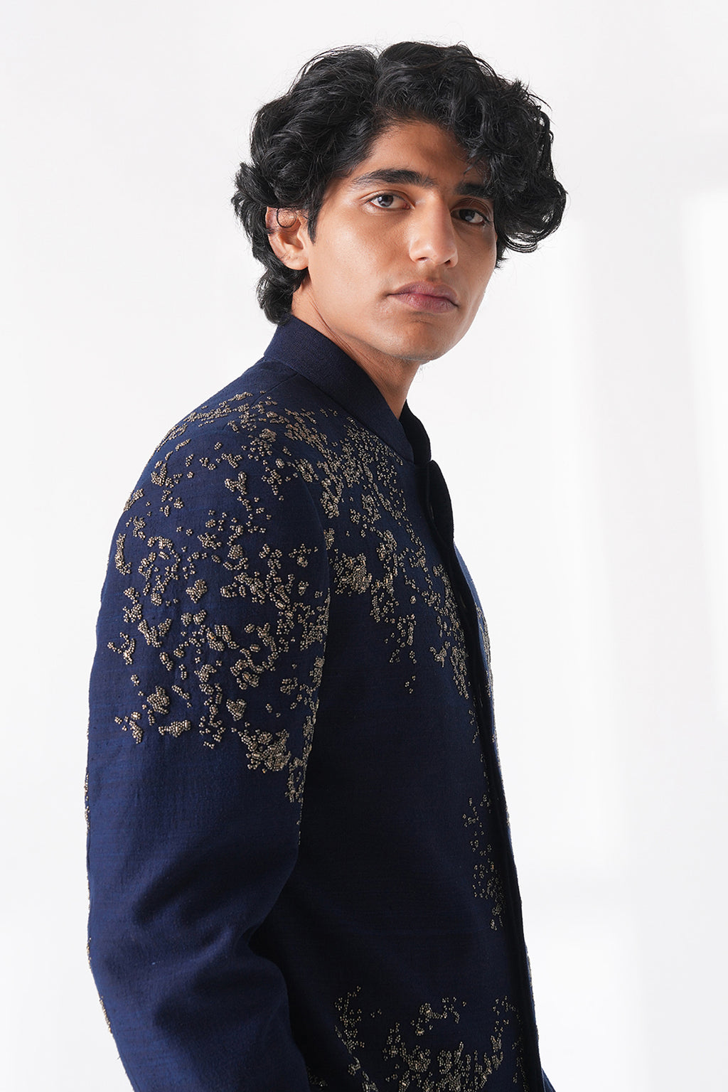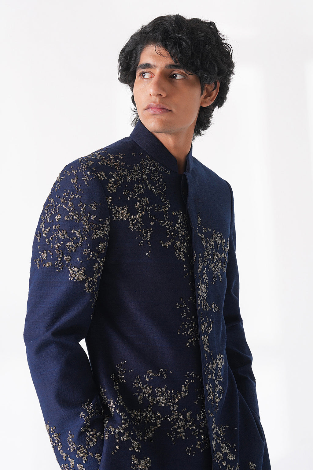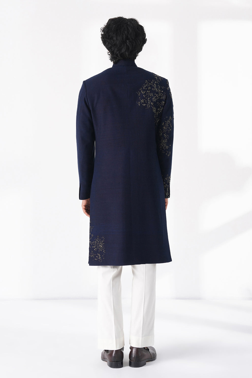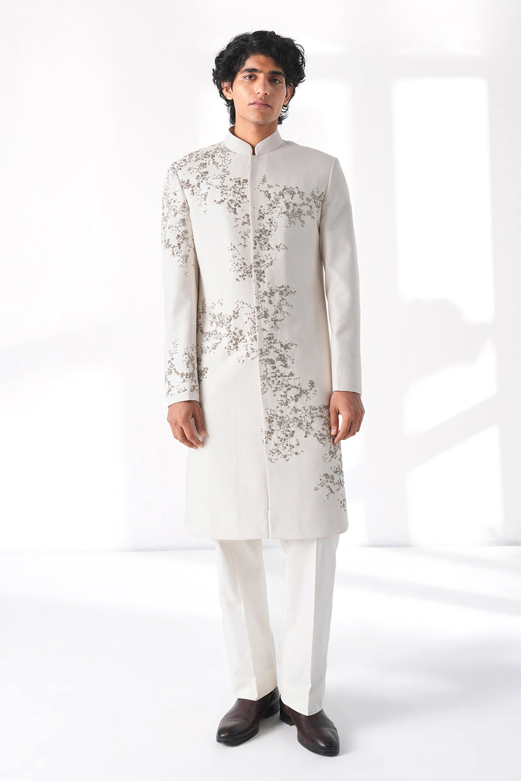 Exquisite sherwani in premium silk hand embroidered with metal beads pattern scattered all over the sherwani paired with terricotton pyjama for a crisp and standout look.