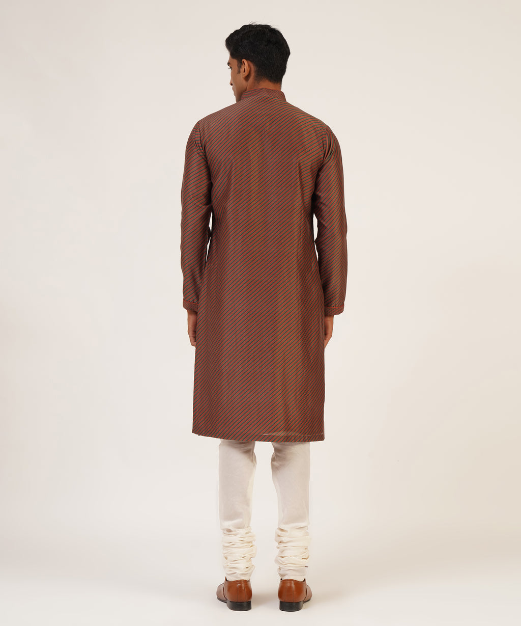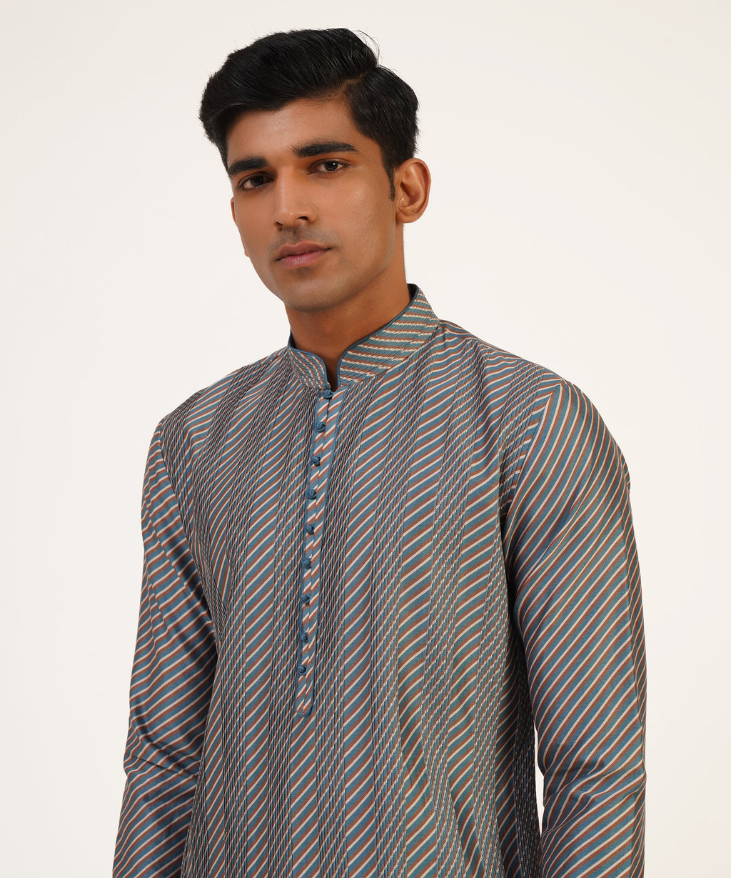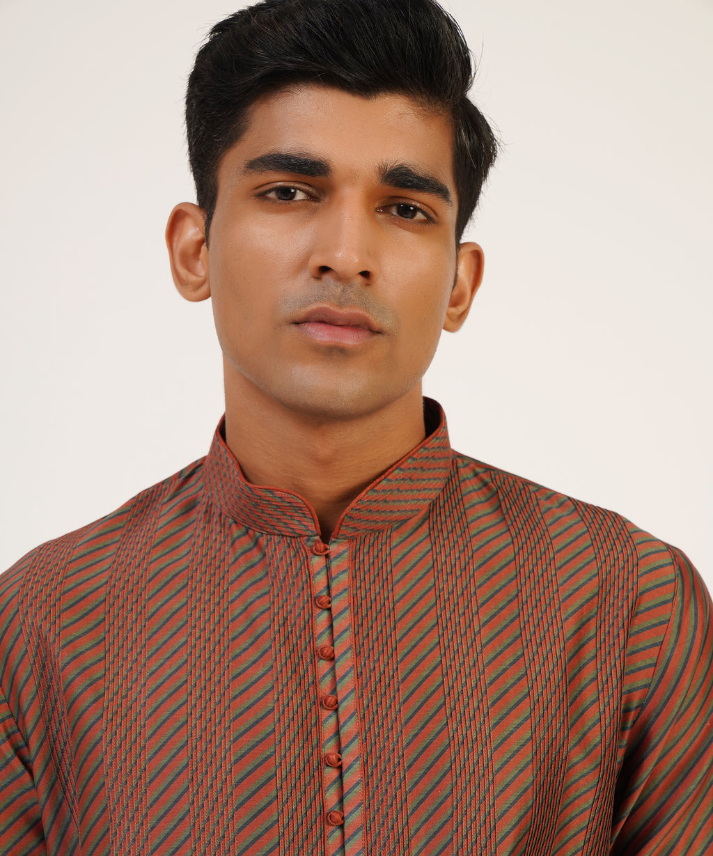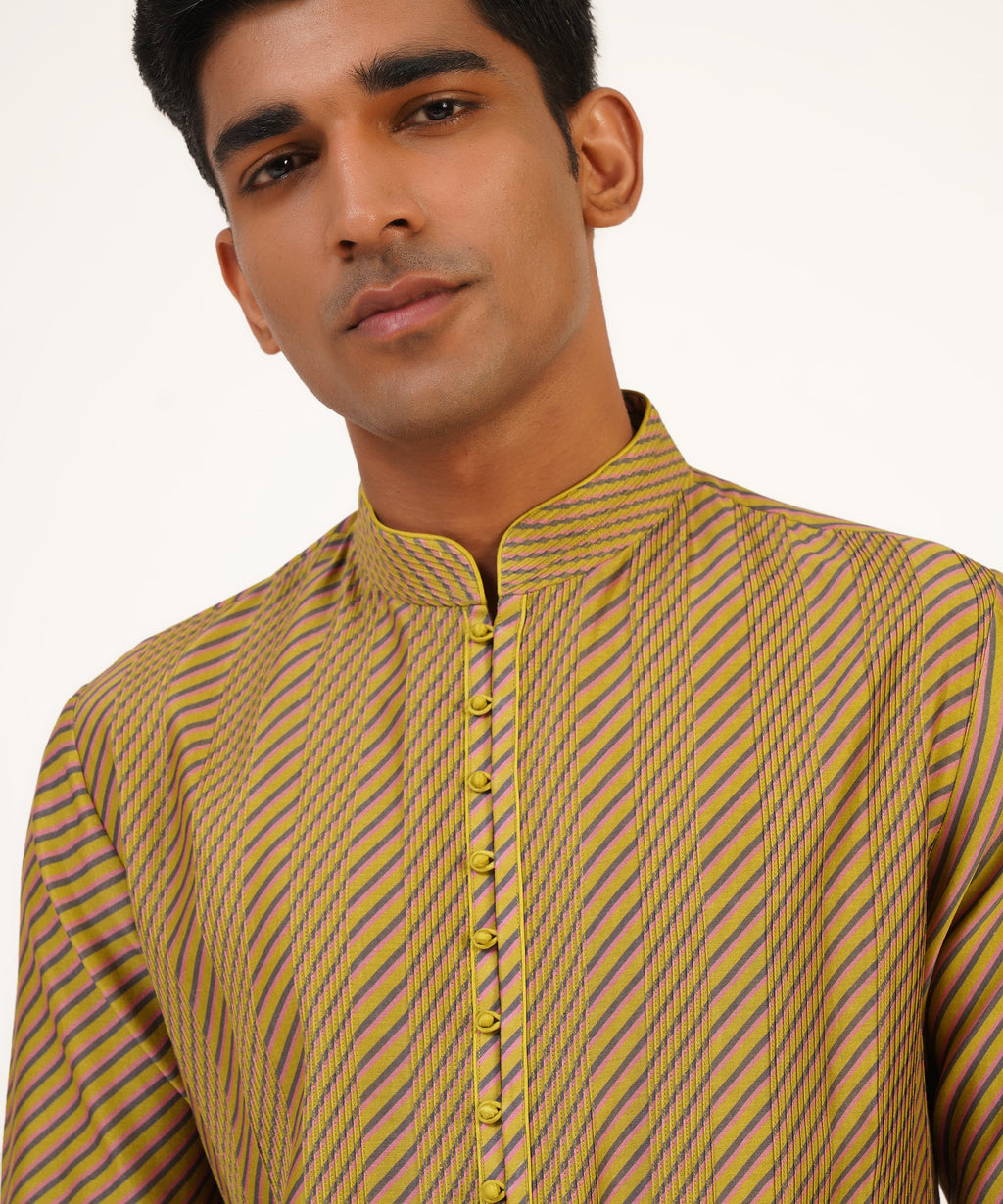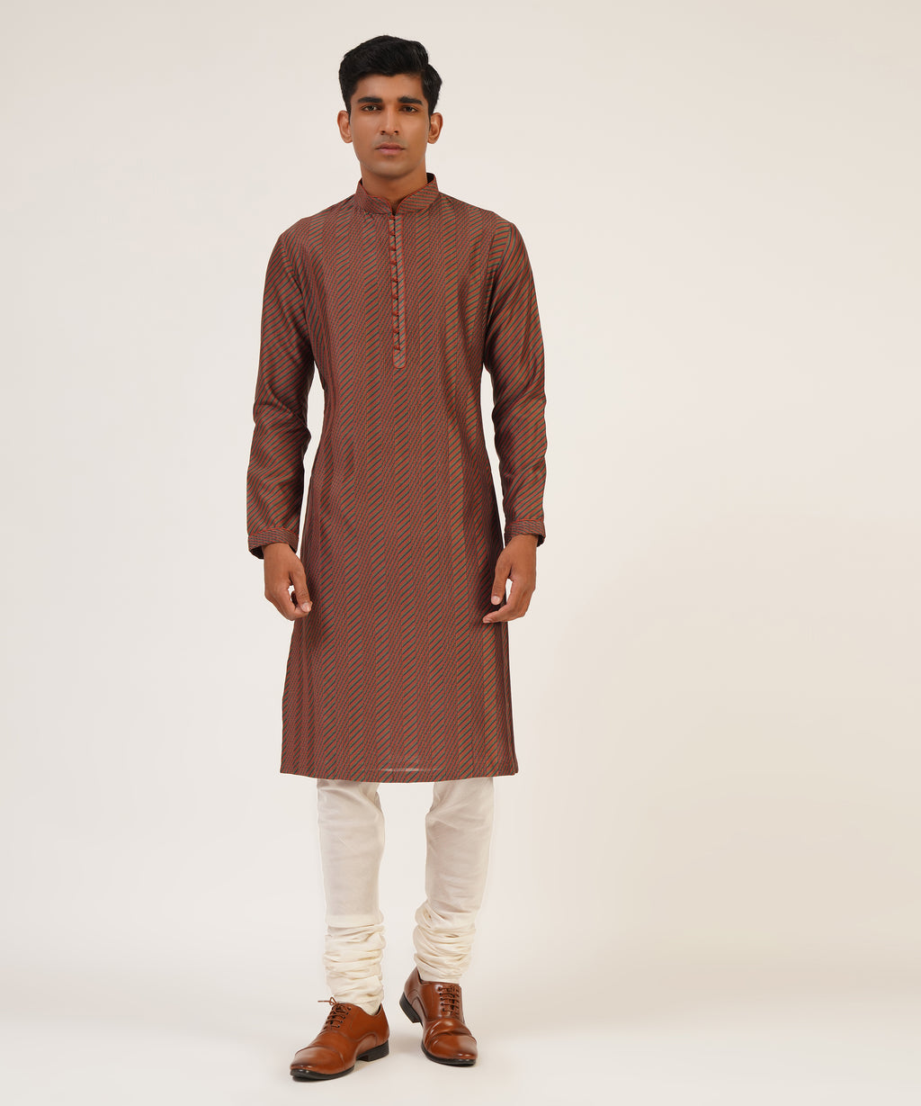 Cotton Silk Chanderi Diagonal Line Printed Kurta With Pintucks And Loop Buttons Paired With Churidar