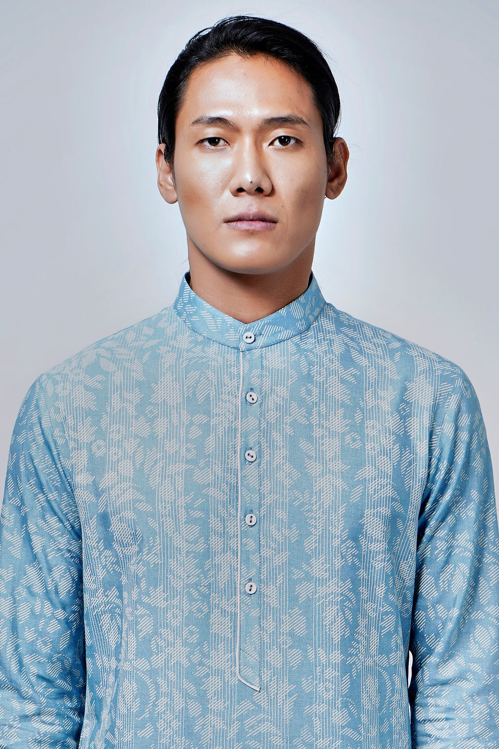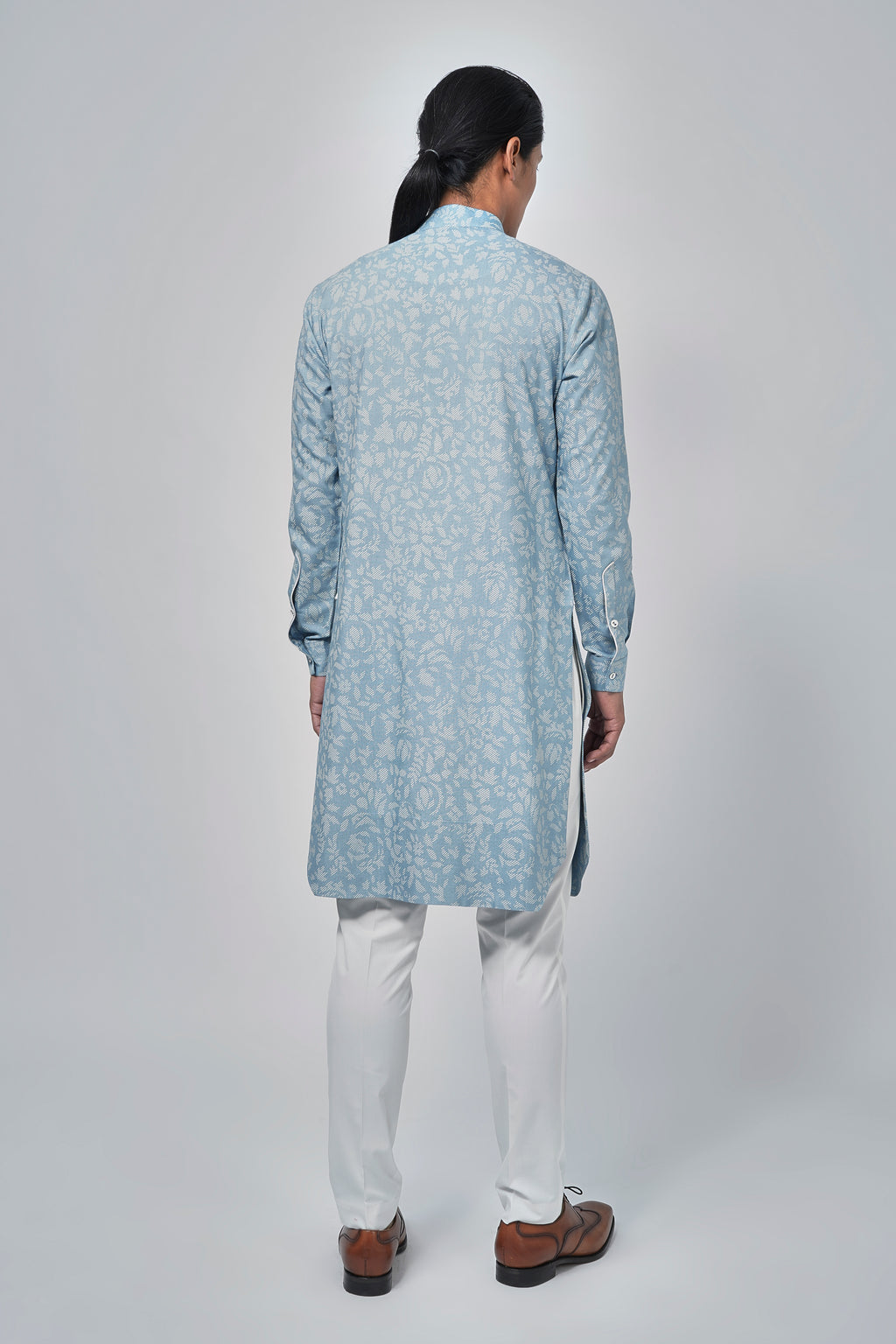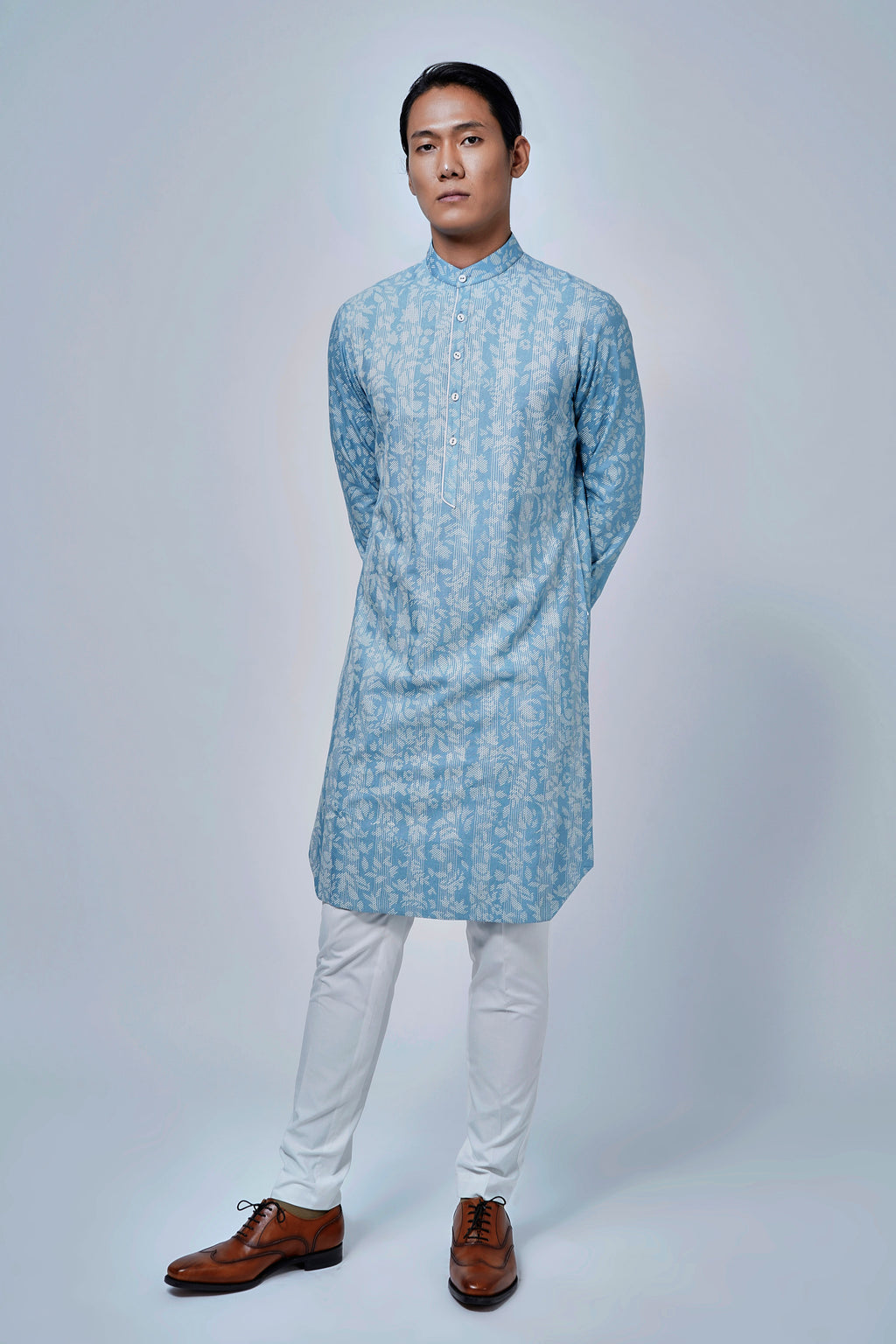 Printed Kurta Set in Cotton Silk with Center Placket Paired with Pant Cut Pyjama