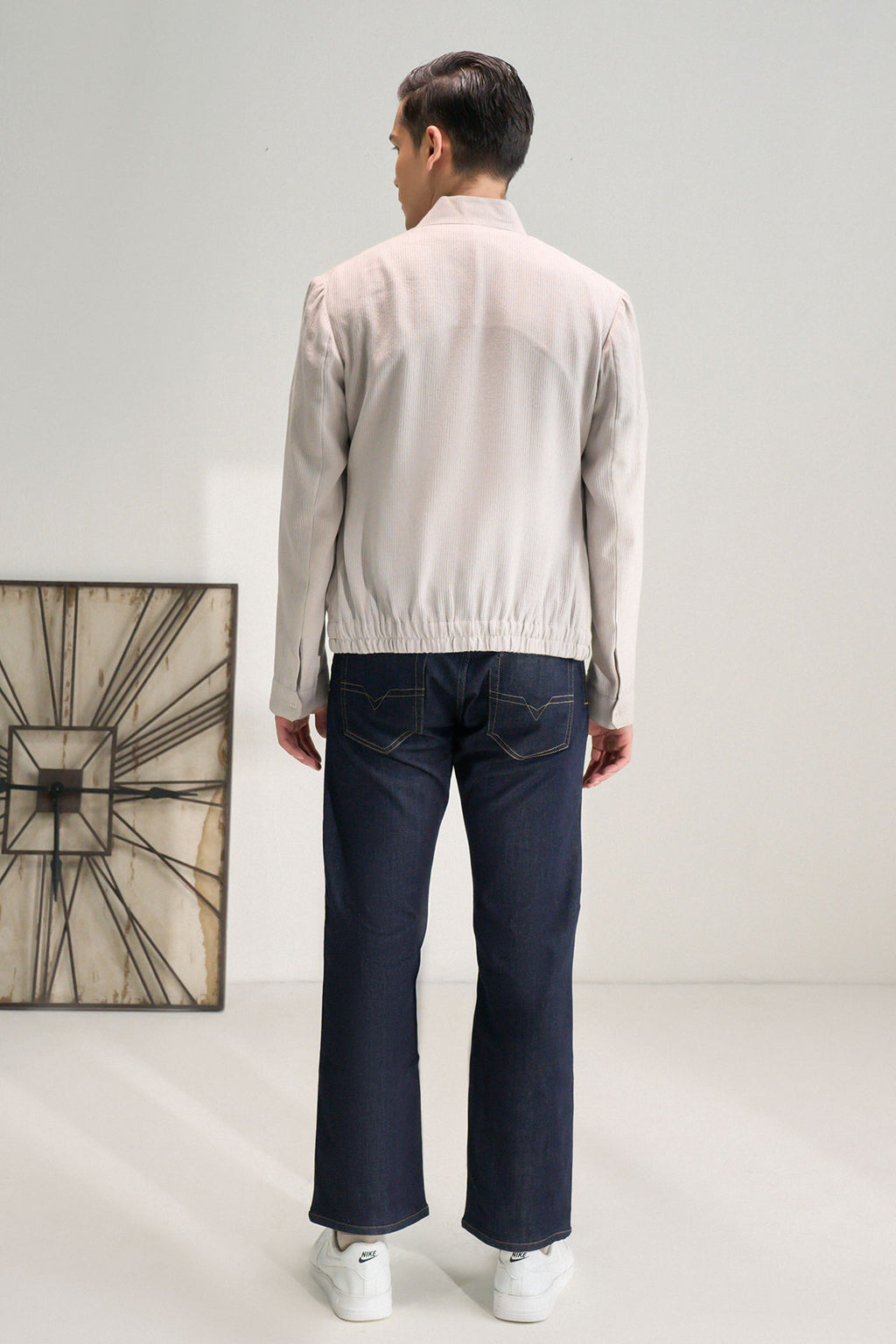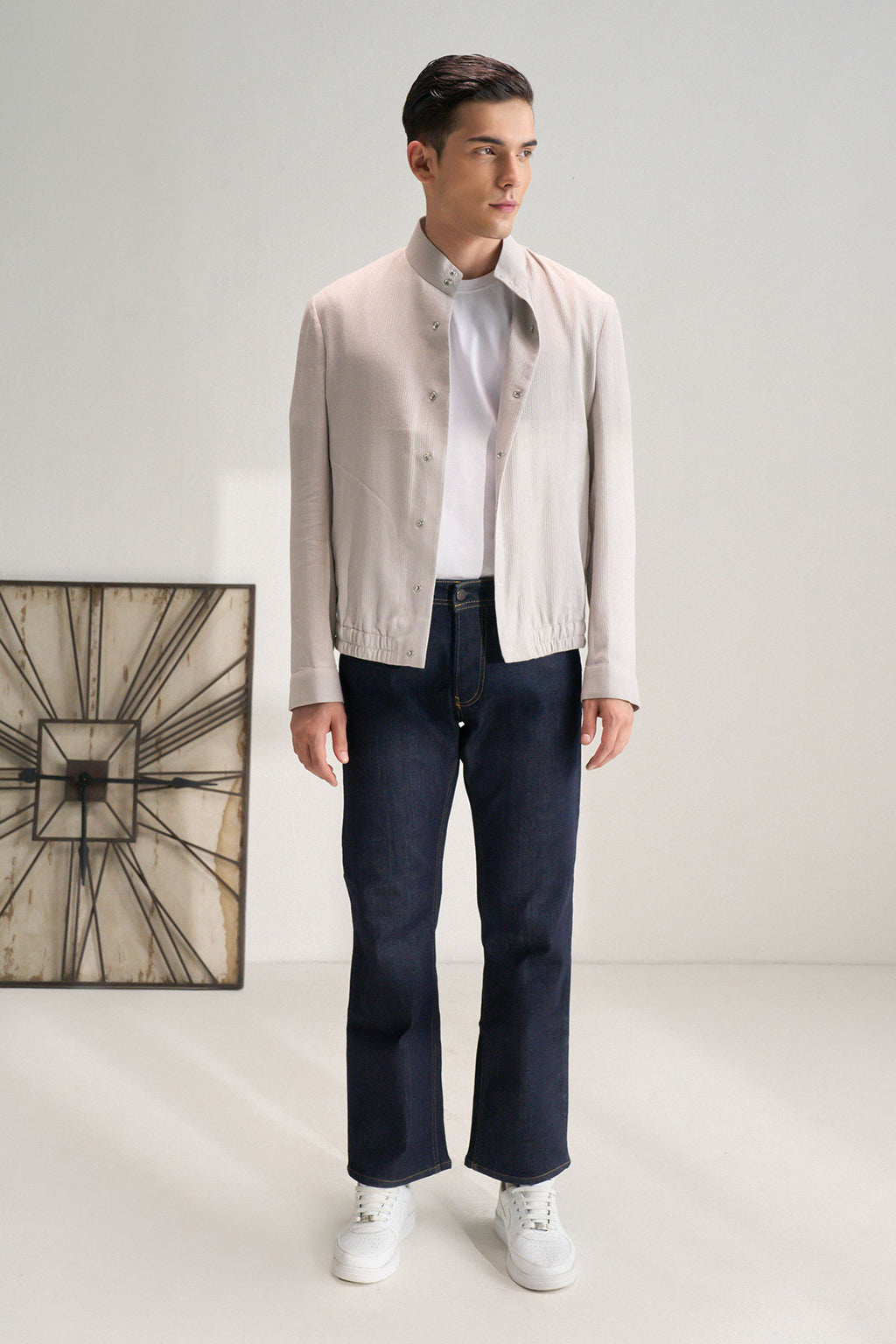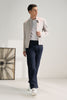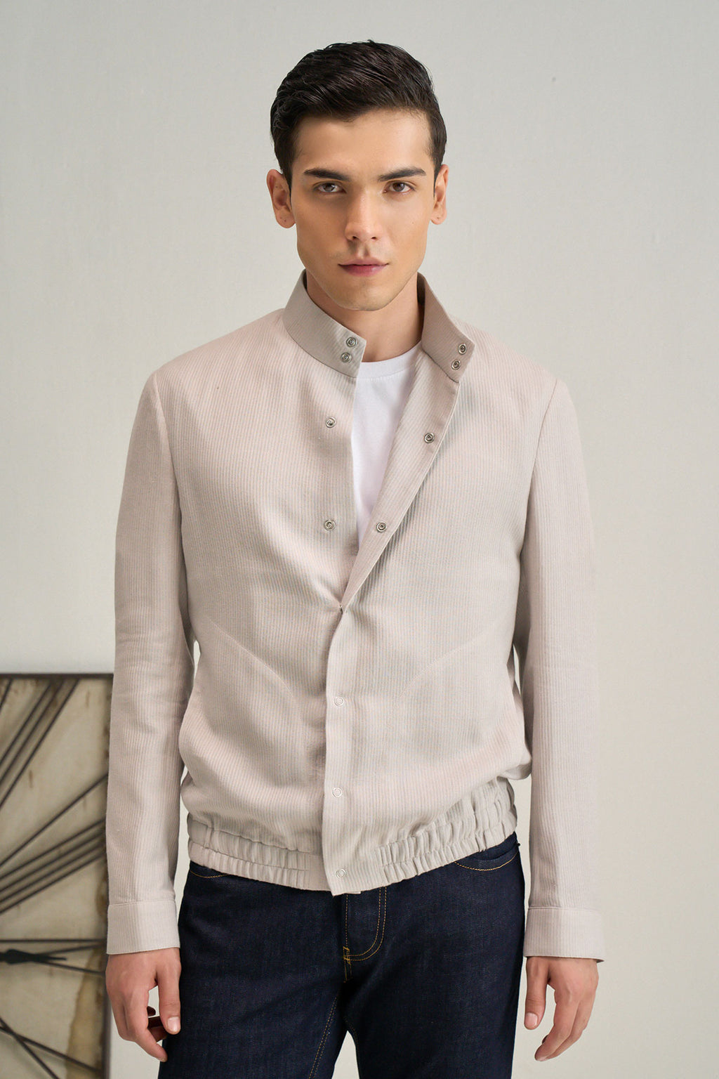 A sleek stand-collar jacket in handloom cotton with a clean buttoned front and minimal detailing at the hem and pocket for a refined yet effortless everyday ensemble.
