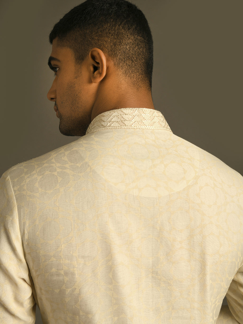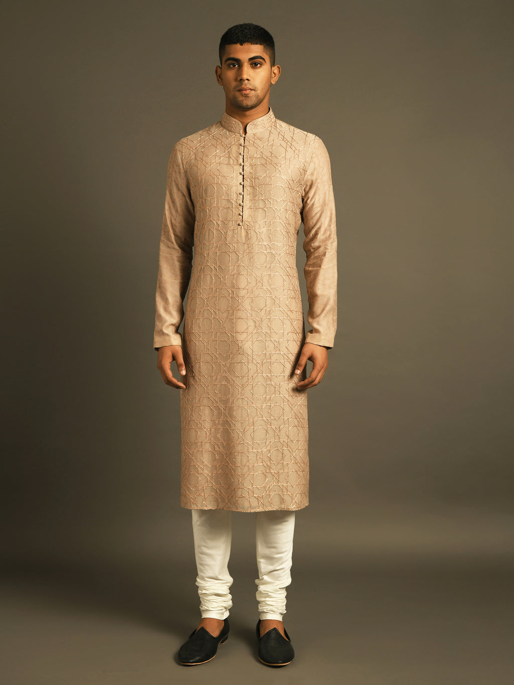 Classic Kurta Set in fine Cotton Silk Chanderi with Hand Embroidery Paired with Churidar perfect for any semi-formal or pre-wedding events