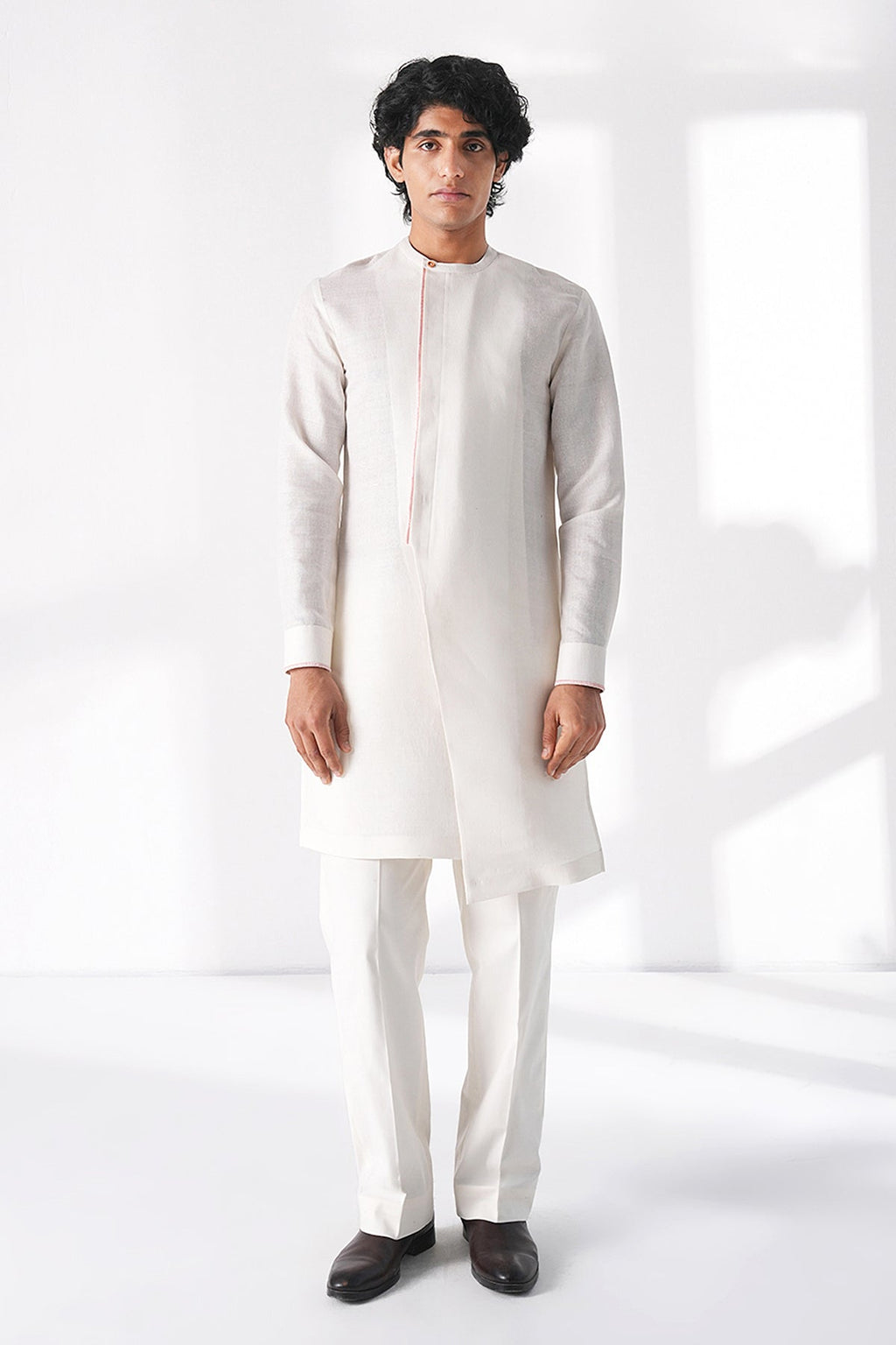 Modern day classic kurta made in premium light matka silk with contrast thread embroidery detailing providing a stylish and versatile option to wear or pair for festive and elevated casual wear.