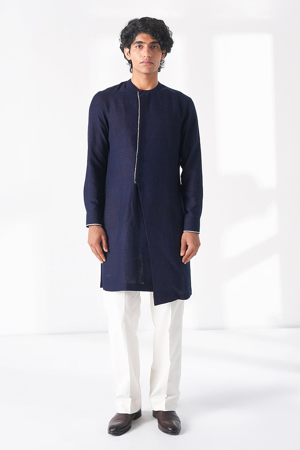 Modern day classic kurta made in premium light matka silk with contrast thread embroidery detailing providing a stylish and versatile option to wear or pair for festive and elevated casual wear.