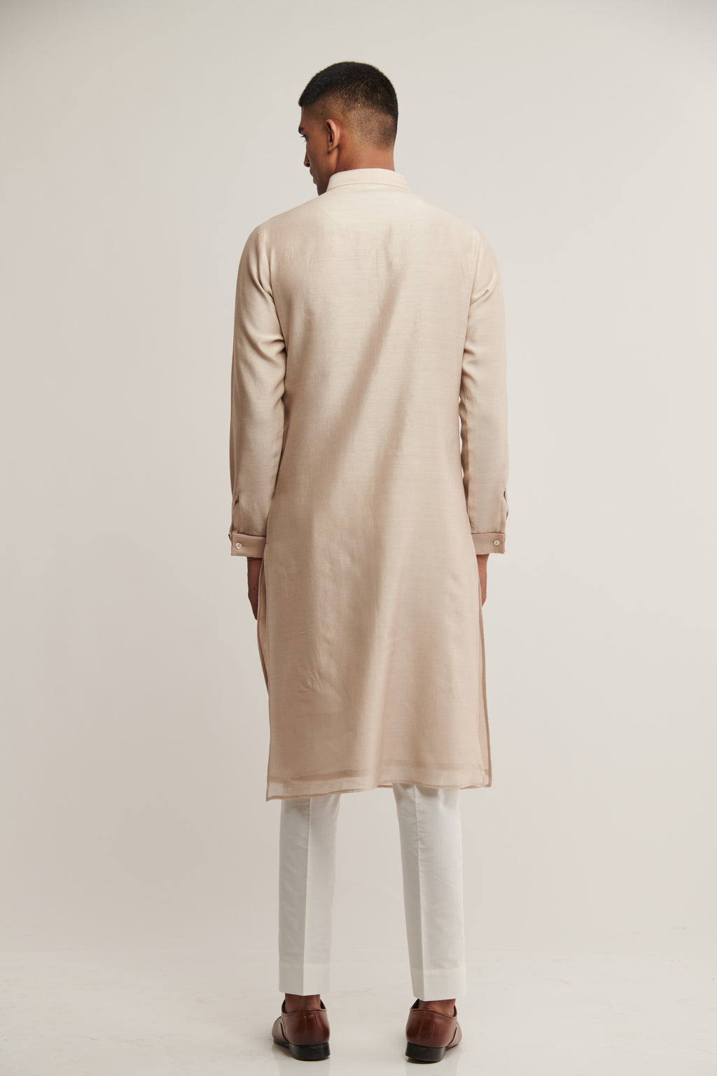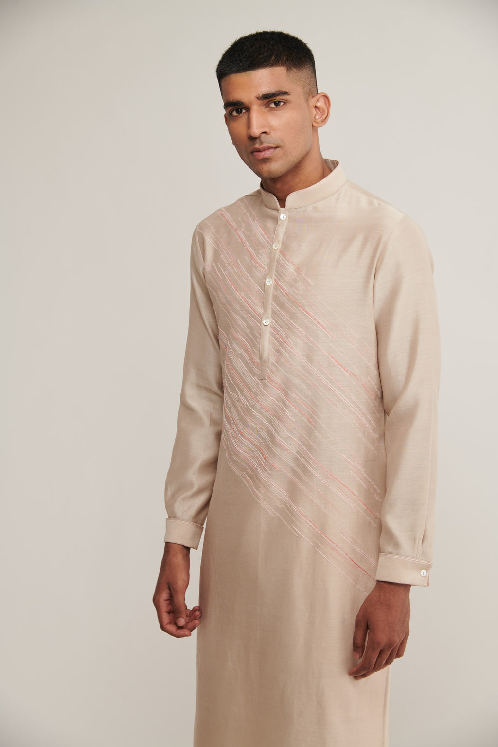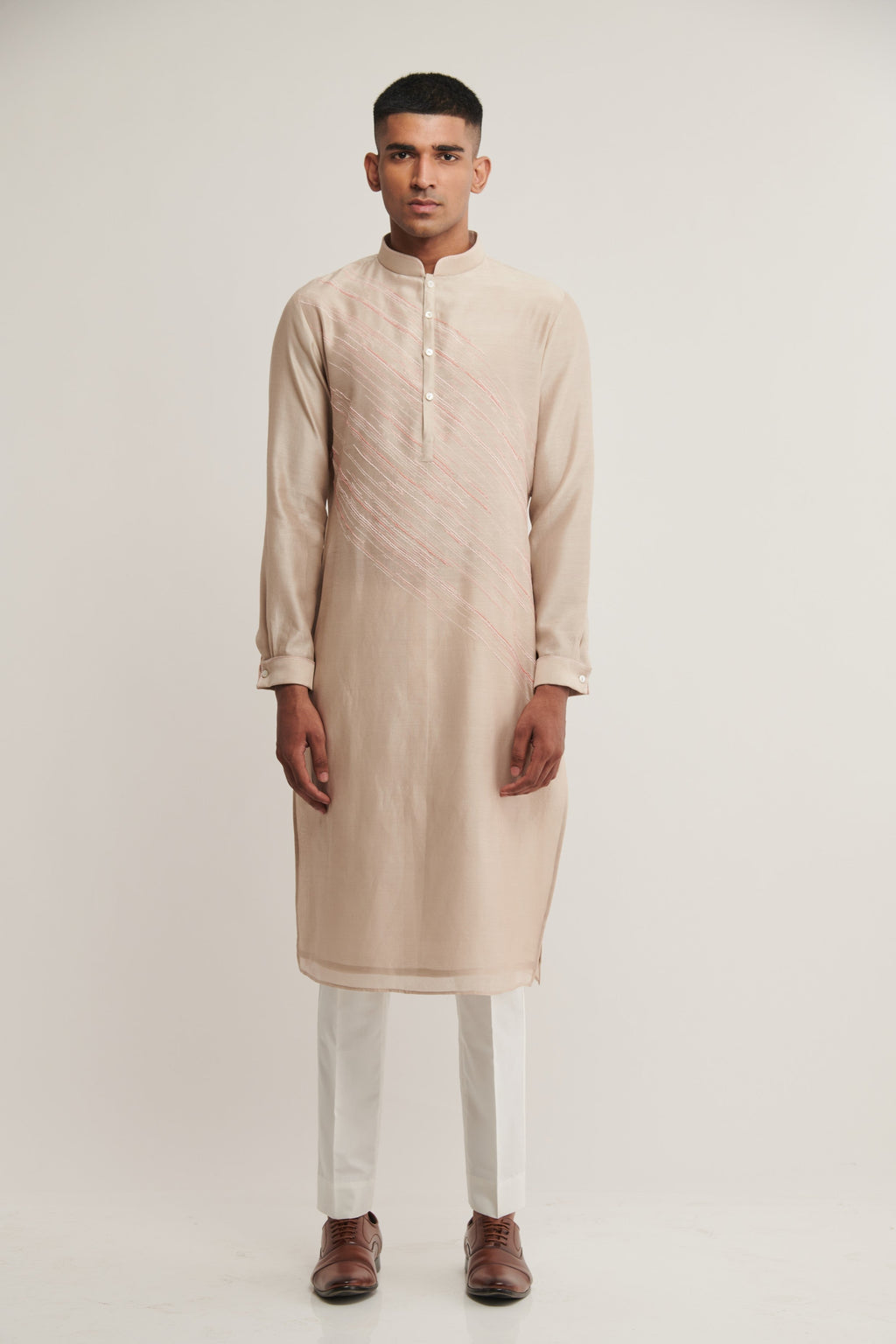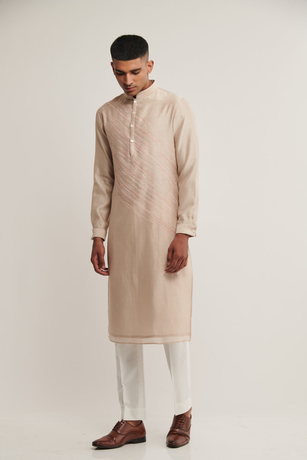 Cotton Silk Chanderi Classic Cut Kurta With Diagonal Thread Embroidery Paired With Churidar.