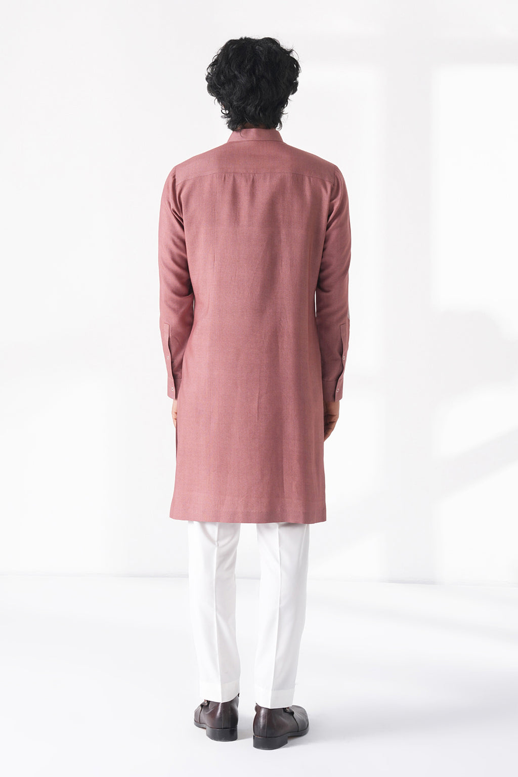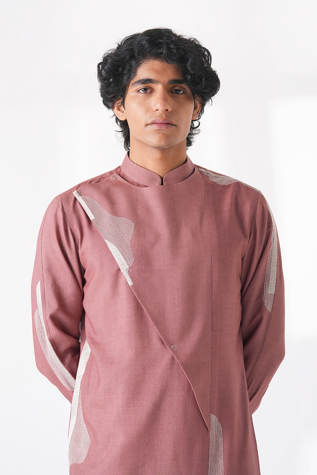 Contermporary kurta crafted from premium cotton silk, featuring intricate embroidery and a contemporary angled placket design, paired with cream pant style pyjama for a sophisticated traditional look.