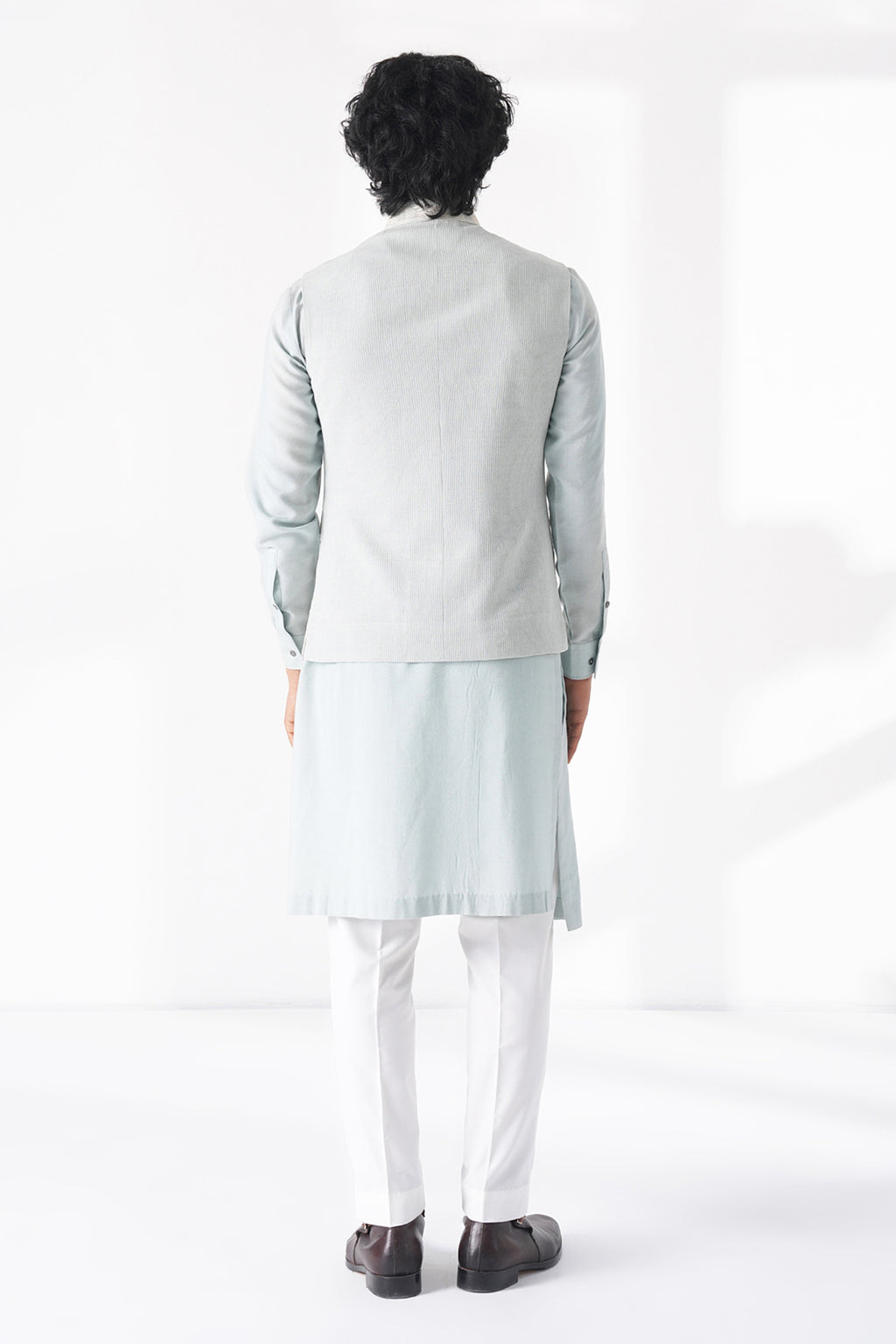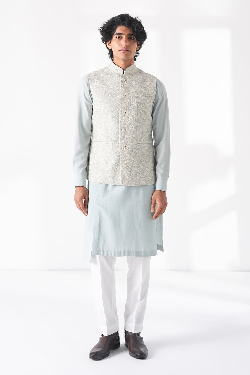 Embroidered Nehru jacket featuring intricate all-over embroidery, a stand collar, and a clean button-front closure. Designed with a classic and timeless silhouette for an elevated festive and formal styling.