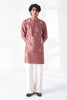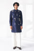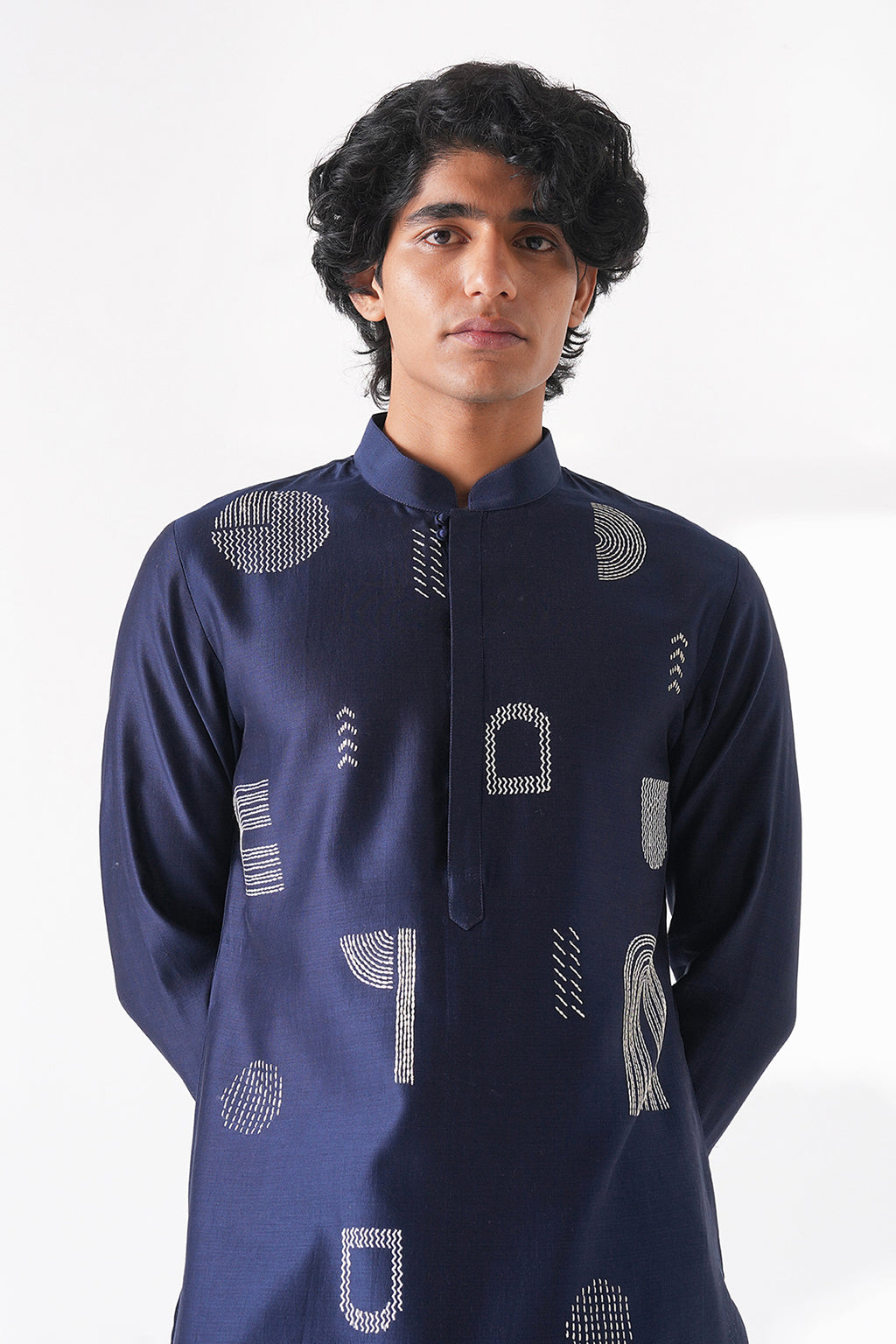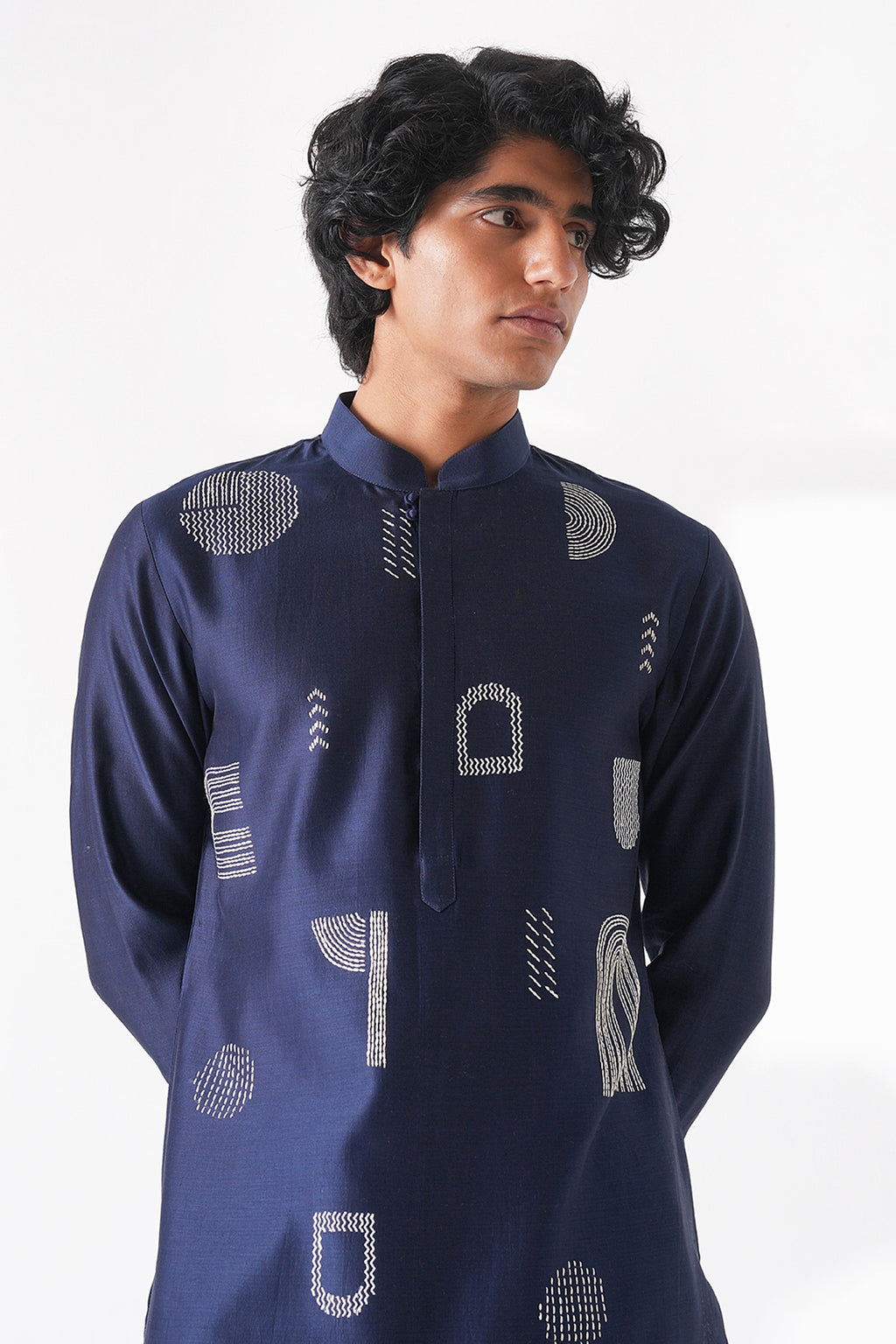 Modern day cotton silk chanderi short kurta featuring bold graphic thread embroidered motif placements , designed with a classic collar and a sleek, streamlined silhouette for a modern statement. It can be paired with wide leg drawstring half elastic trouser, balancing artistic expression with refined simplicity.