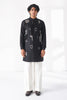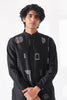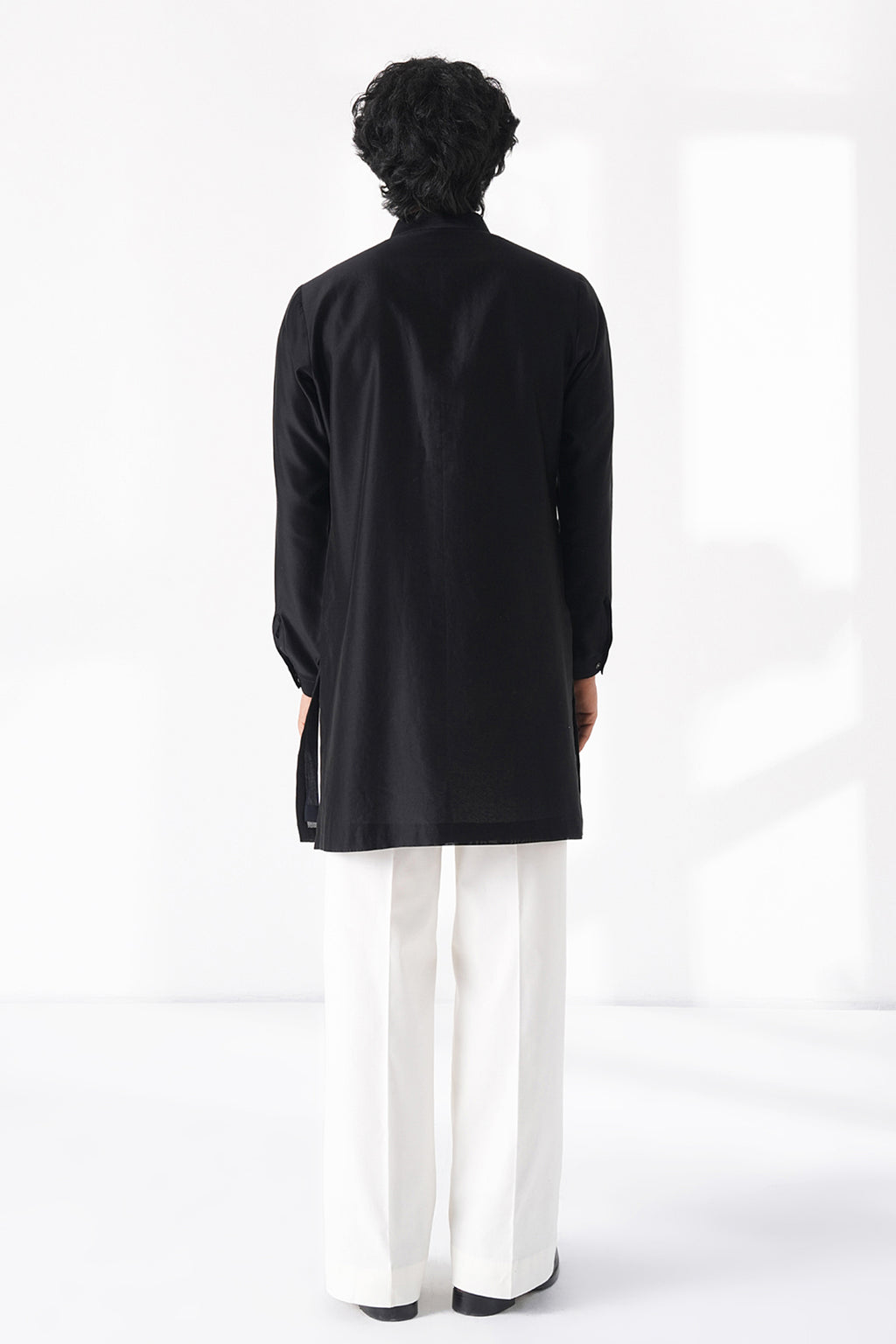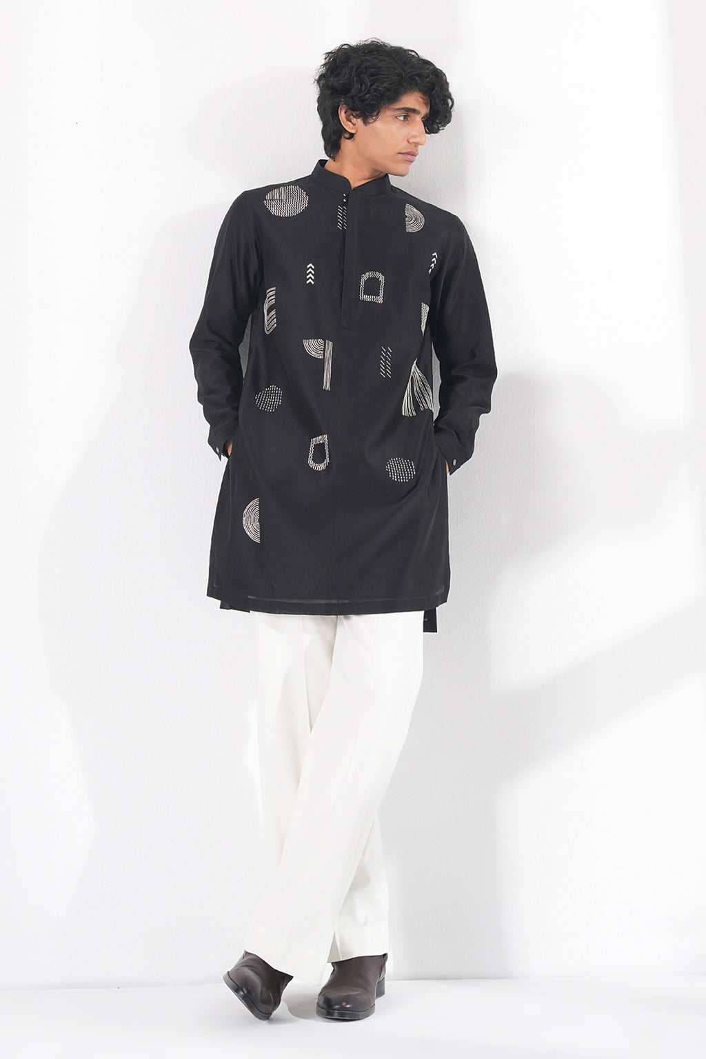 Modern day cotton silk chanderi short kurta featuring bold graphic thread embroidered motif placements , designed with a classic collar and a sleek, streamlined silhouette for a modern statement. It can be paired with wide leg drawstring half elastic trouser, balancing artistic expression with refined simplicity.