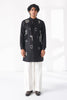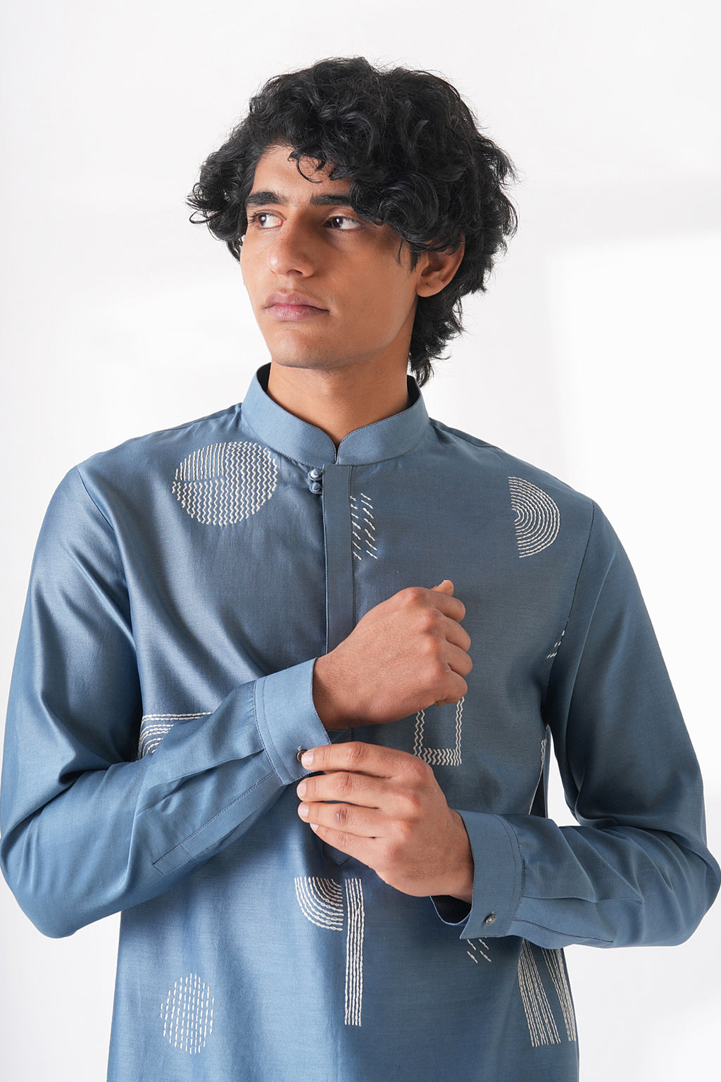 Modern day cotton silk chanderi short kurta featuring bold graphic thread embroidered motif placements , designed with a classic collar and a sleek, streamlined silhouette for a modern statement. It can be paired with wide leg drawstring half elastic trouser, balancing artistic expression with refined simplicity.