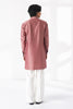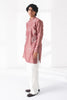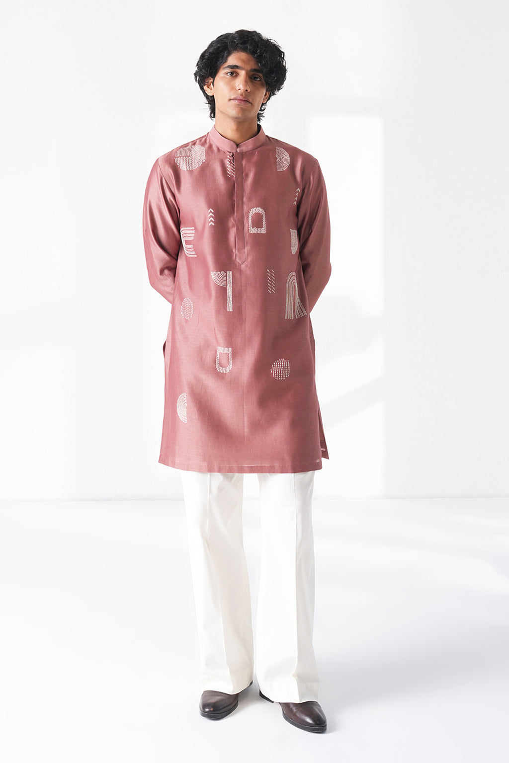 Modern day cotton silk chanderi short kurta featuring bold graphic thread embroidered motif placements , designed with a classic collar and a sleek, streamlined silhouette for a modern statement. It can be paired with wide leg drawstring half elastic trouser, balancing artistic expression with refined simplicity.