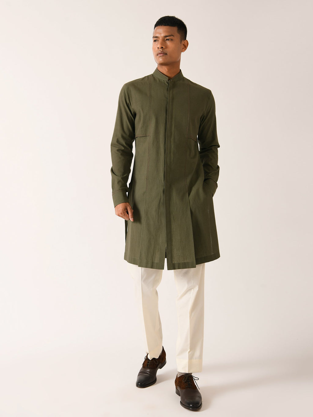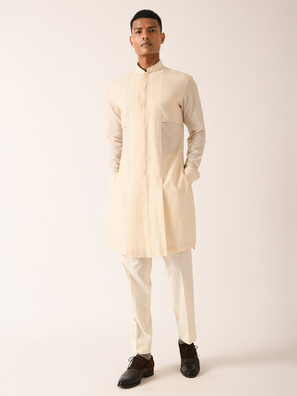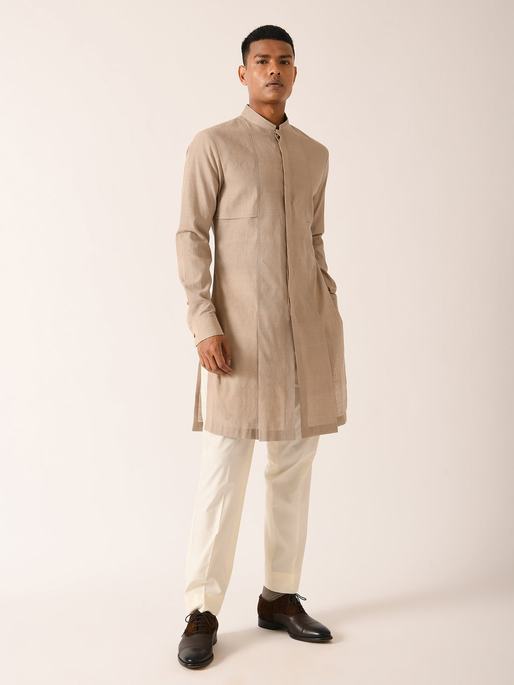 Versatile Double Flap Kurta Paired With Pant Cut Pyjama In Handloom Cotton