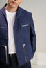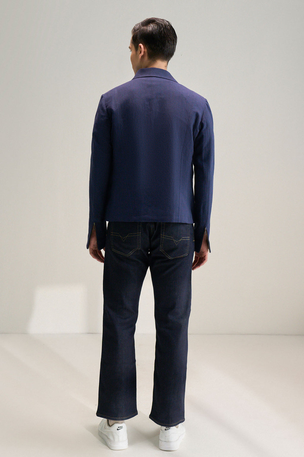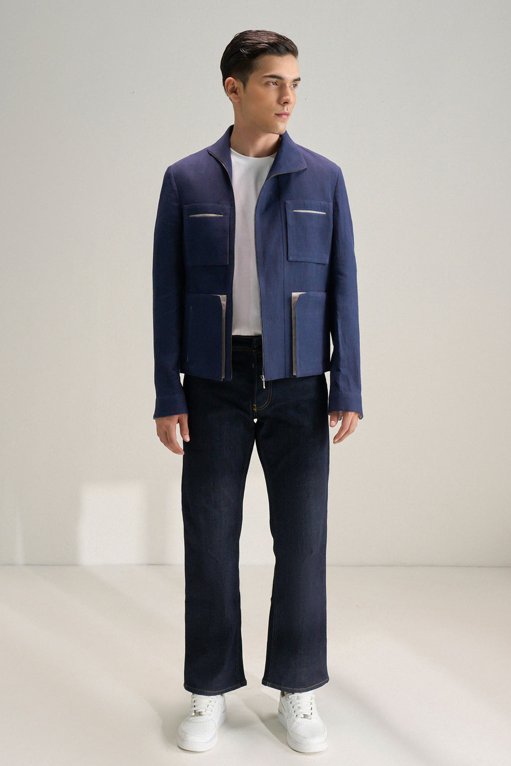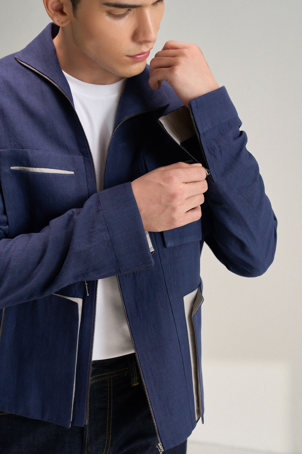 A modern utility jacket in handloom cotton linen designed with multiple pockets with contrast detailing and a structured silhouette, combining functionality with contemporary urban appeal.
