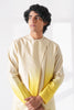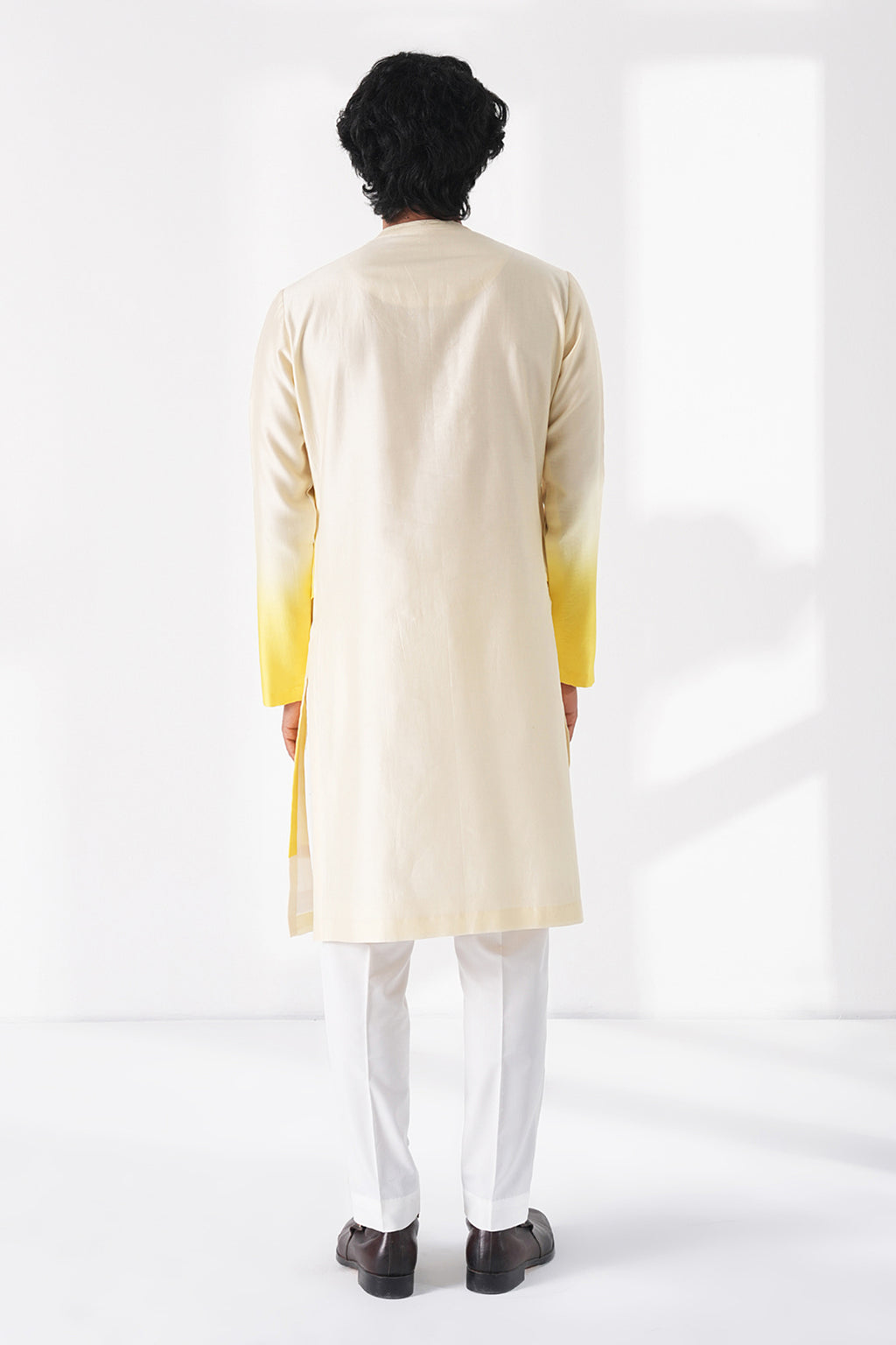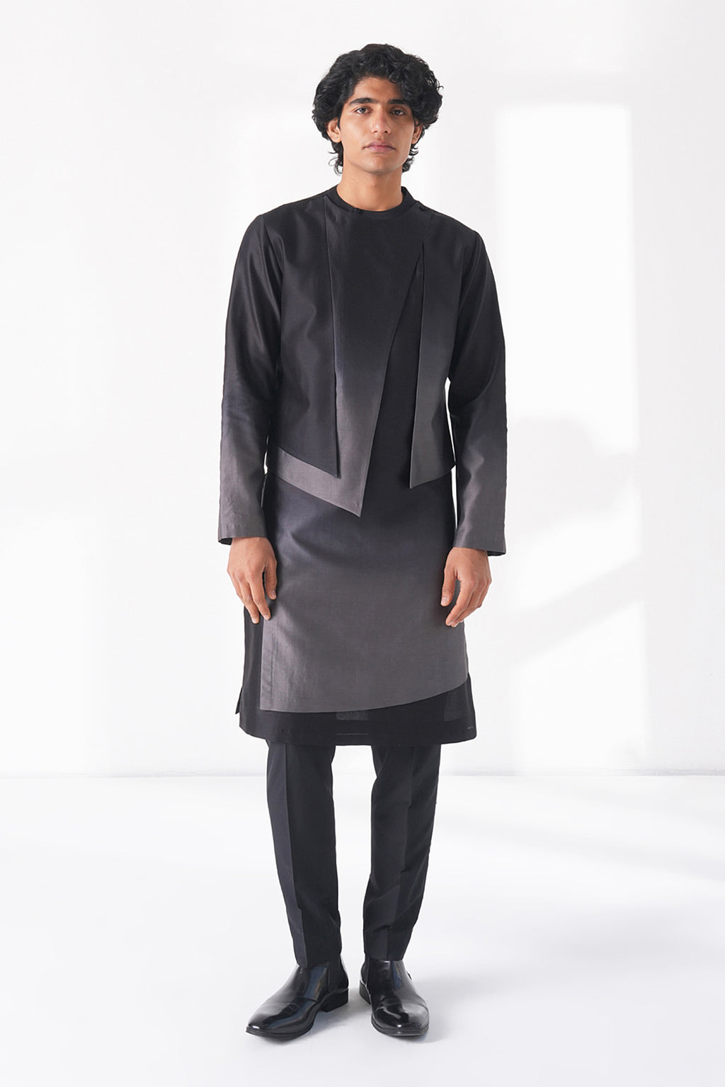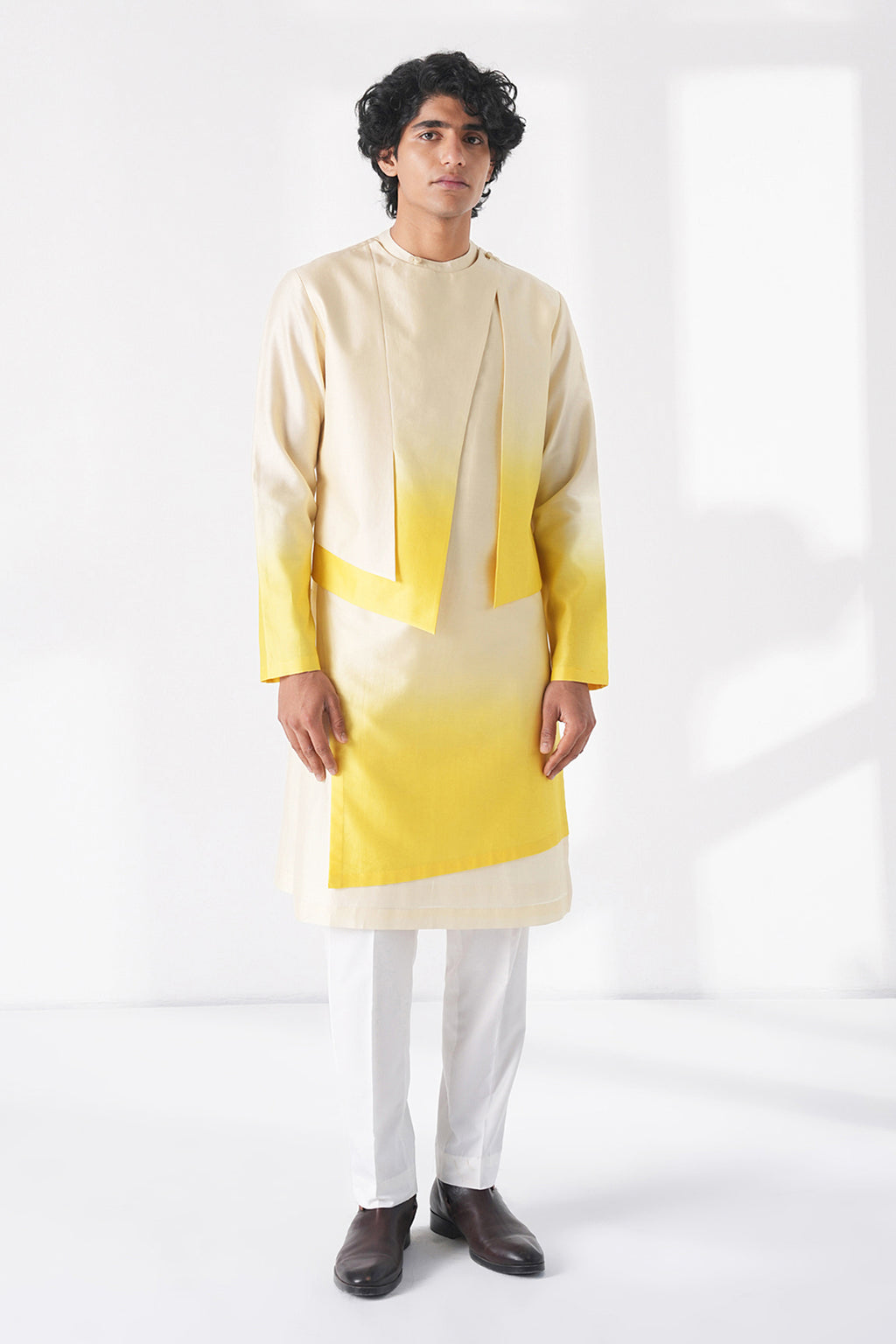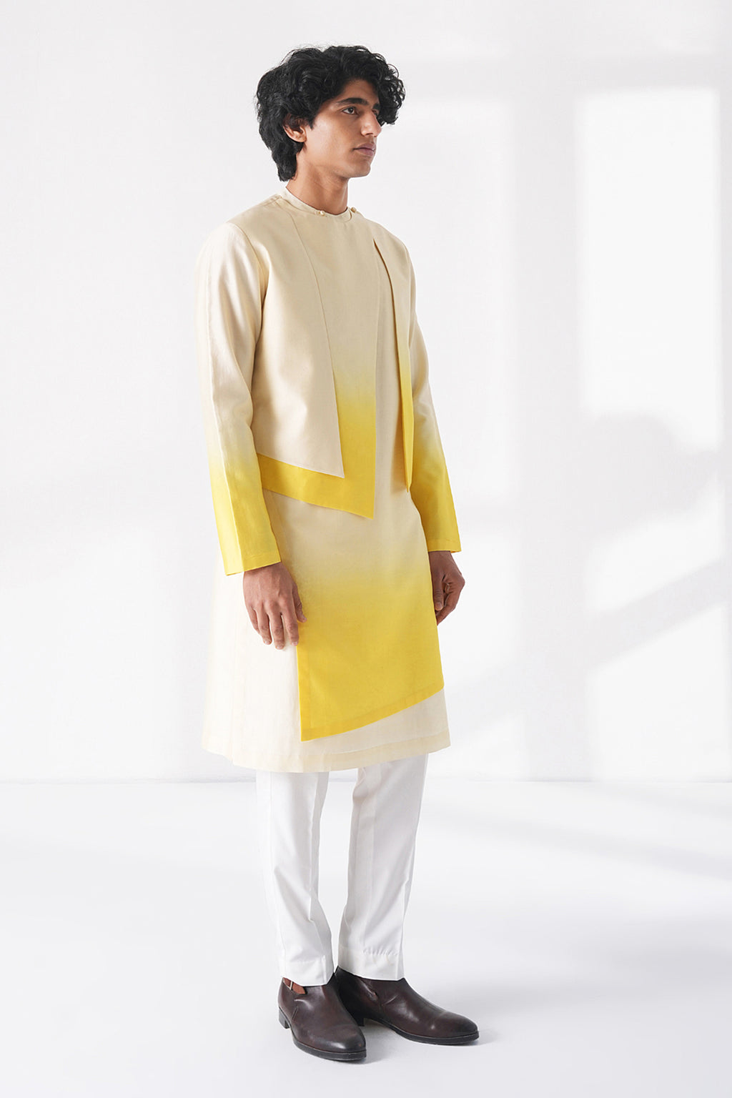 Contemporary chanderi kurta set featuring a striking brown ombre effect with an asymmetrical layered overlay and clean, minimalist cut offering modern twist with artistic flair. It is paird with cream pant style pyjama.