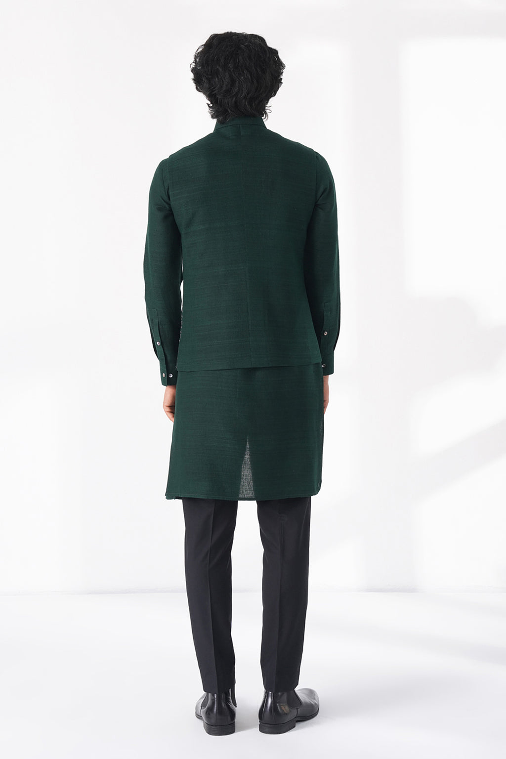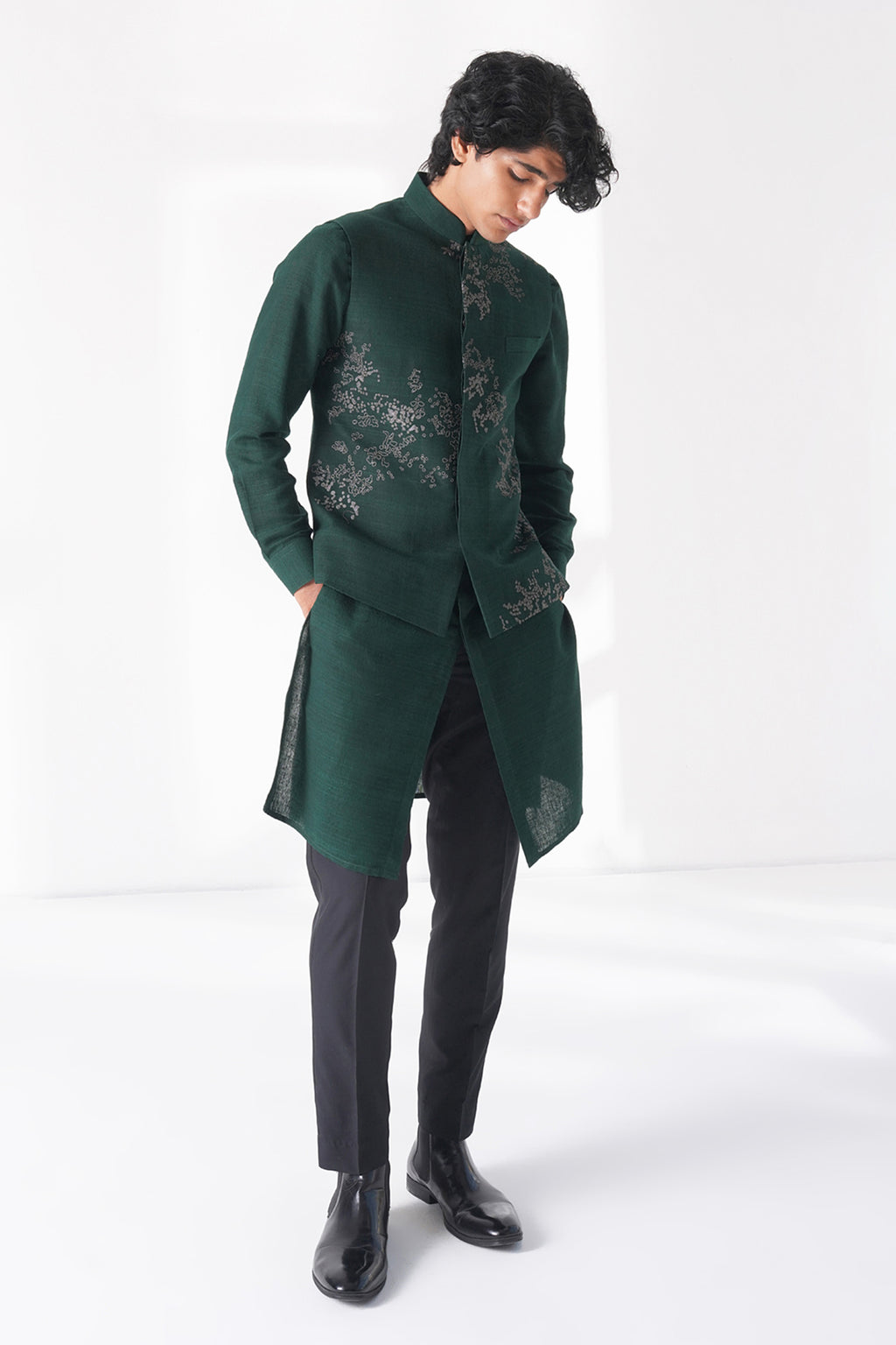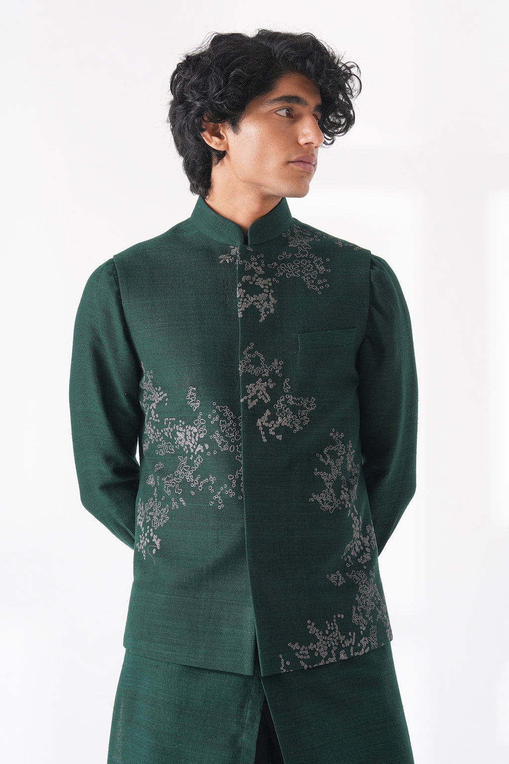 Elegant and classic jawahar jacket in premium silk with contemporary placement embroidery and concealed placket perfect for a minimal statement look.