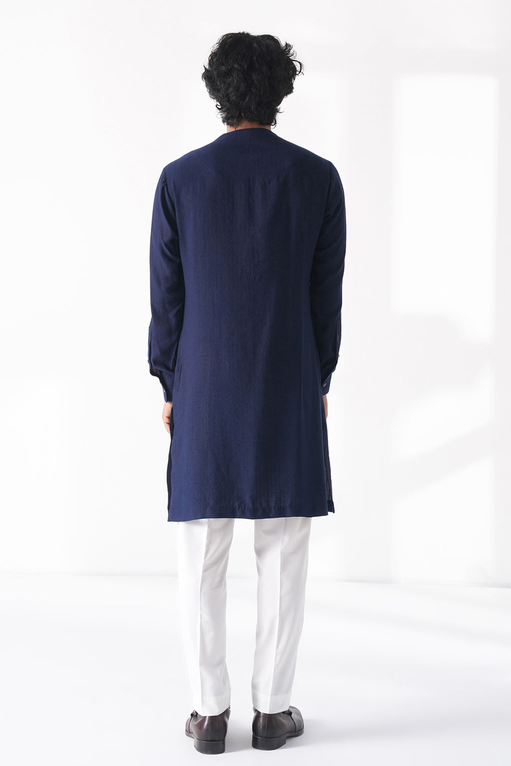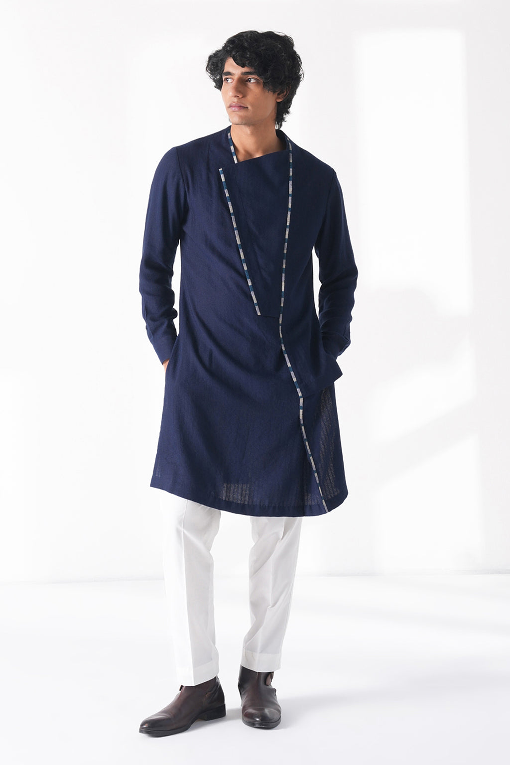 Contemporary textured cotton silk kurta with multiple panels and contrasting hem embroidery paired with cream pant style pyjama that blends modern design with traditional craftsmanship.