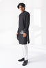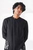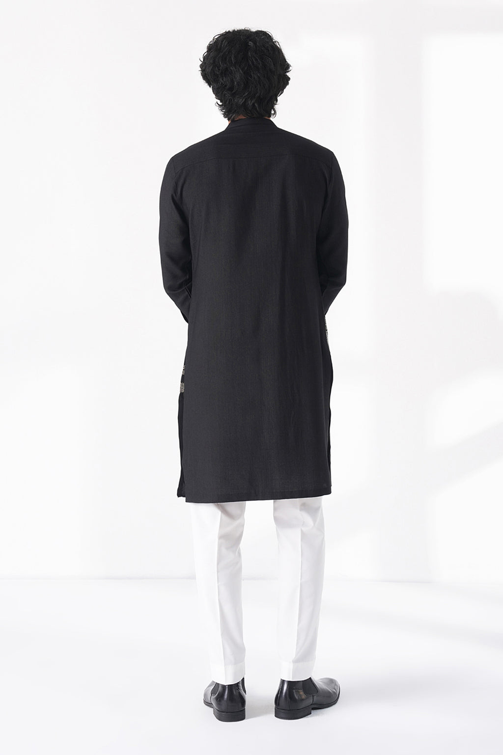 Contemporary cotton silk kurta set featuring a city skyline motif thread embroidery border with an asymmetrical layered overlay and clean, minimalist cut offering modern twist with artistic flair. It is paird with cream pant style pyjama.