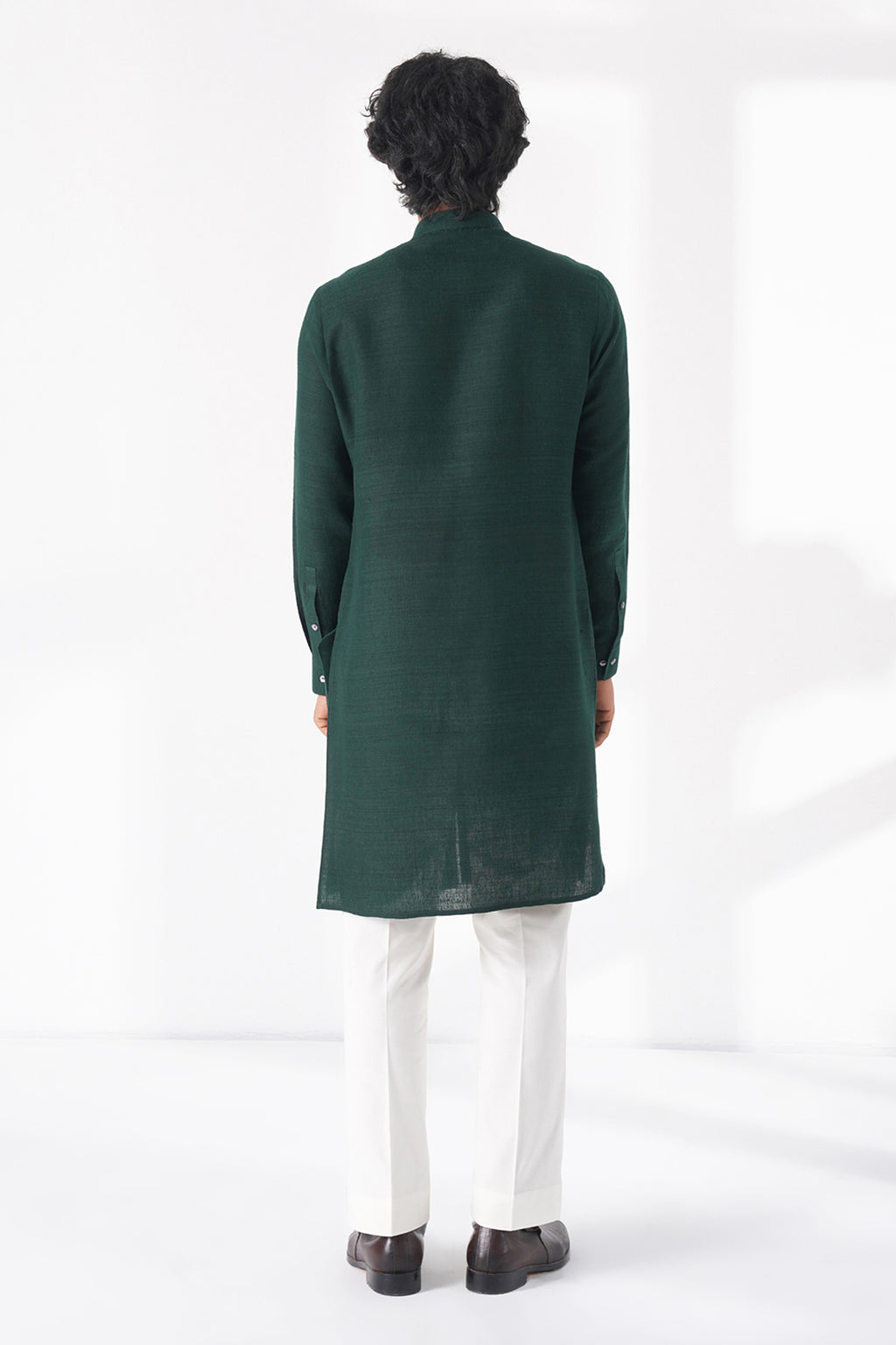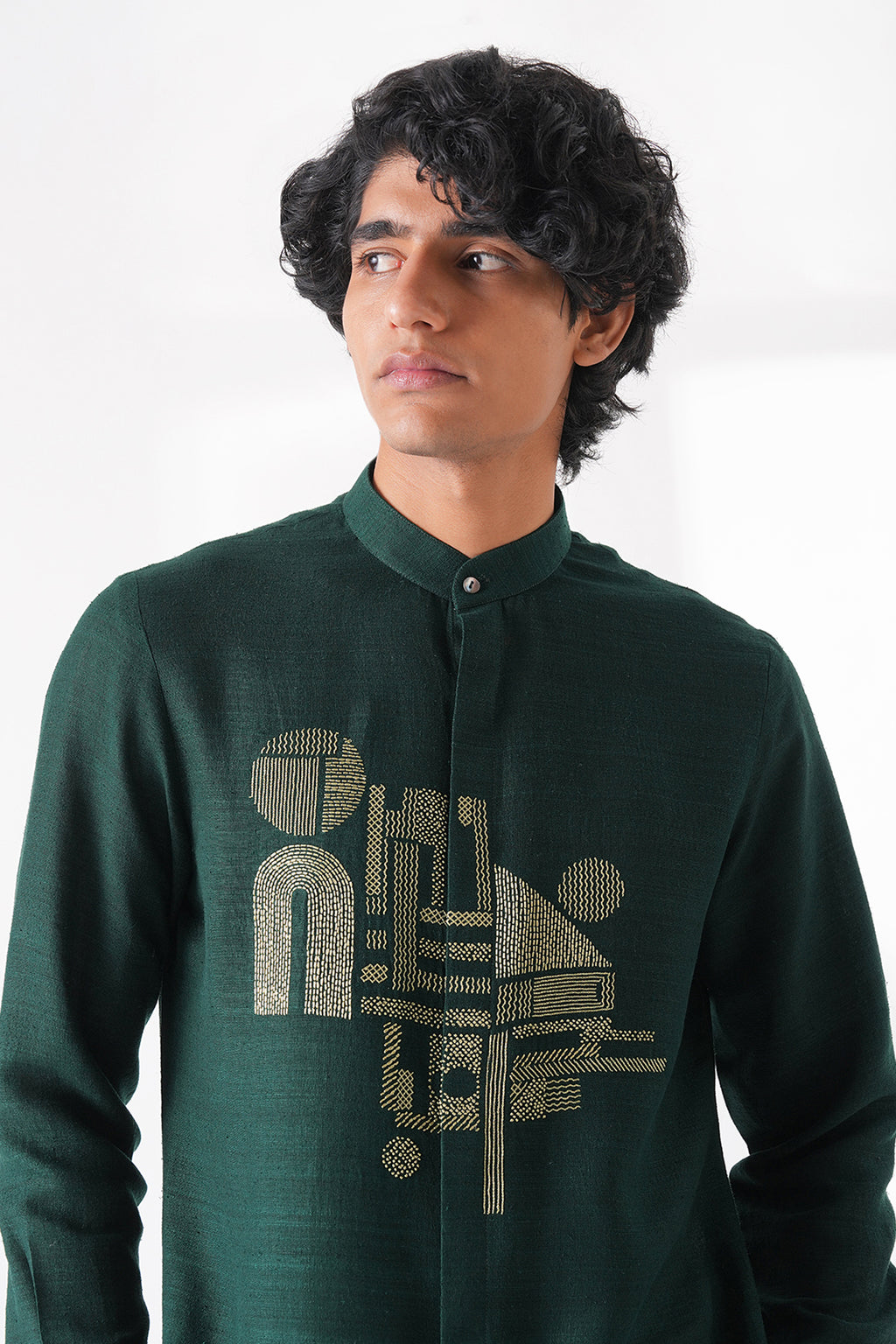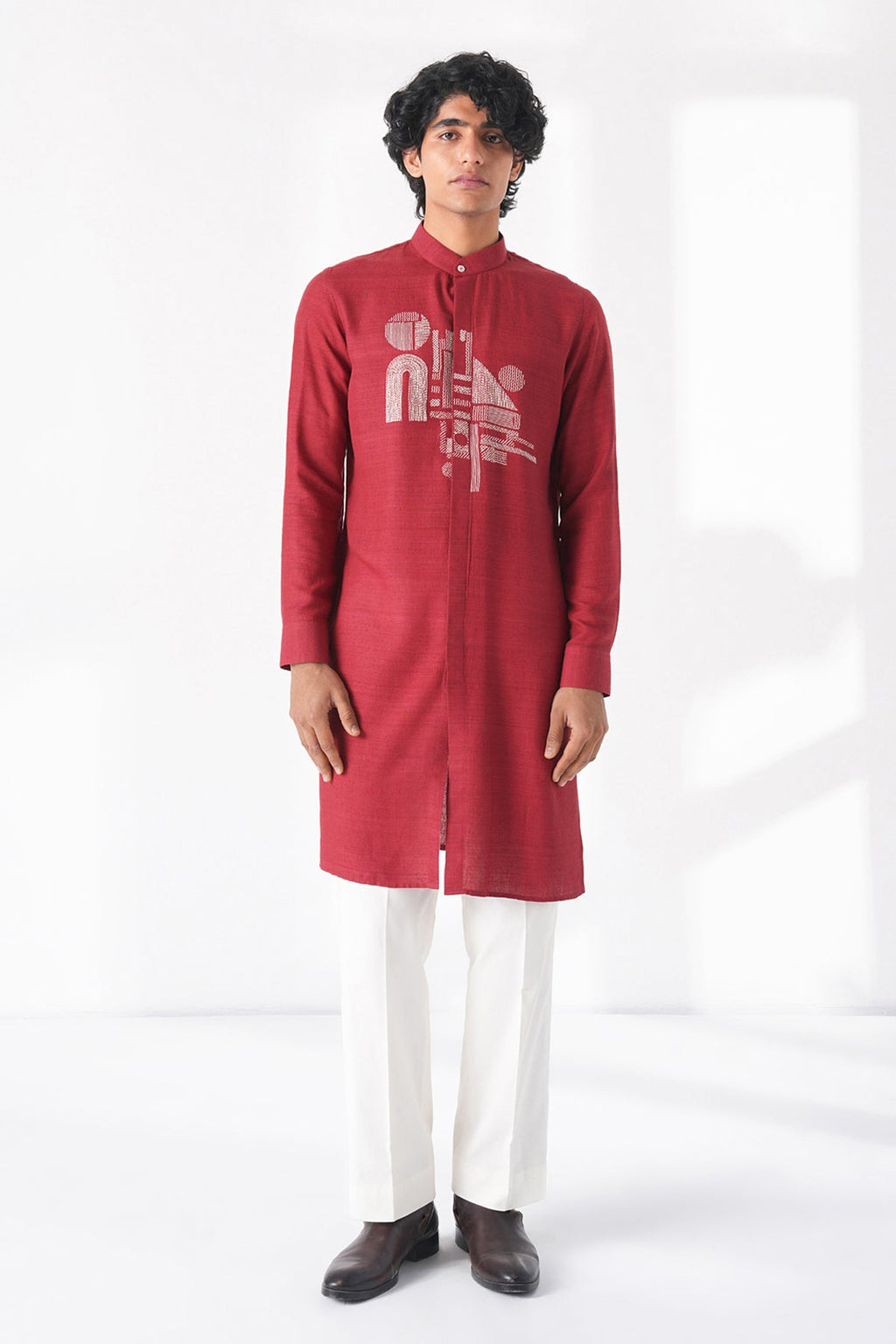 Elegant light matka silk front open kurta featuring a statement chest embroidery motif with a classic collar and clean, minimalist cut, offering a modern twist with artistic flair. It is paired with pant-style pyjama for a refined, contemporary look.