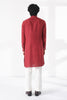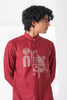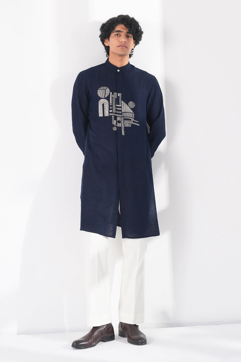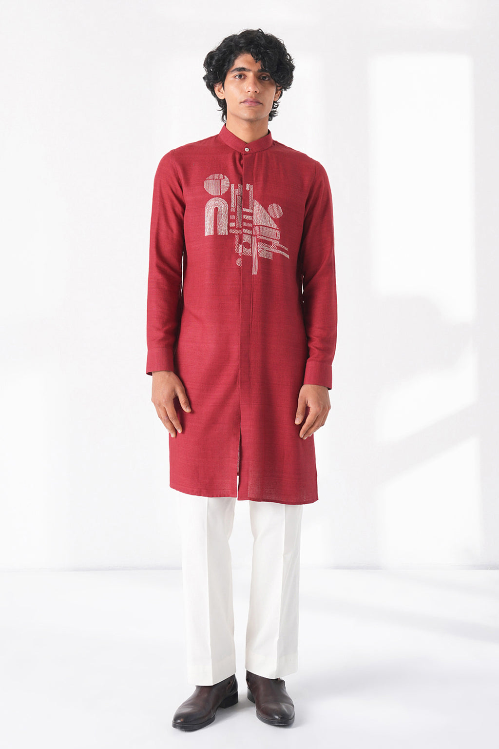 Elegant light matka silk front open kurta featuring a statement chest embroidery motif with a classic collar and clean, minimalist cut, offering a modern twist with artistic flair. It is paired with pant-style pyjama for a refined, contemporary look.